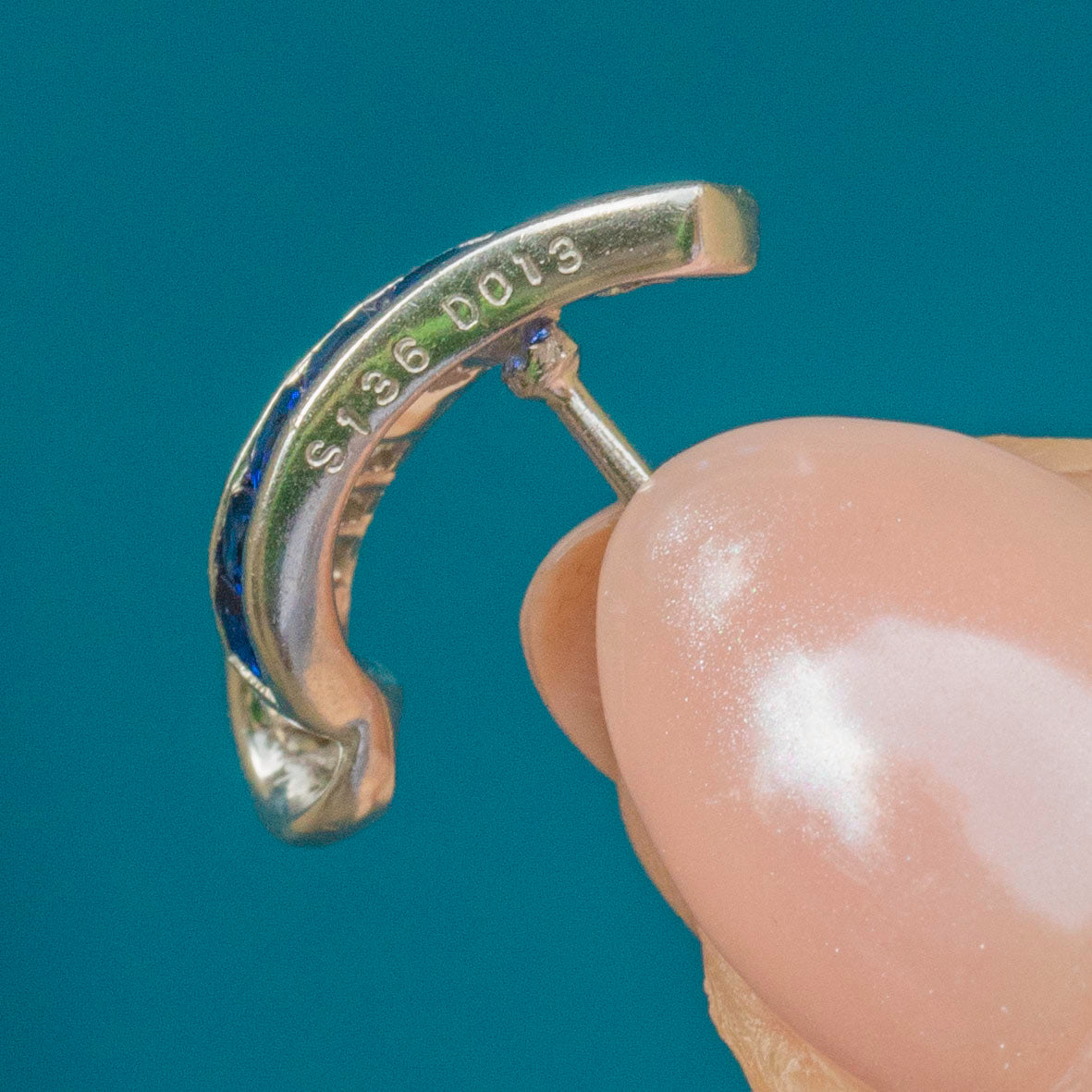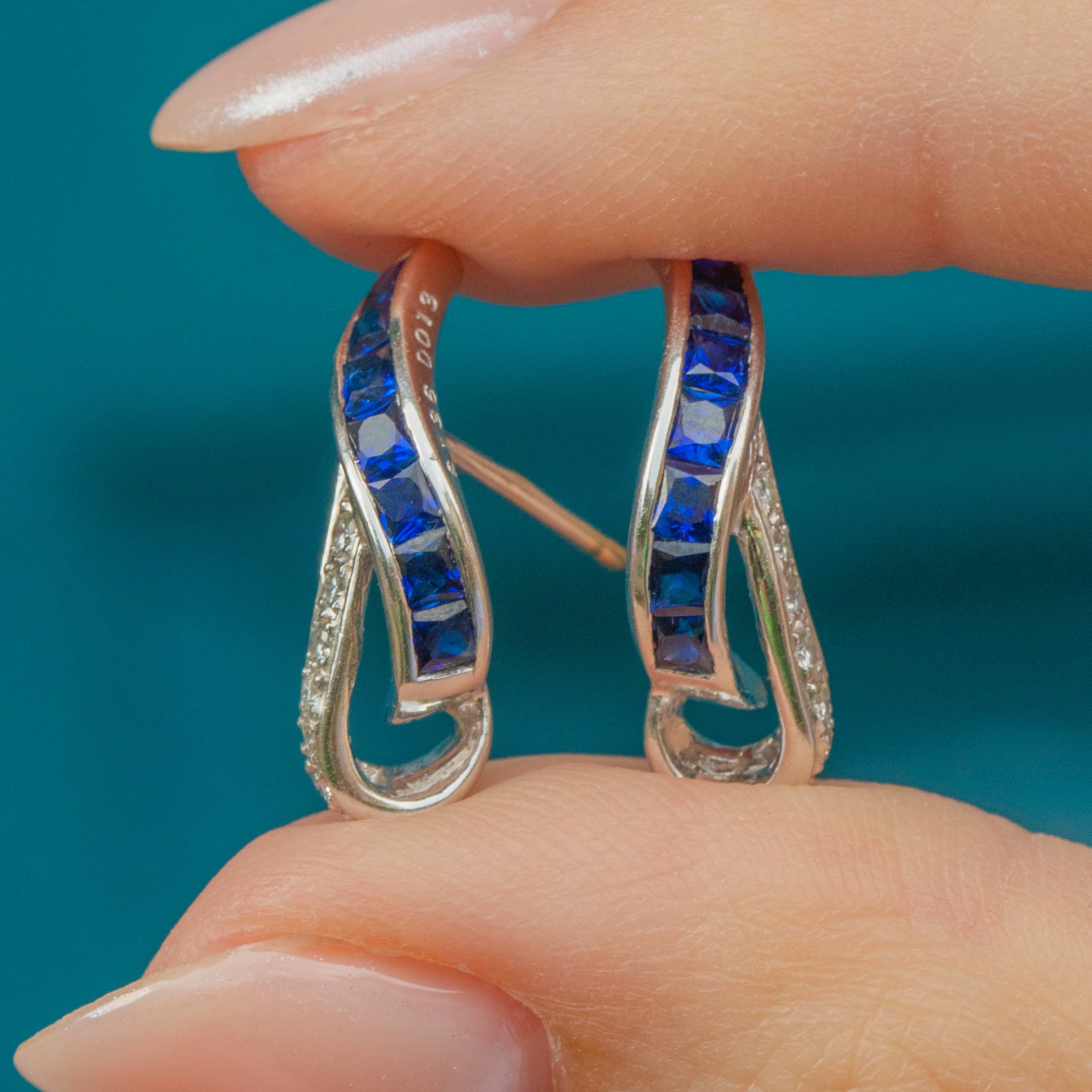 VERY GOOD-EXCELLENT. These 18ct white Gold Sapphire Diamond twist earrings are in wonderful condition! Aside from the hallmarks being slightly worn on the ear posts, there is nothing to report; they are ready to wear straight from your pink Lillicoco box!