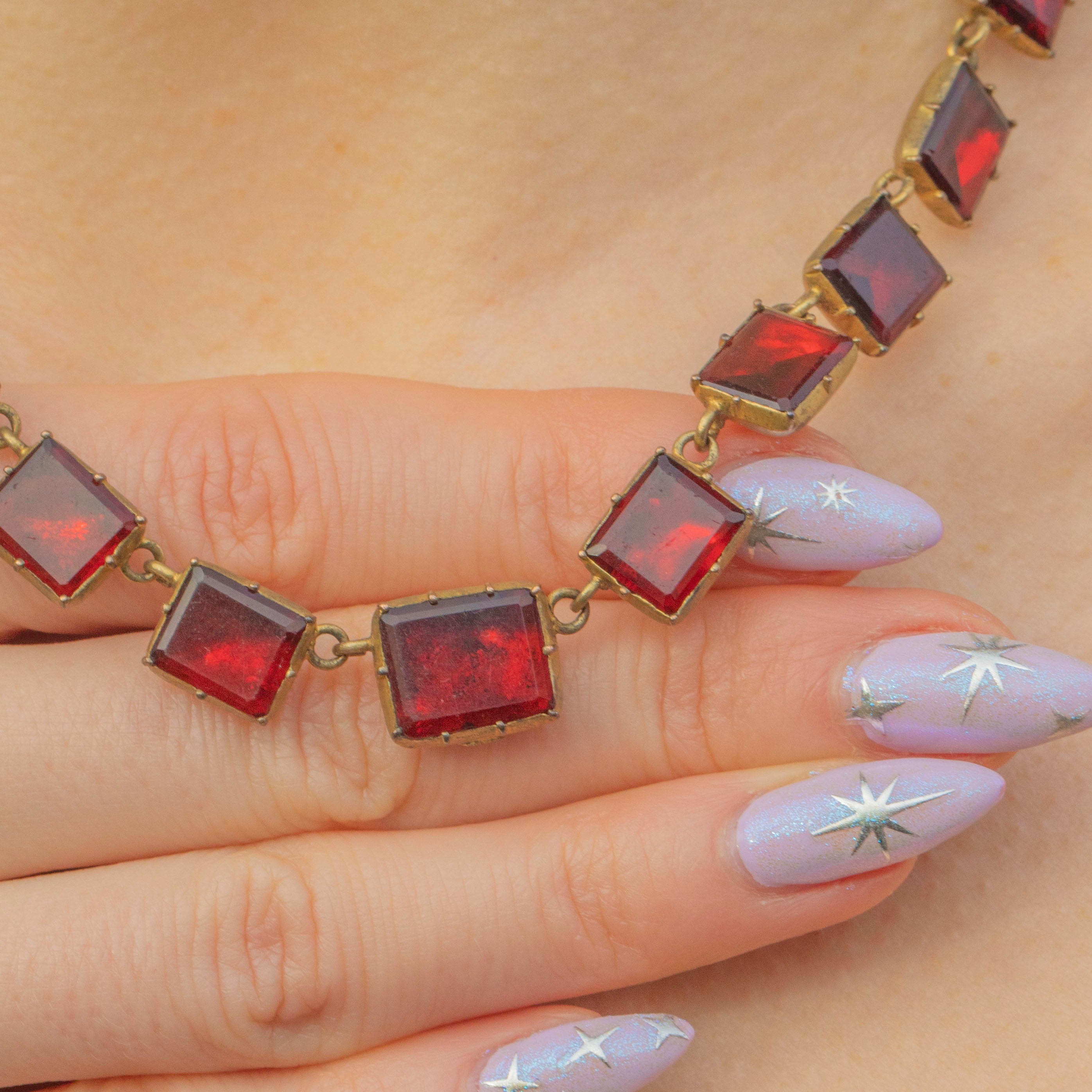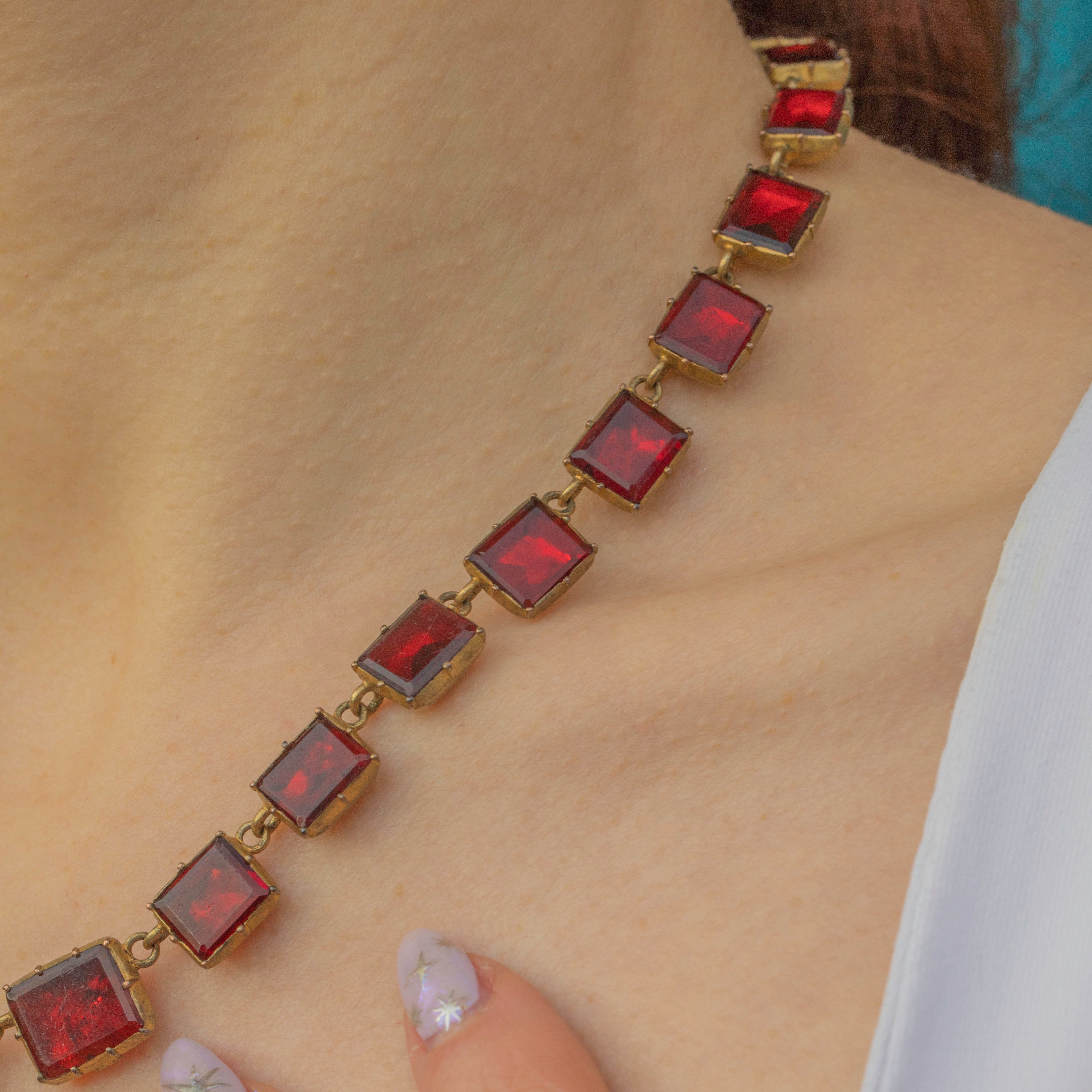 This 18th Century Georgian red Paste Riviere necklace is a glorious testimony to the era from which she was created! Each masterfully cut Paste gemstone holds the key to our hearts, with their the deep red tones, sultry and seductive, shimmering beautifully as they catch the light!