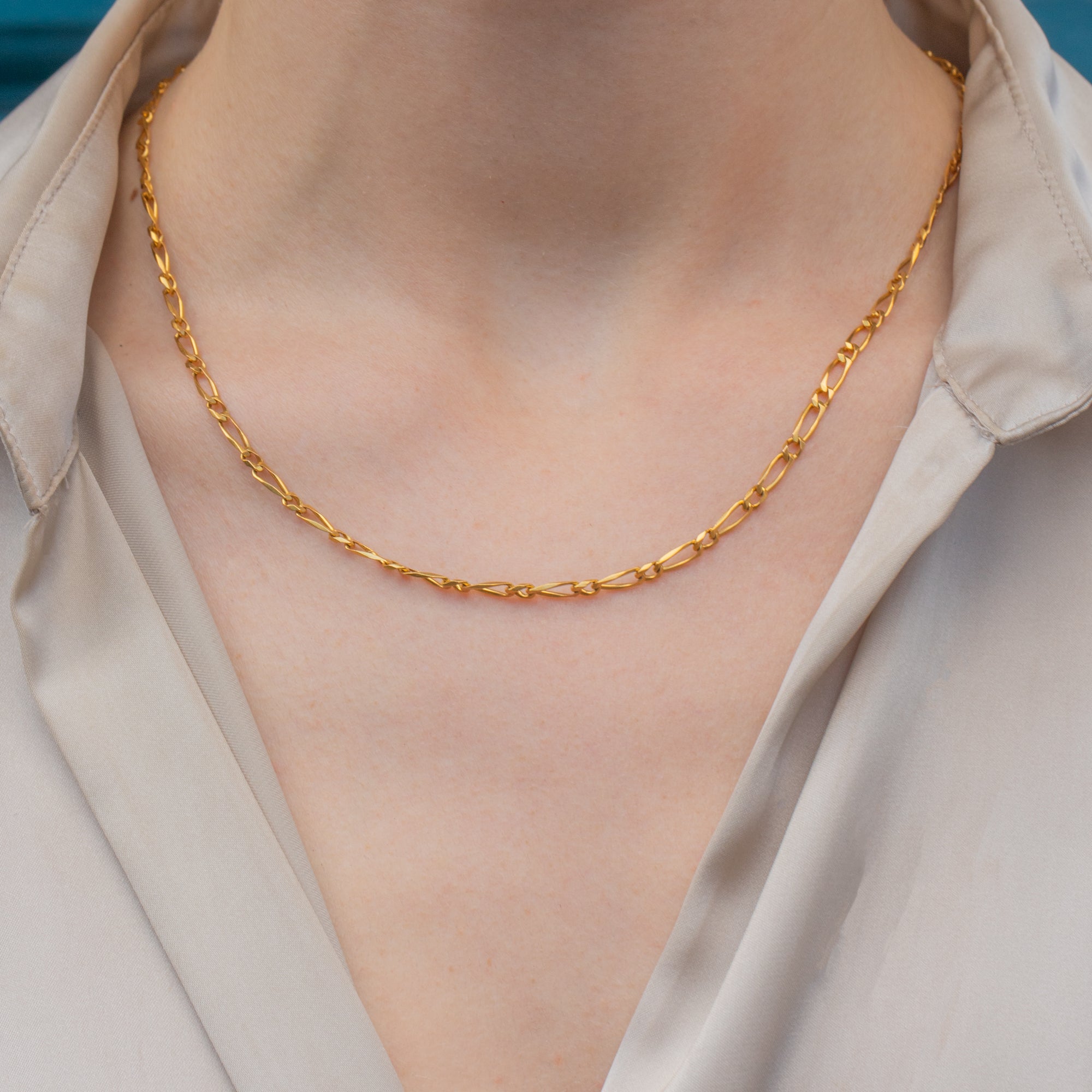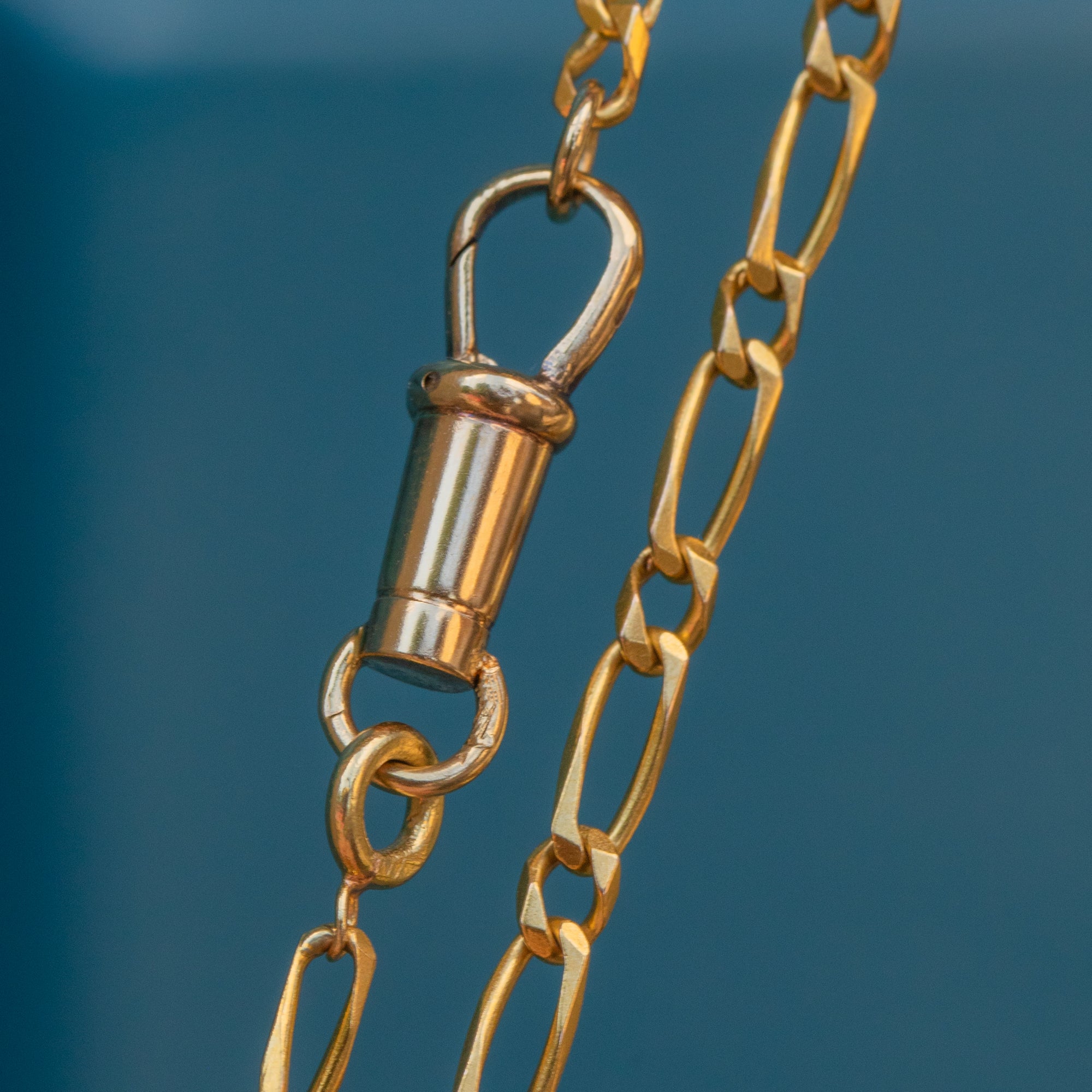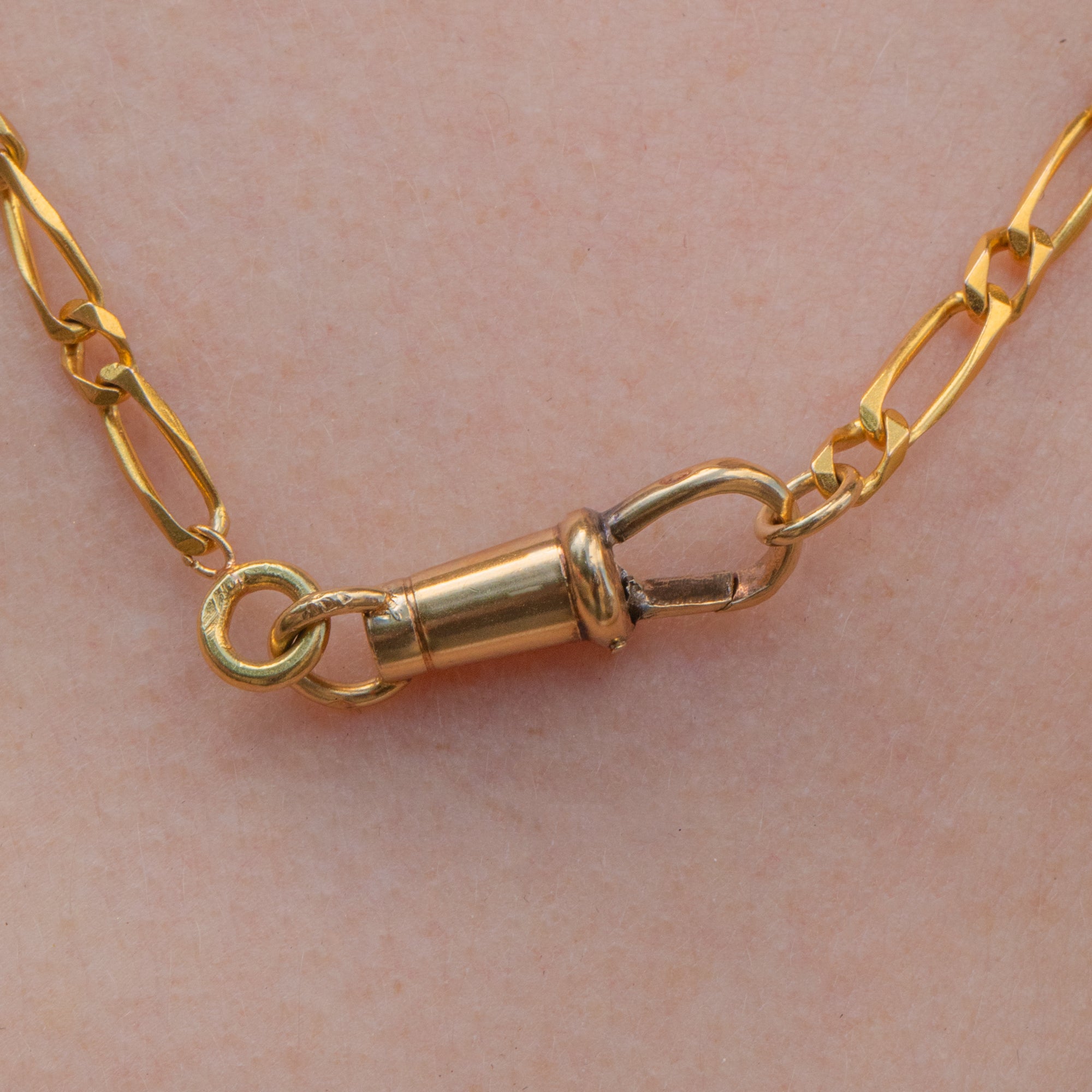 EXCELLENT. This 19" antique 18ct Gold French Figaro chain is in excellent condition! The links are uniform and perfectly rest against one another, with no damage to the Gold to note. The dog-clip is in perfect working order allowing you to wear with confidence!