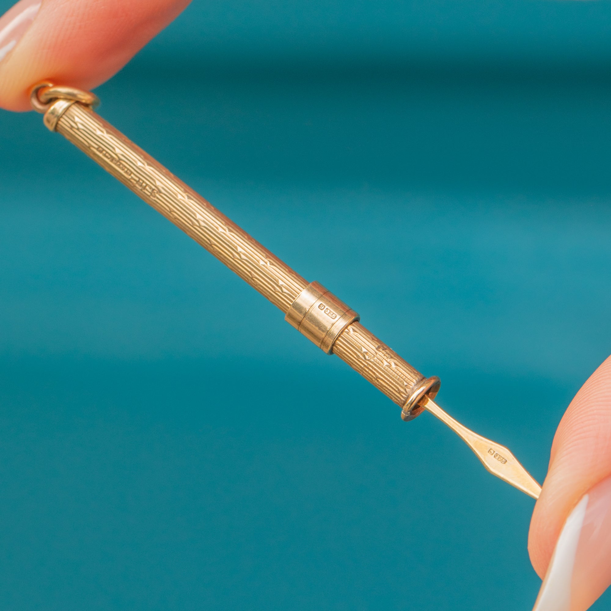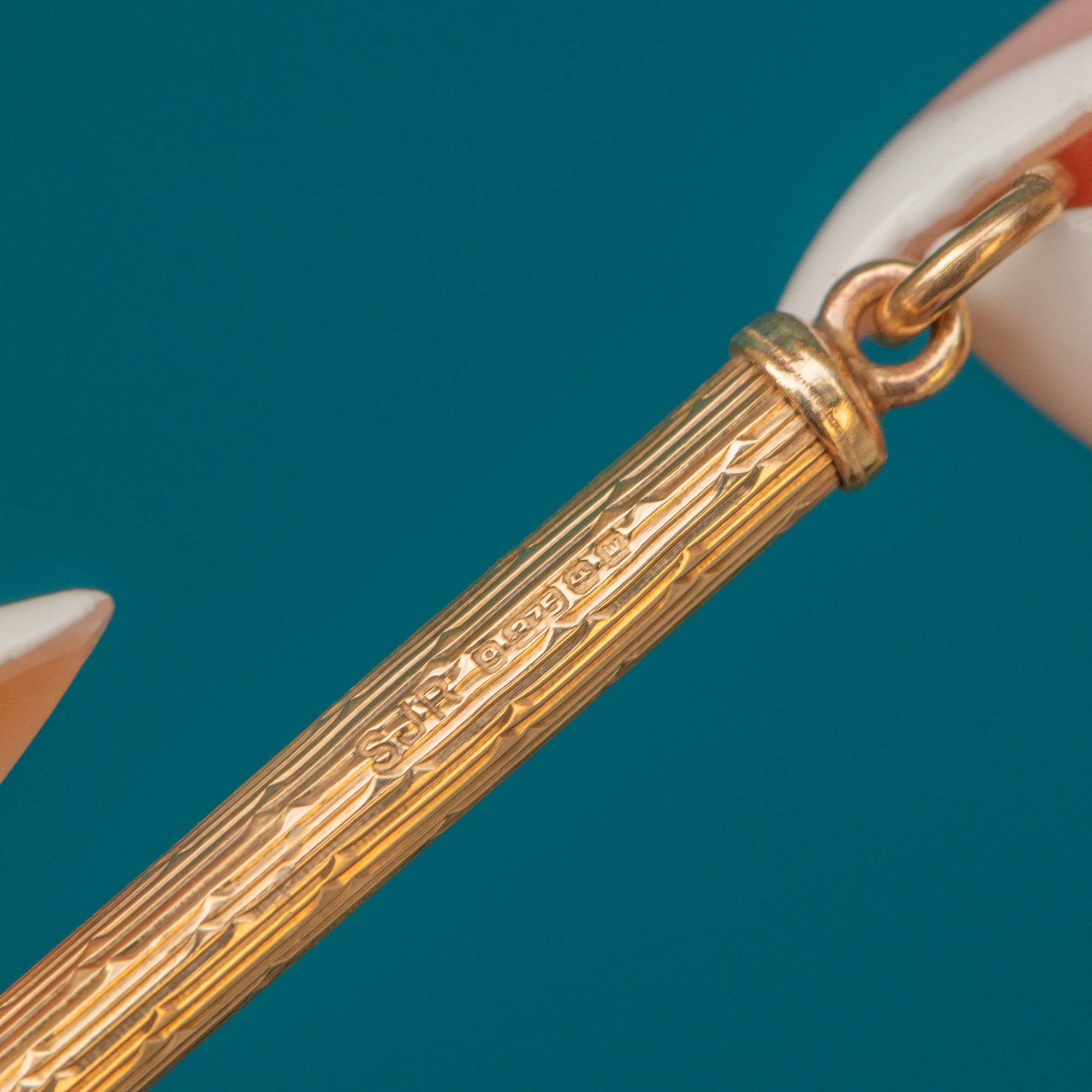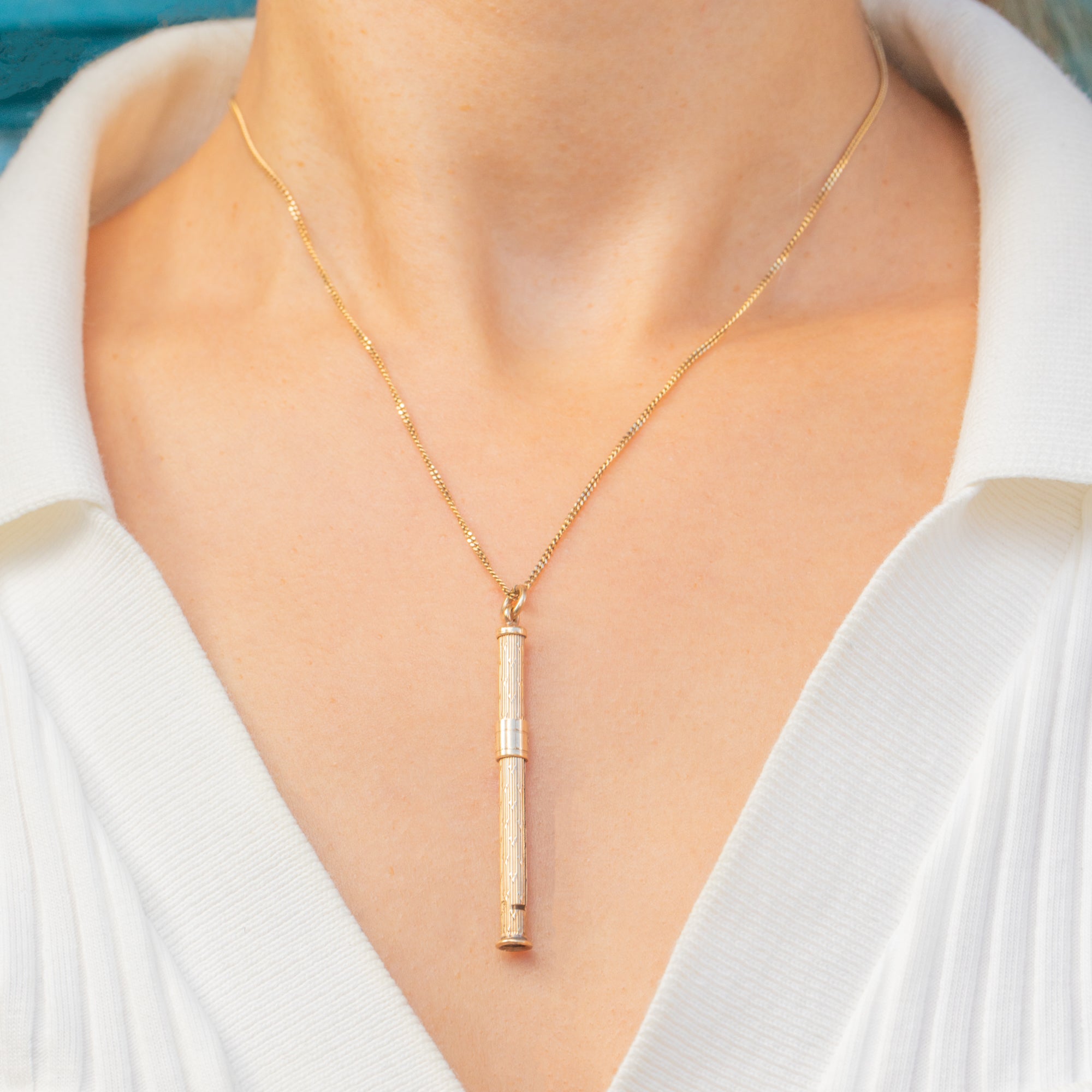 A sleek and satisfyingly engineered vintage 9ct Gold telescopic pick pendant with fine engine-turned detail and a neat slider. It wears like a chic baton charm and, when opened, reveals a retractable pick—perfect as a clever conversation piece on your chain or charm bracelet.