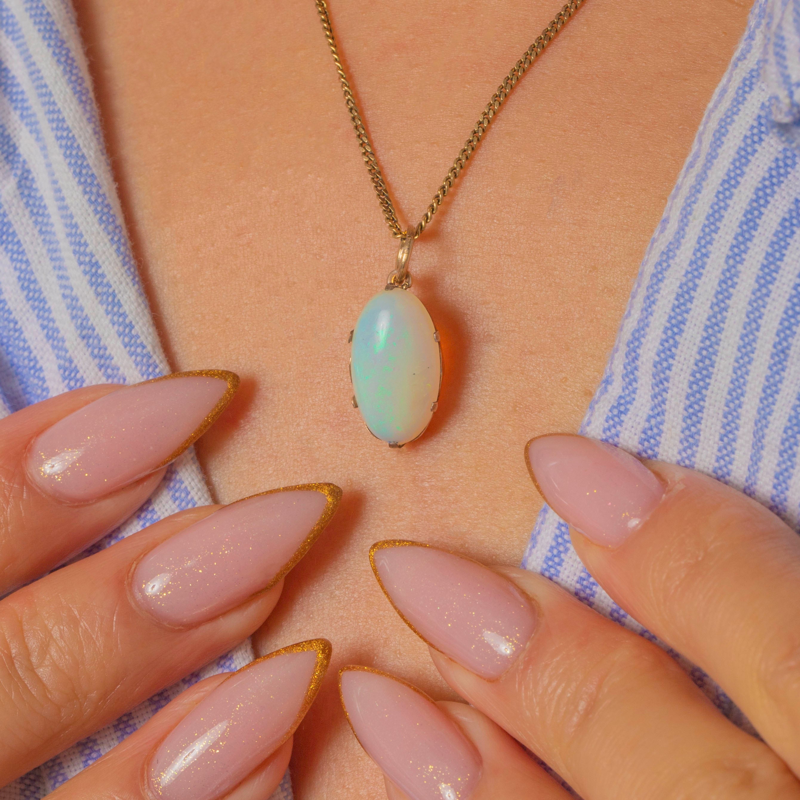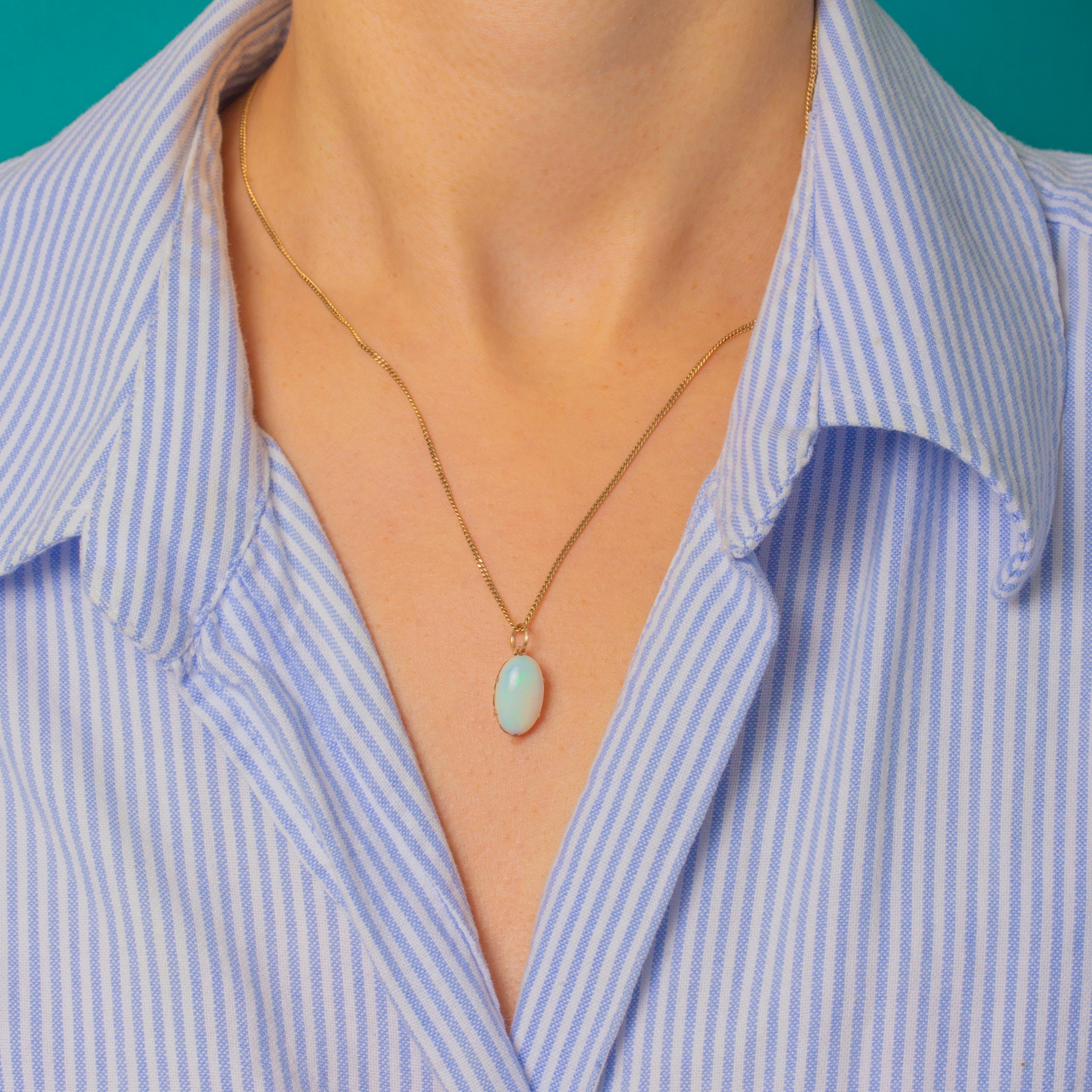 This stunning Art Deco Opal charm radiates with luminous, multicoloured fire. The natural solid 2.30ct Opal shimmers with vibrant flashes of green, pink, orange and blue, creating a mesmerising display of colour and light.