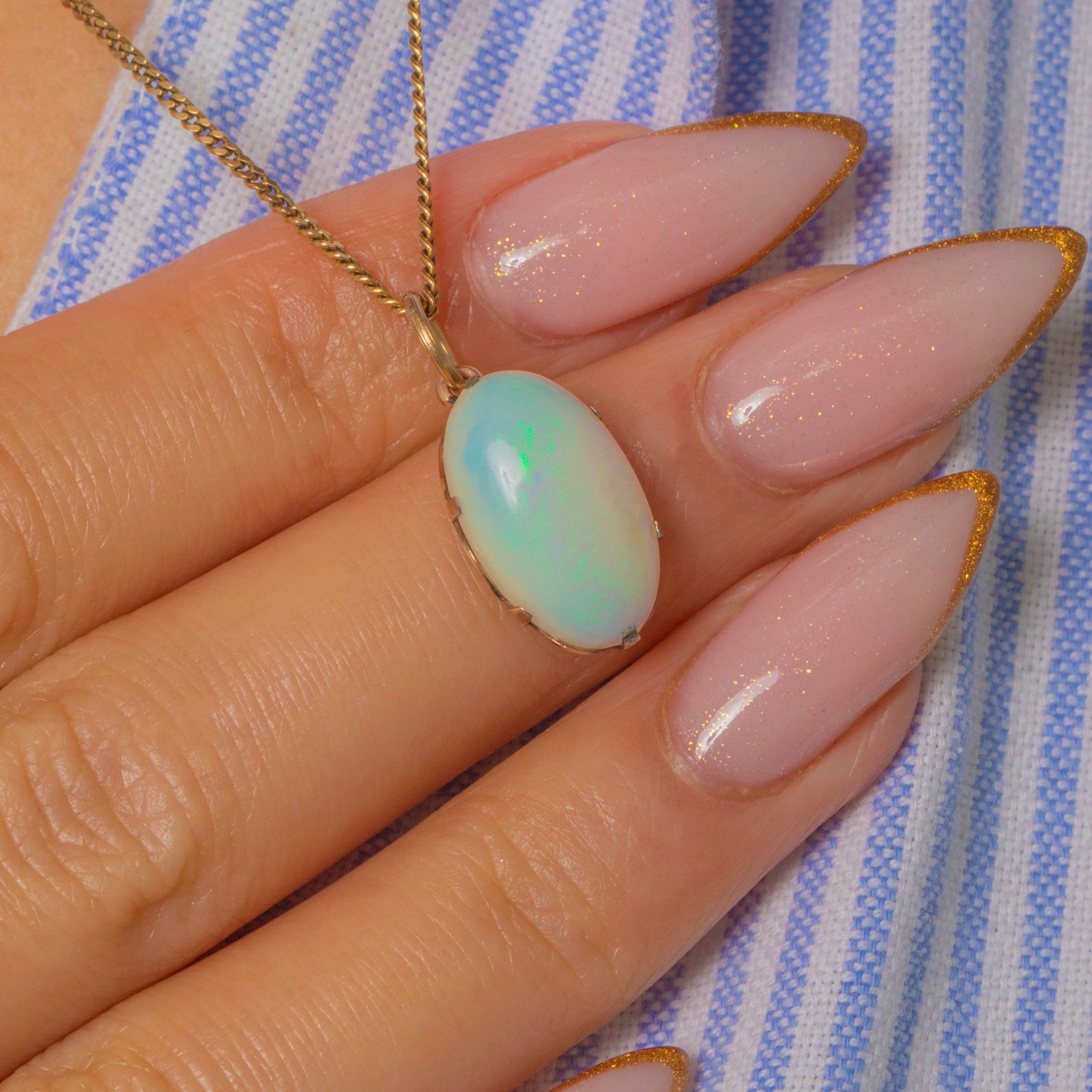 EXCELLENT: The Opal is smooth and glossy with exceptional play-of-colour and no chips or cracks. The 9ct Gold setting is bright, secure and beautifully finished.