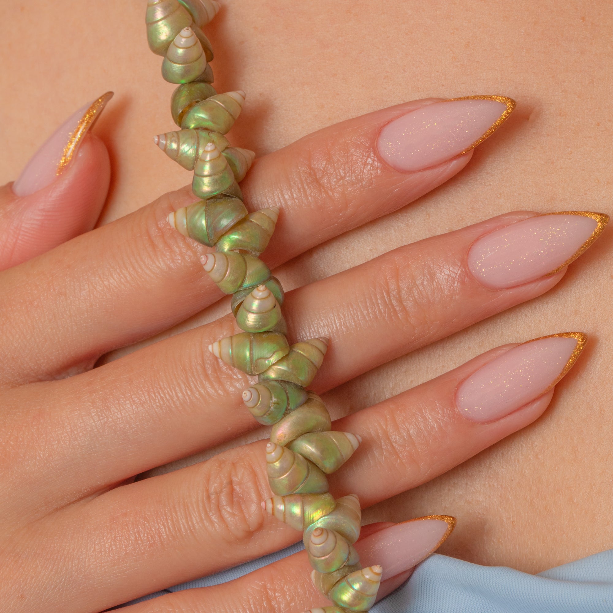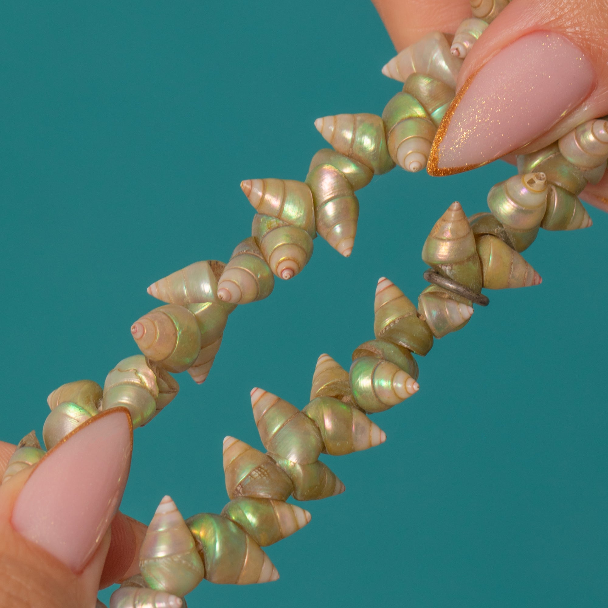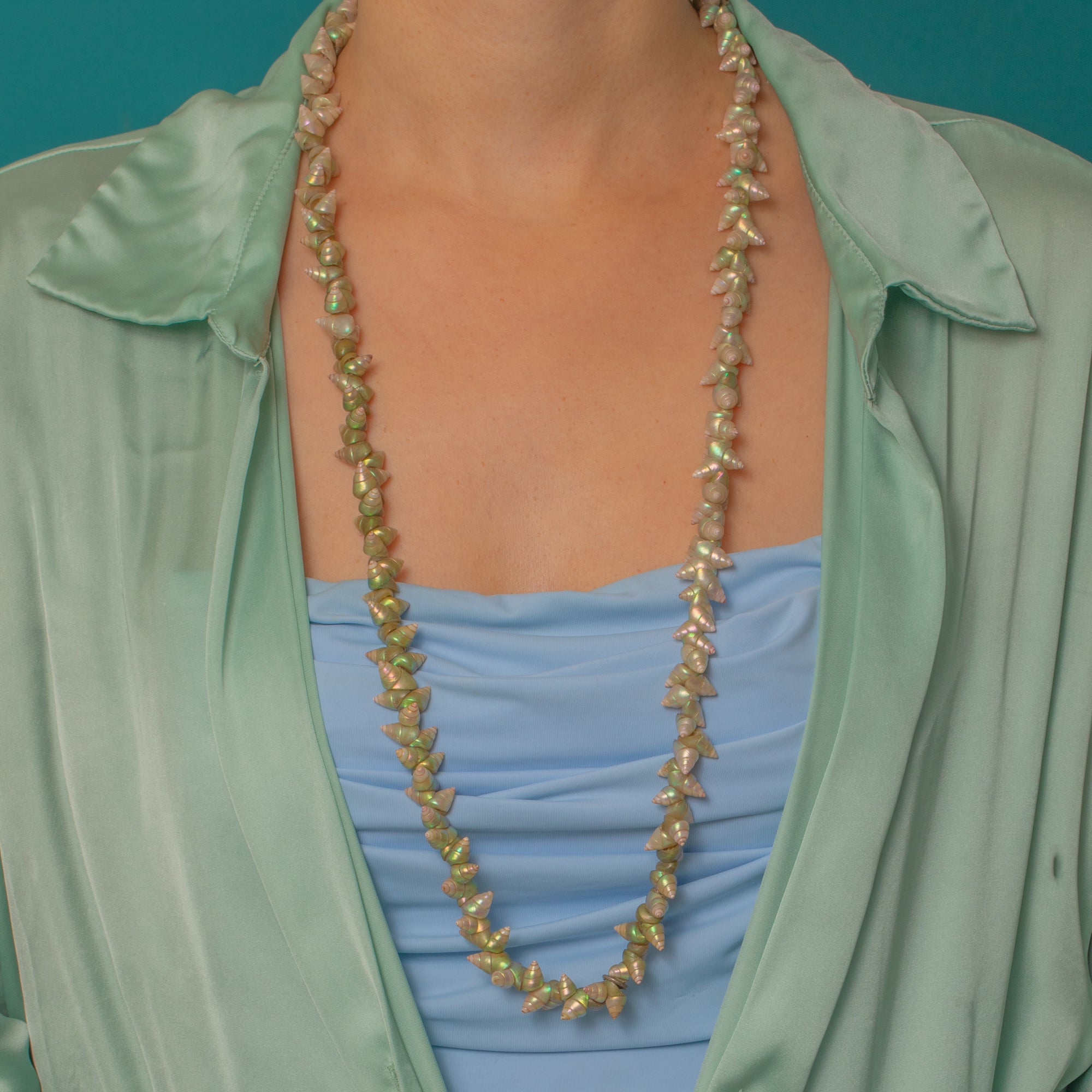 This exquisite Victorian necklace is strung with luminous green Tasmanian Marineer shells, a rare and highly sought-after material prized in the 19th century for its captivating iridescence. Each shell glows with soft golden-green and pink overtones, reflecting light beautifully as it moves.
