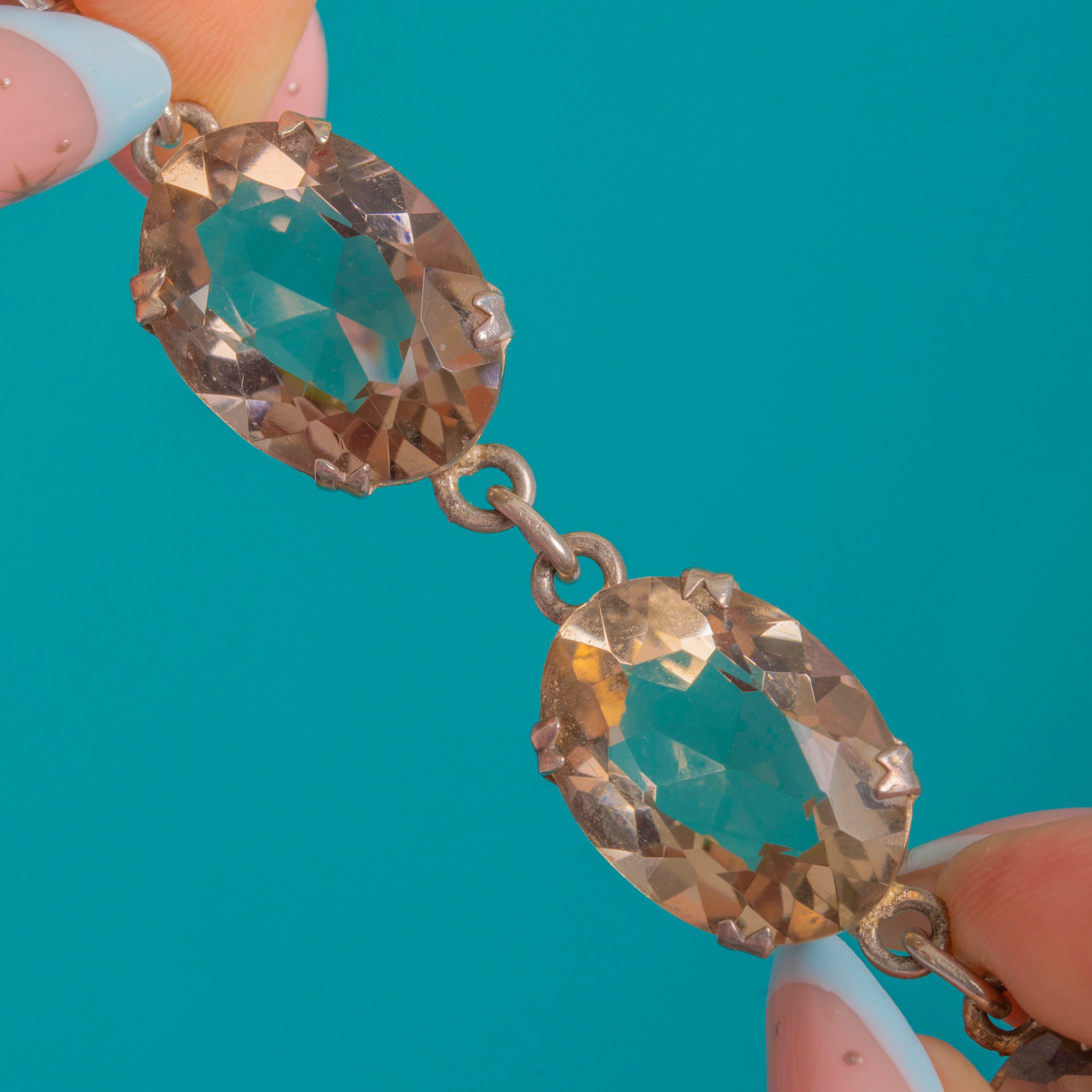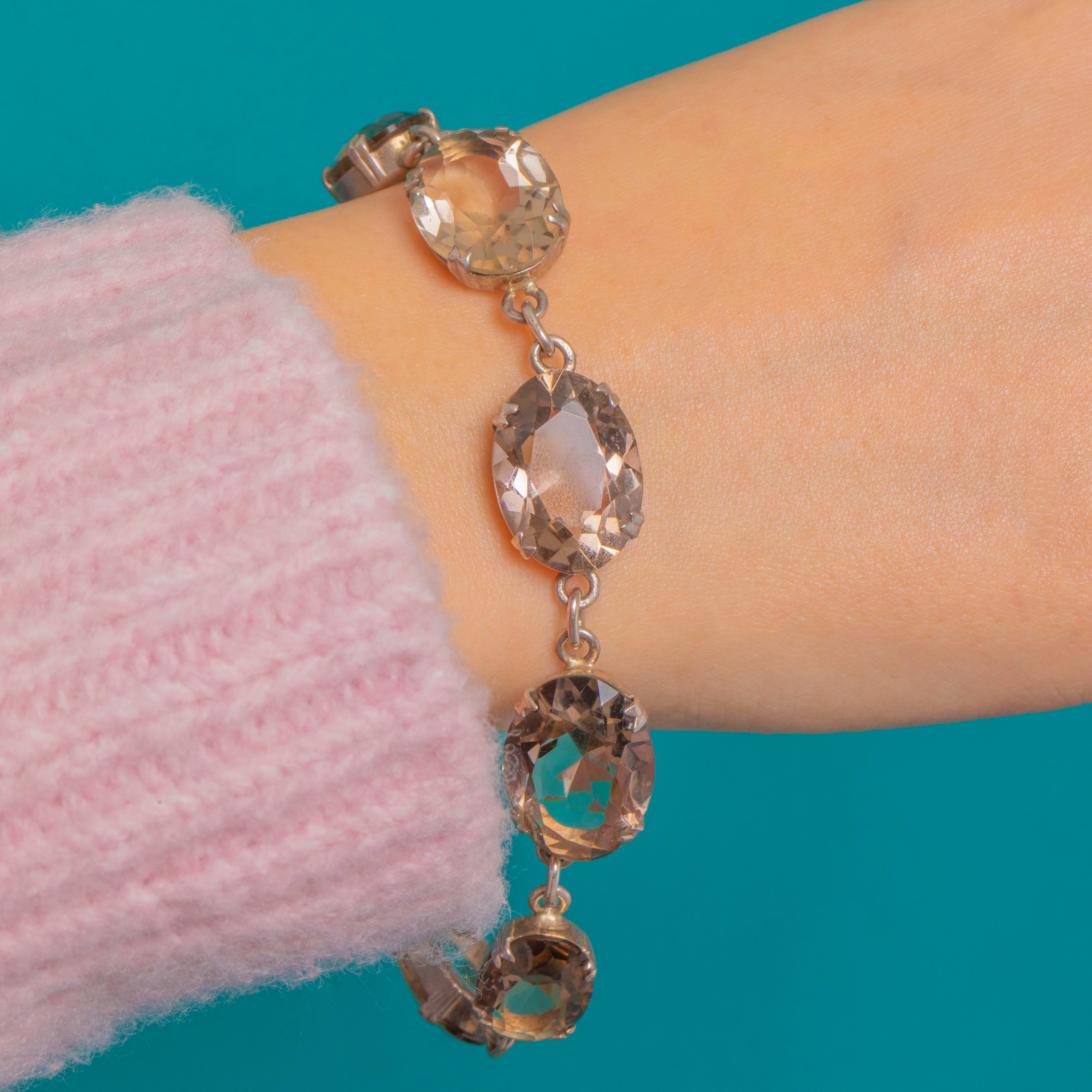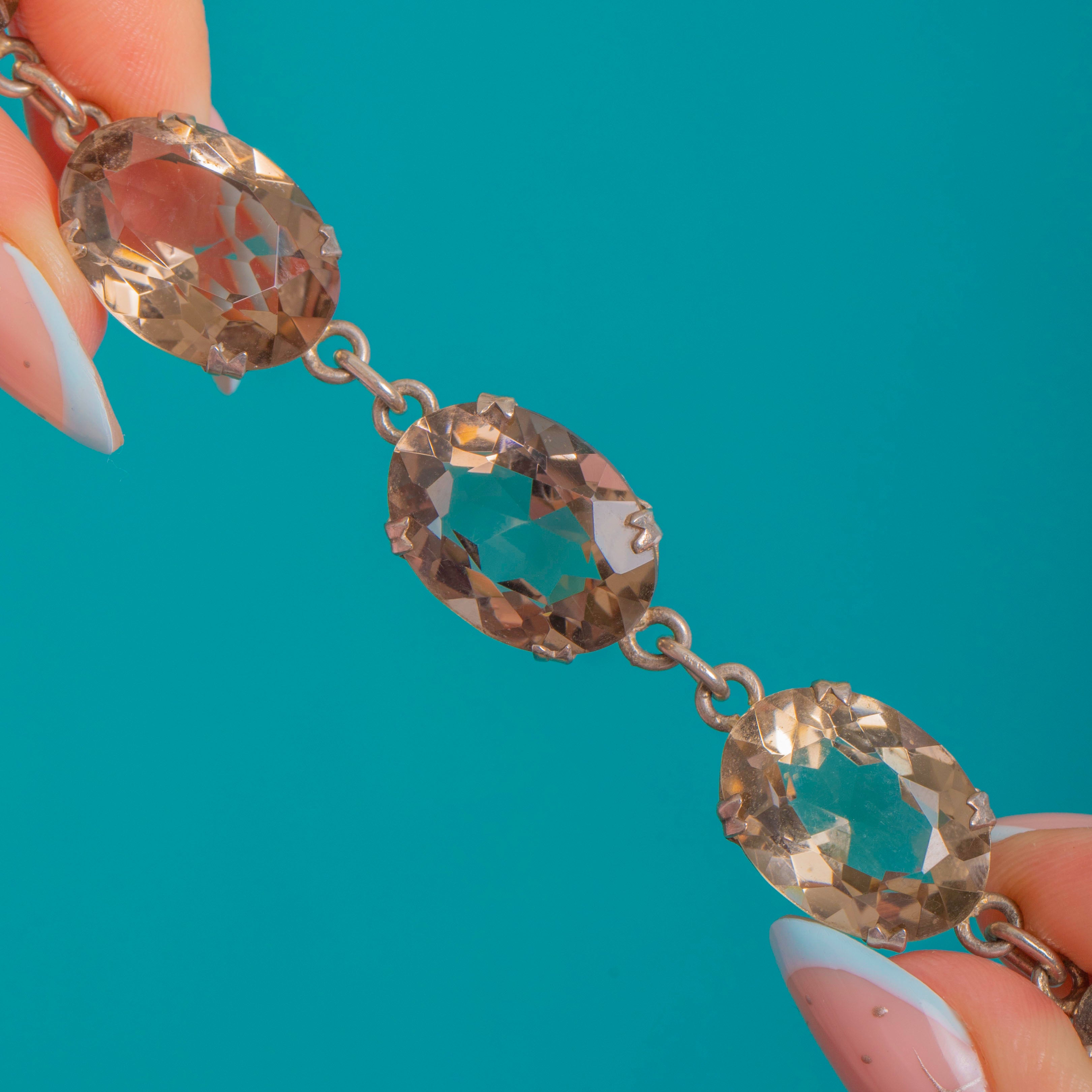 A luminous Art Deco riviere bracelet set with a flowing line of oval faceted Smoky Quartz, graduating gracefully and totalling an estimated 46.00cts. The stones sit in open-back Sterling Silver claws, letting light stream through to amplify their chic smoky-to-champagne tones and clean, graphic brilliance.