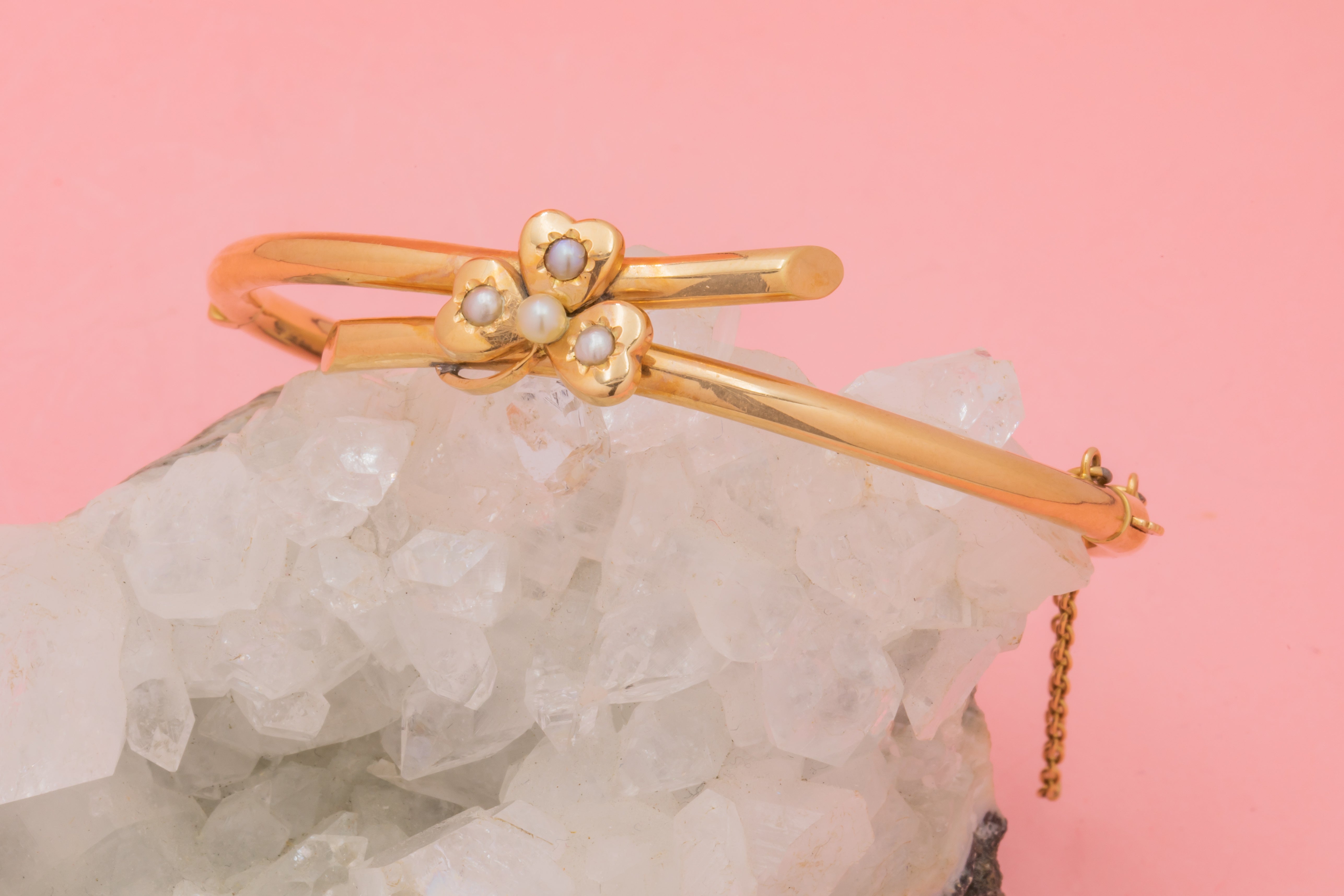 6.5" Antique 15ct Gold Pearl Shamrock Bangle, 8.5g