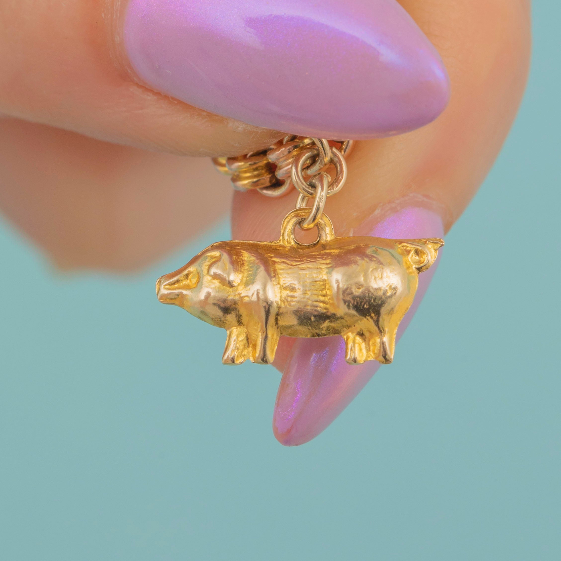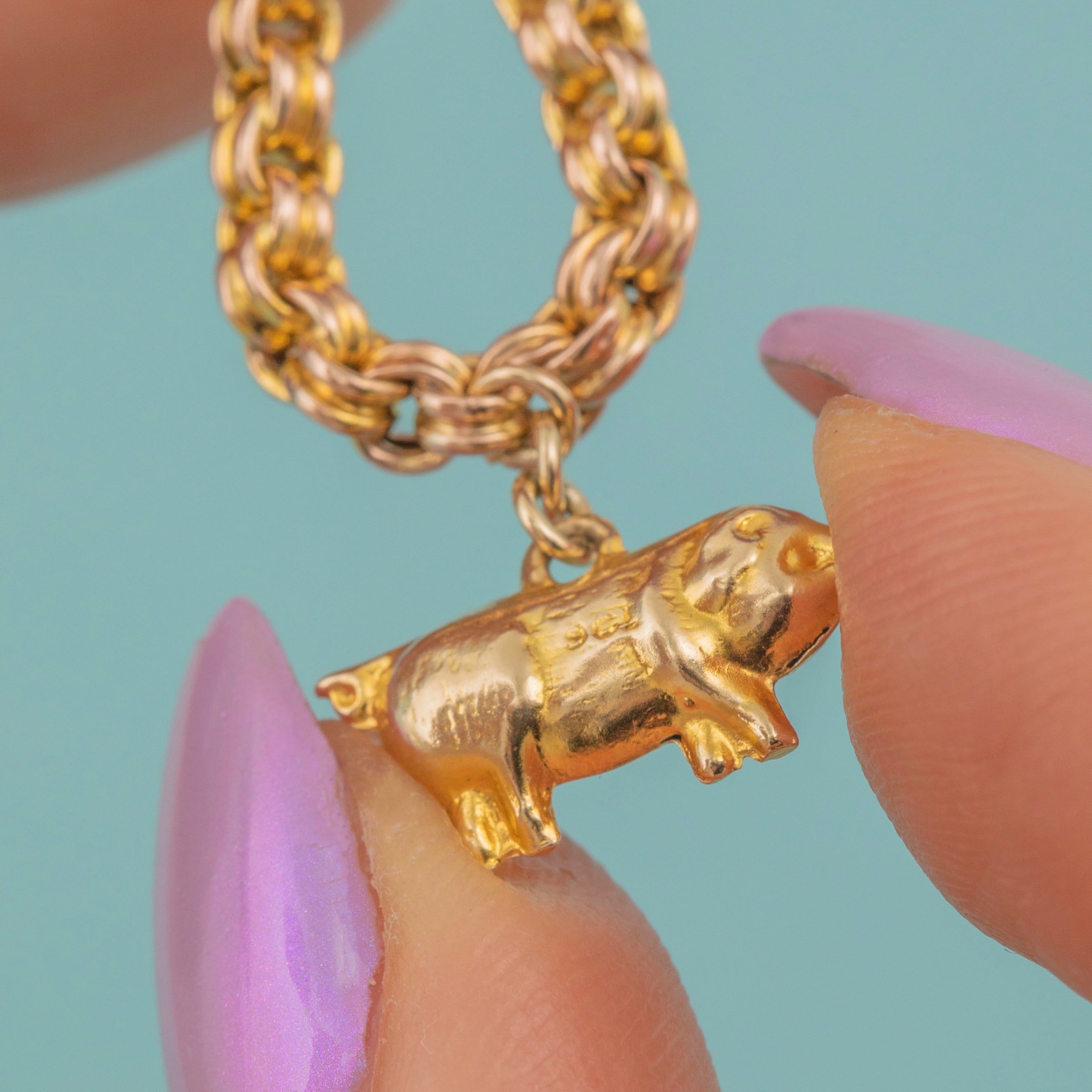 Victorian jewellery was often steeped in symbolism and this piece is no exception, with pigs worn as a talisman for good luck and fortune. The solid Gold pig charm is suspended from chunky double belcher links giving this Victorian bracelet a robust feel that can be worn with confidence!