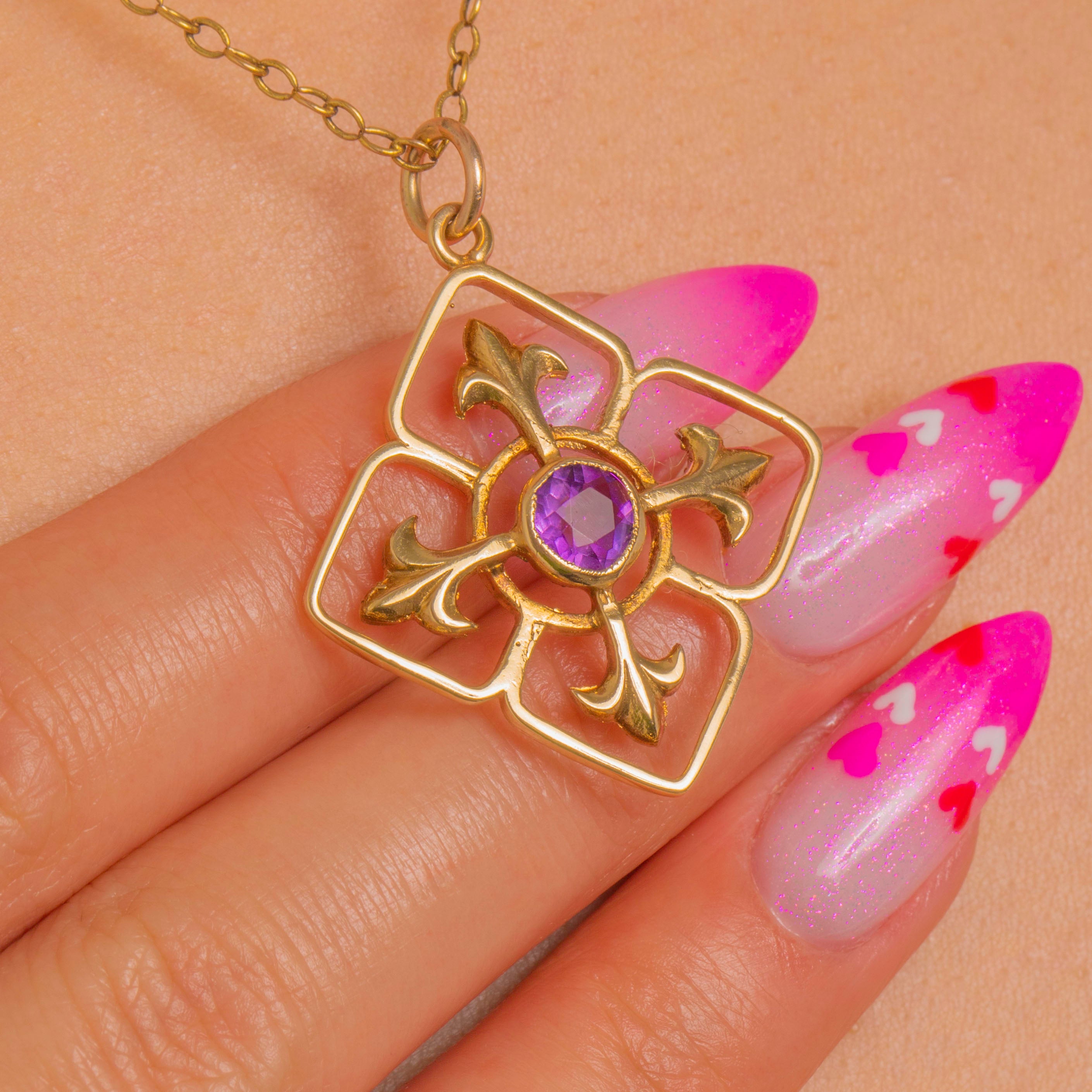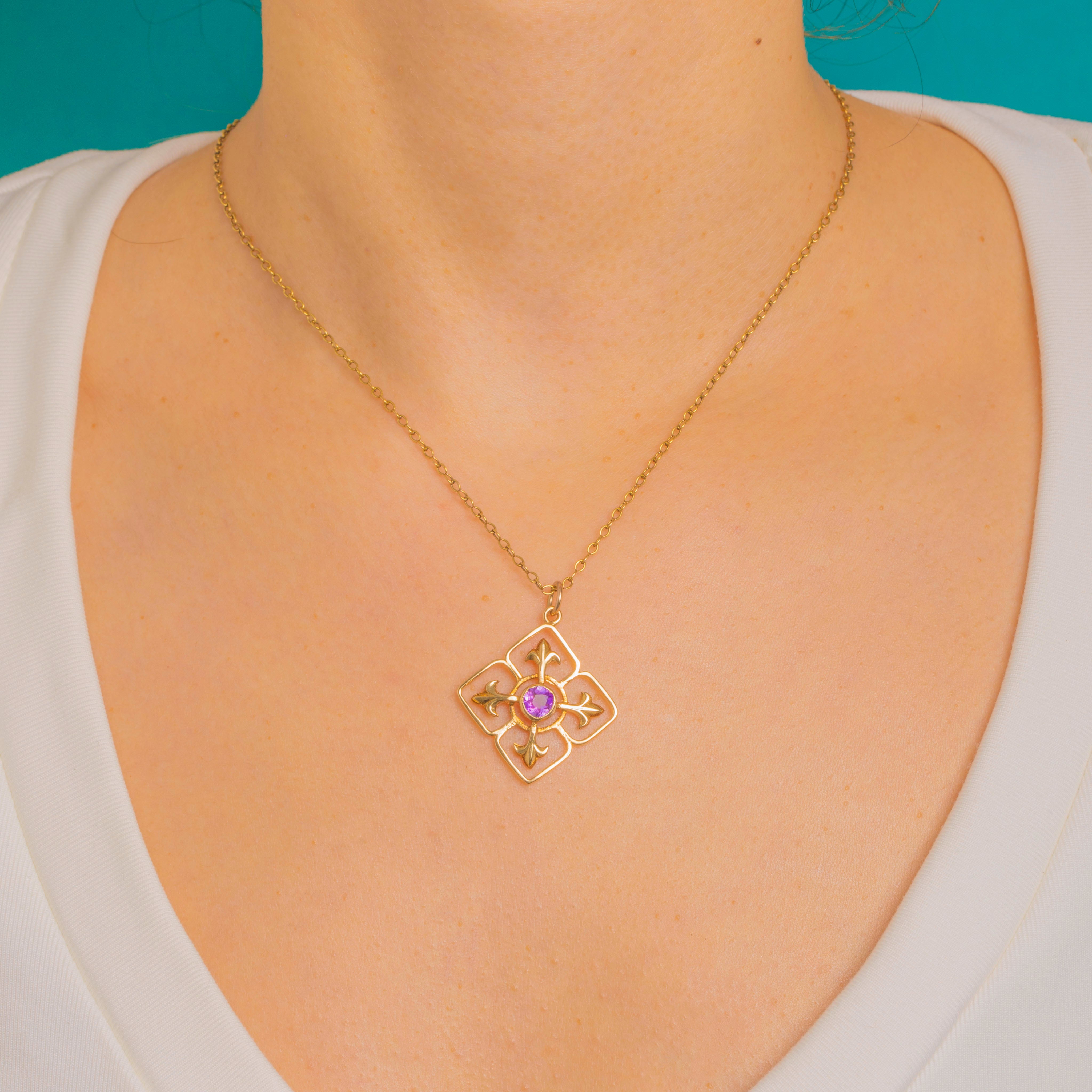 Shaped as a graceful quatrefoil clover, this late Victorian pendant is crafted in warm 9ct Gold with delicate openwork and stylised fleur-de-lis terminals. At its heart sits a round Amethyst, bezel-set to showcase its rich violet hue and gentle sparkle, lending a romantic, Gothic‑revival flourish to the design.