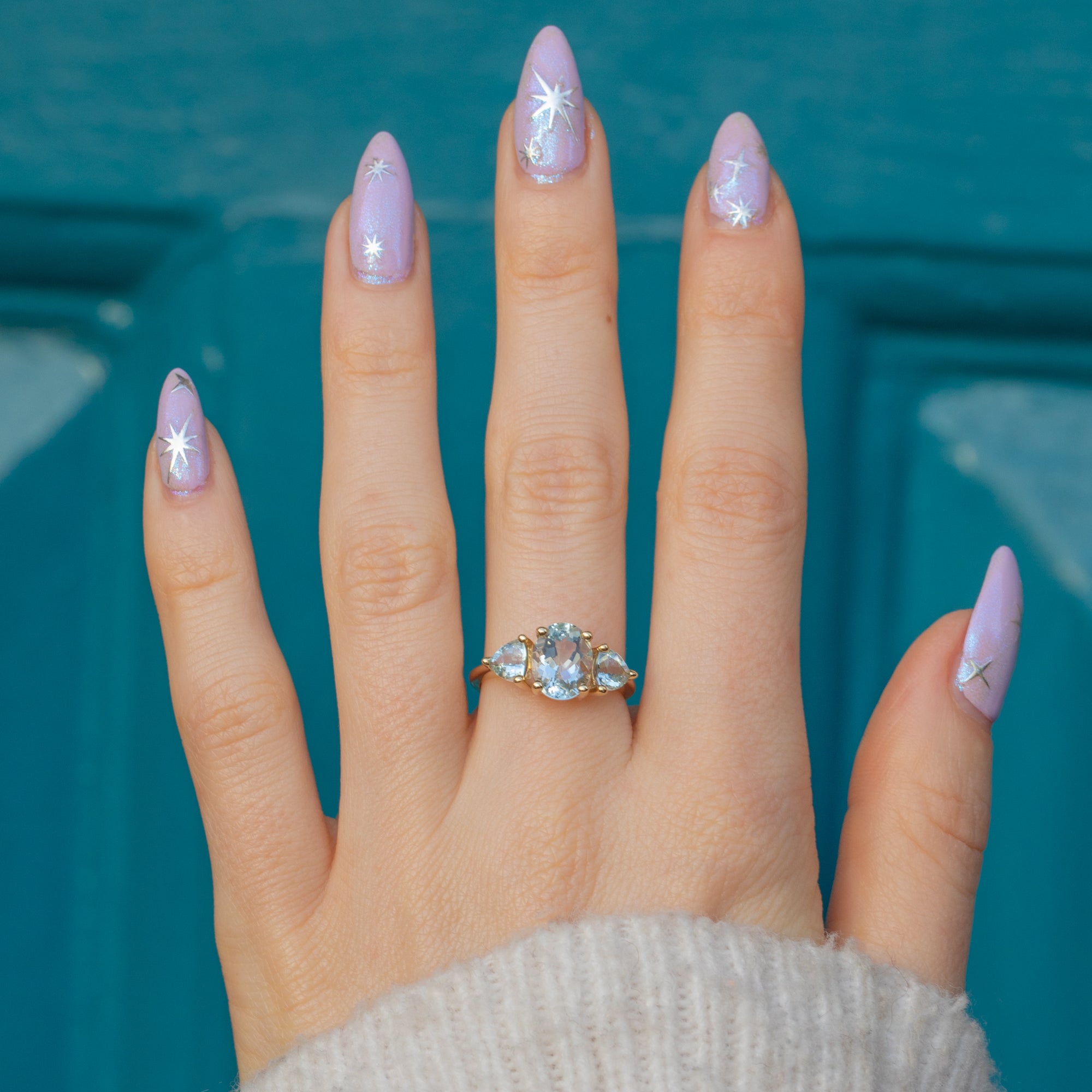 Aquamarine on shoulders is 5mm long x 4.5mm wide, weighing approx. 0.30ct combined)