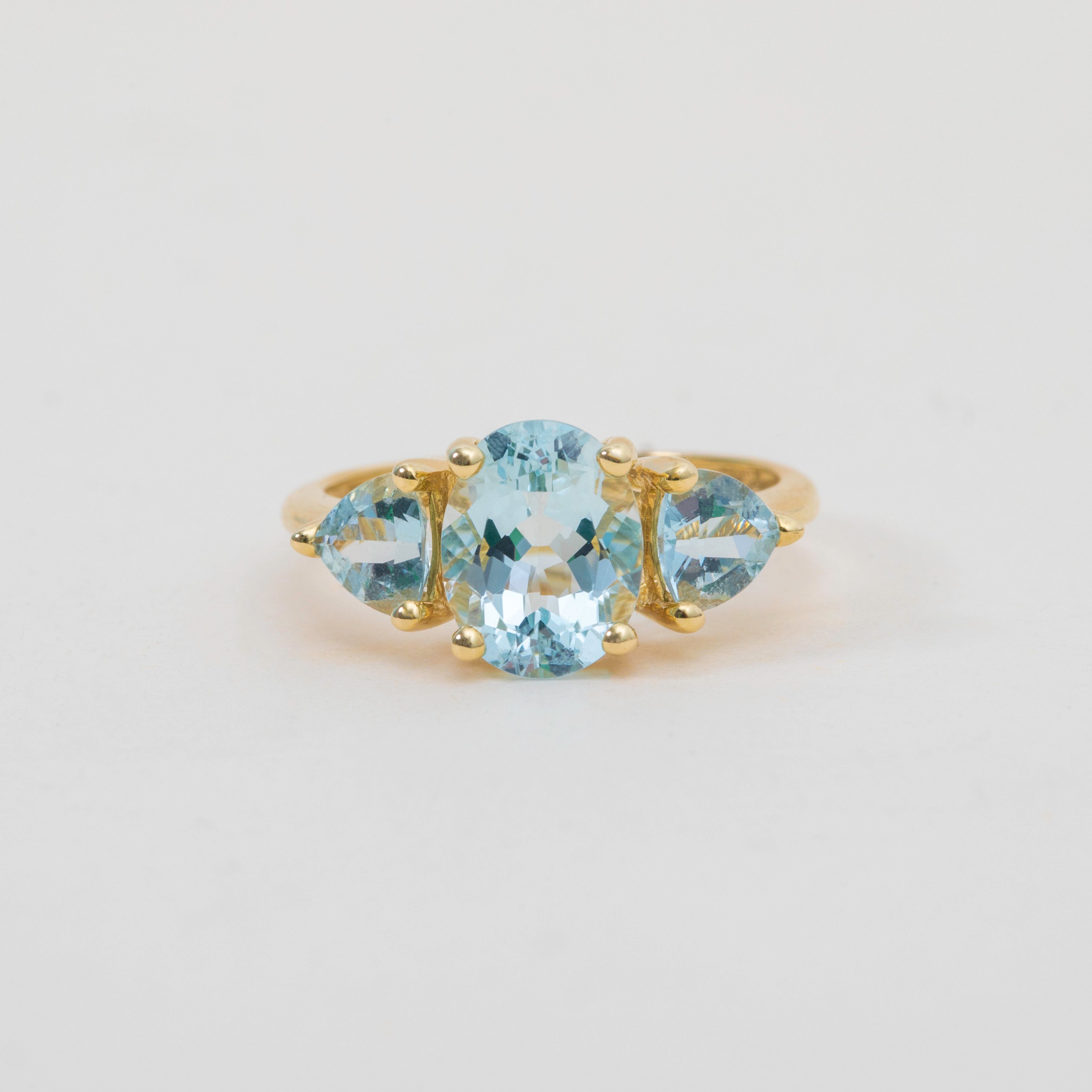 This exquisite 9ct Gold Aquamarine three stone ring has a classic and timeless design! The Aquamarines have a gorgeous icy blue hue, with a delicate translucence that catches the light beautifully. Each stone is elegantly faceted, enhancing their natural brilliance and creating a soft, ethereal glow.