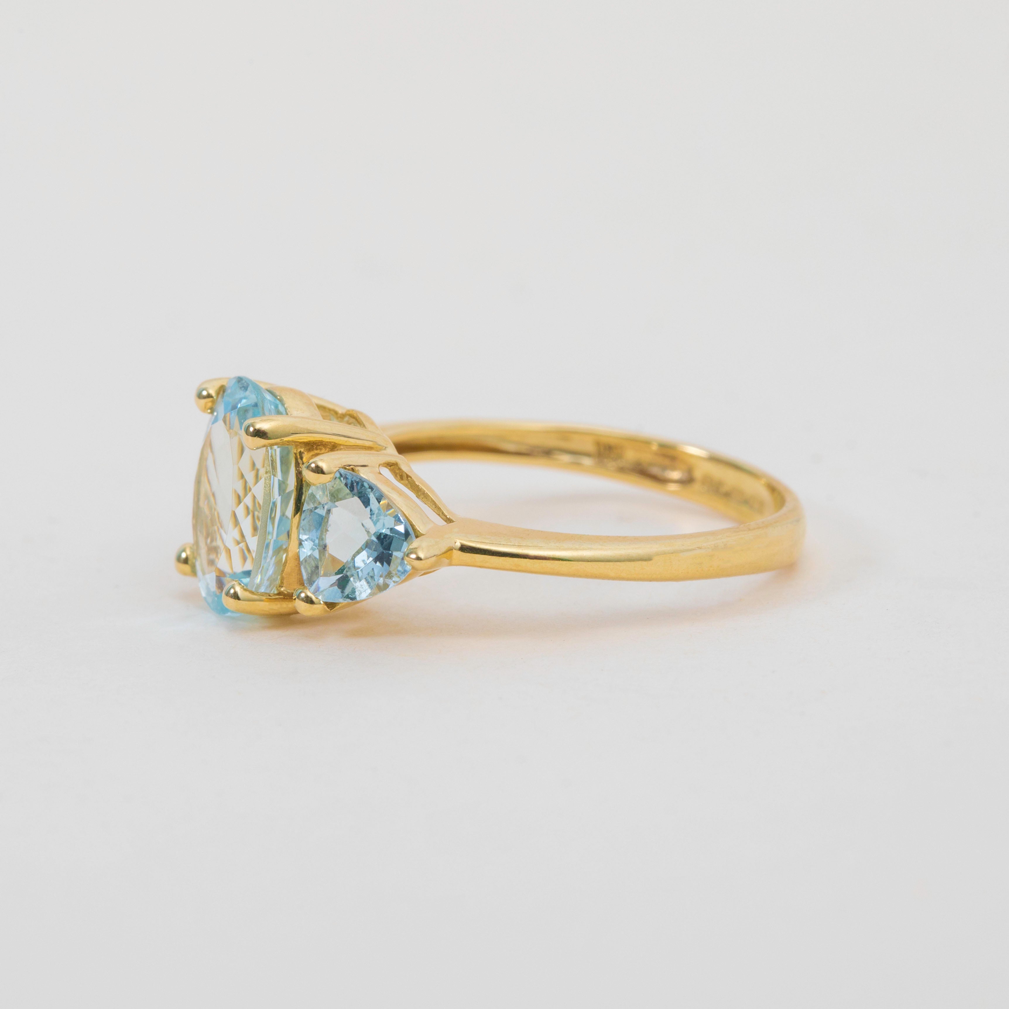 EXCELLENT. This 9ct Gold Aquamarine three stone ring is in excellent condition, with a smooth, polished band. The Aquamarines are securely set, with no visible abrasions or chips. This vintage Aquamarine trilogy ring will make a gorgeous addition to your collection!