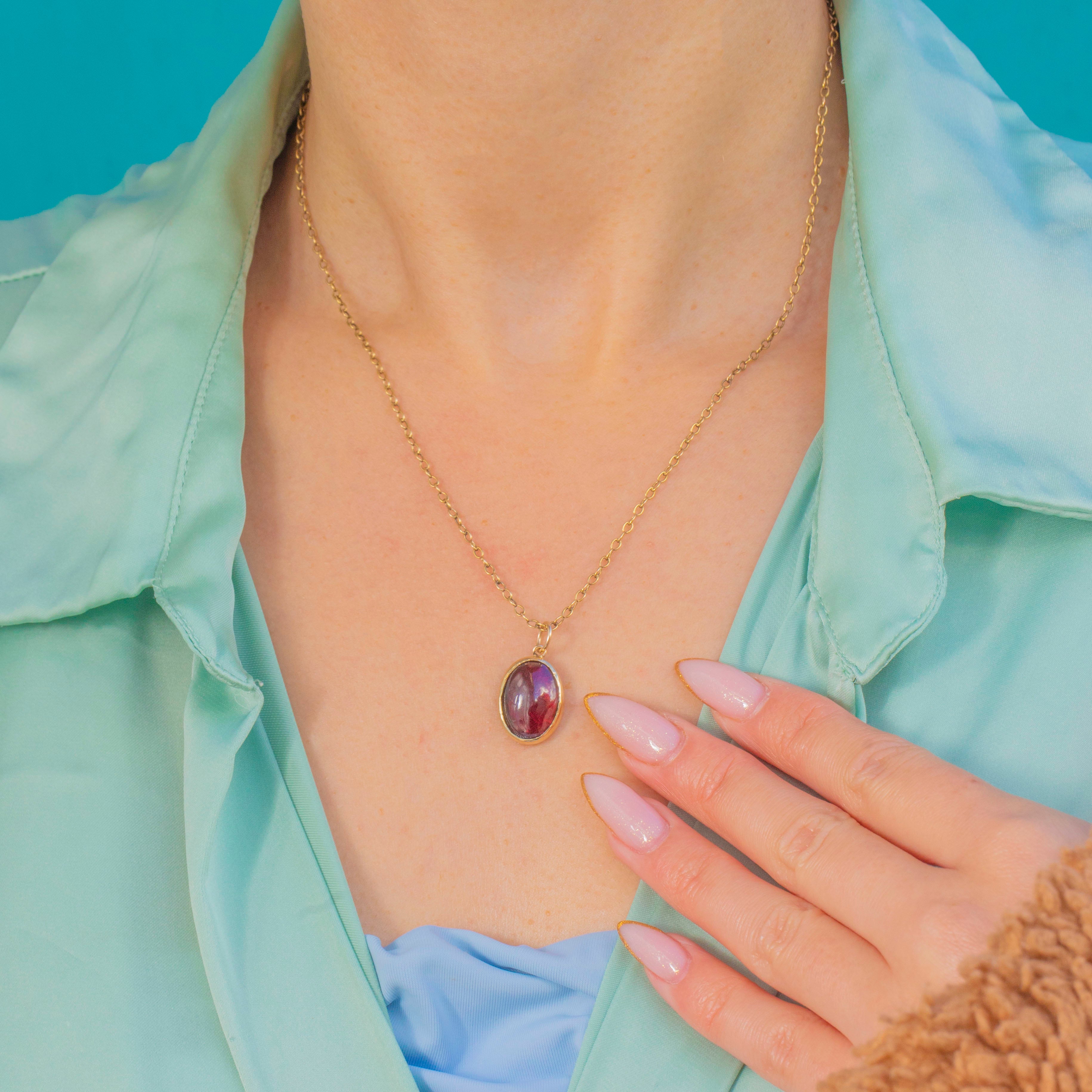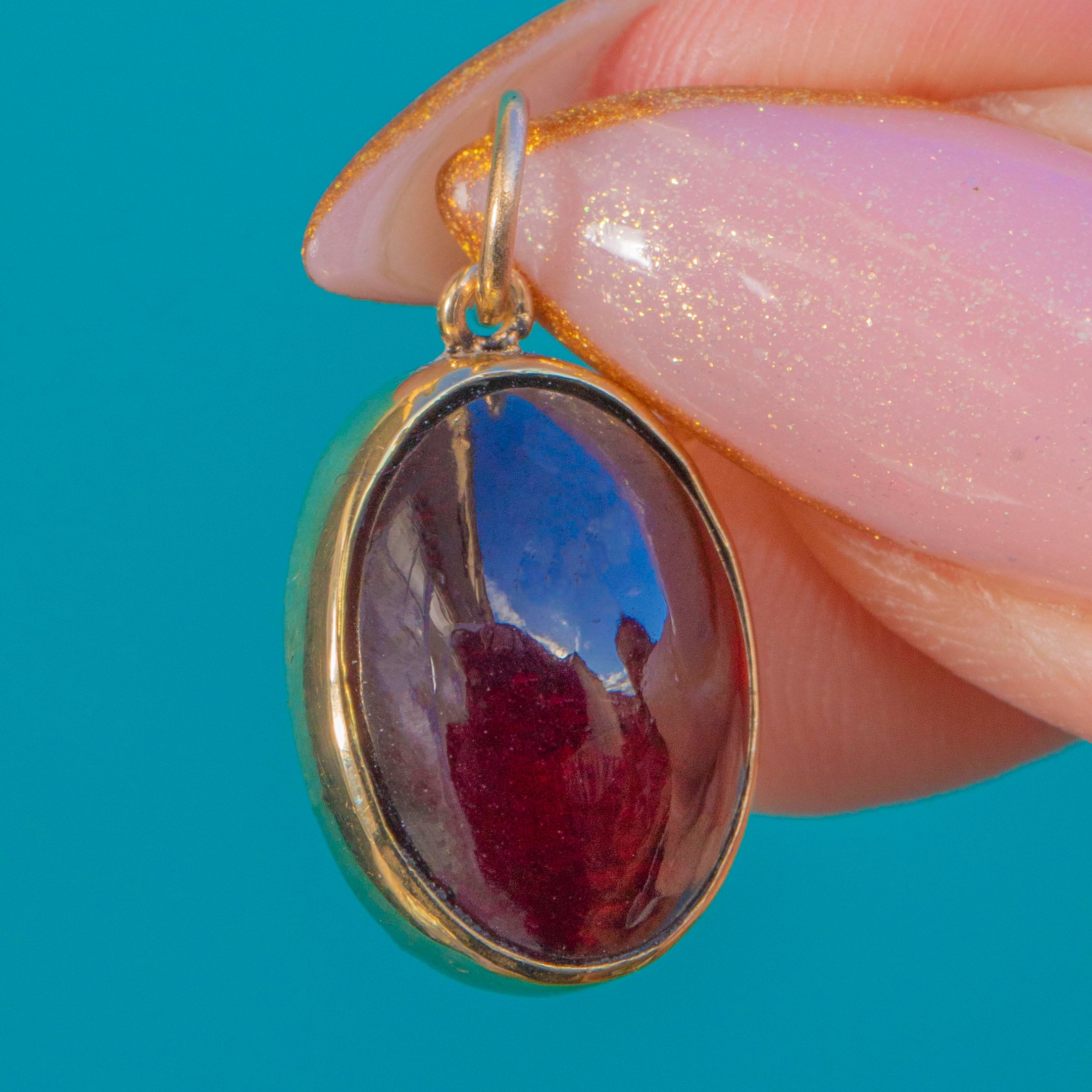 This vintage 9ct Gold charm showcases a luscious Garnet cabochon in rich shades of berry-red, magenta and plum. Beautifully domed with a glossy finish, the cabochon glows with depth and warmth, catching the light with every movement.