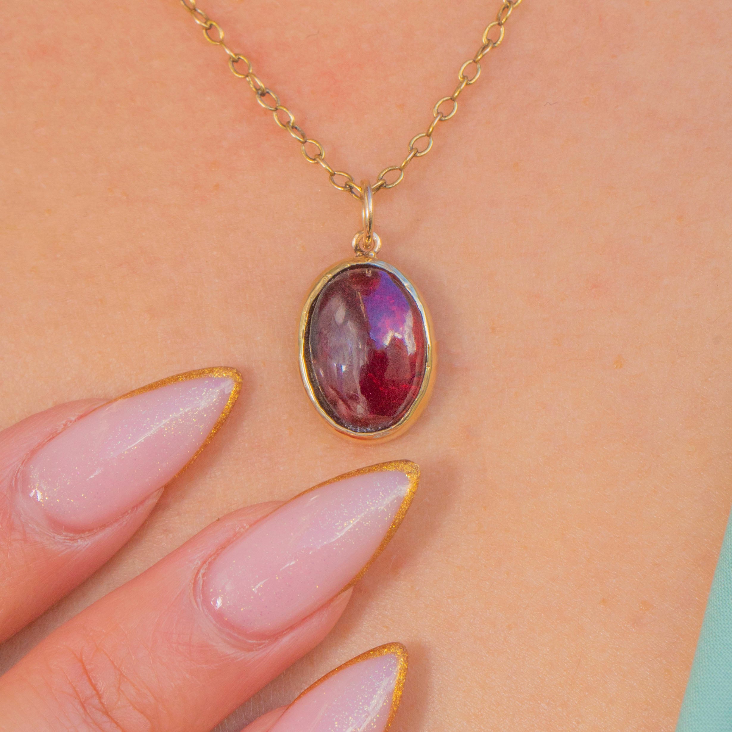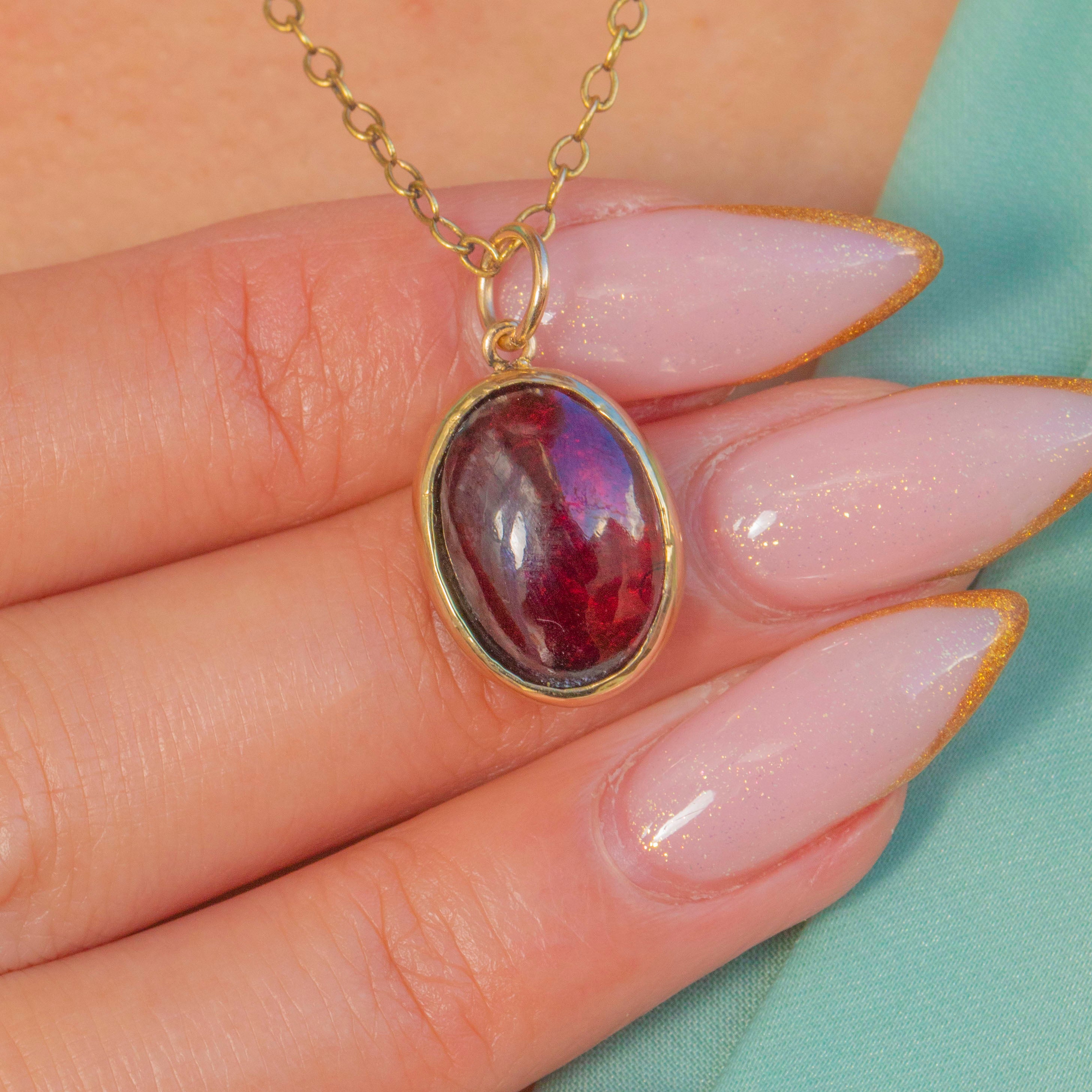 The Garnet is bezel-set in a simple oval frame with a smooth closed back, giving the piece a clean, timeless look that works perfectly on a fine chain or layered into a charm stack. With an estimated 2.20ct Garnet, this charming pendant brings a bold pop of colour to everyday outfits and special occasions alike.