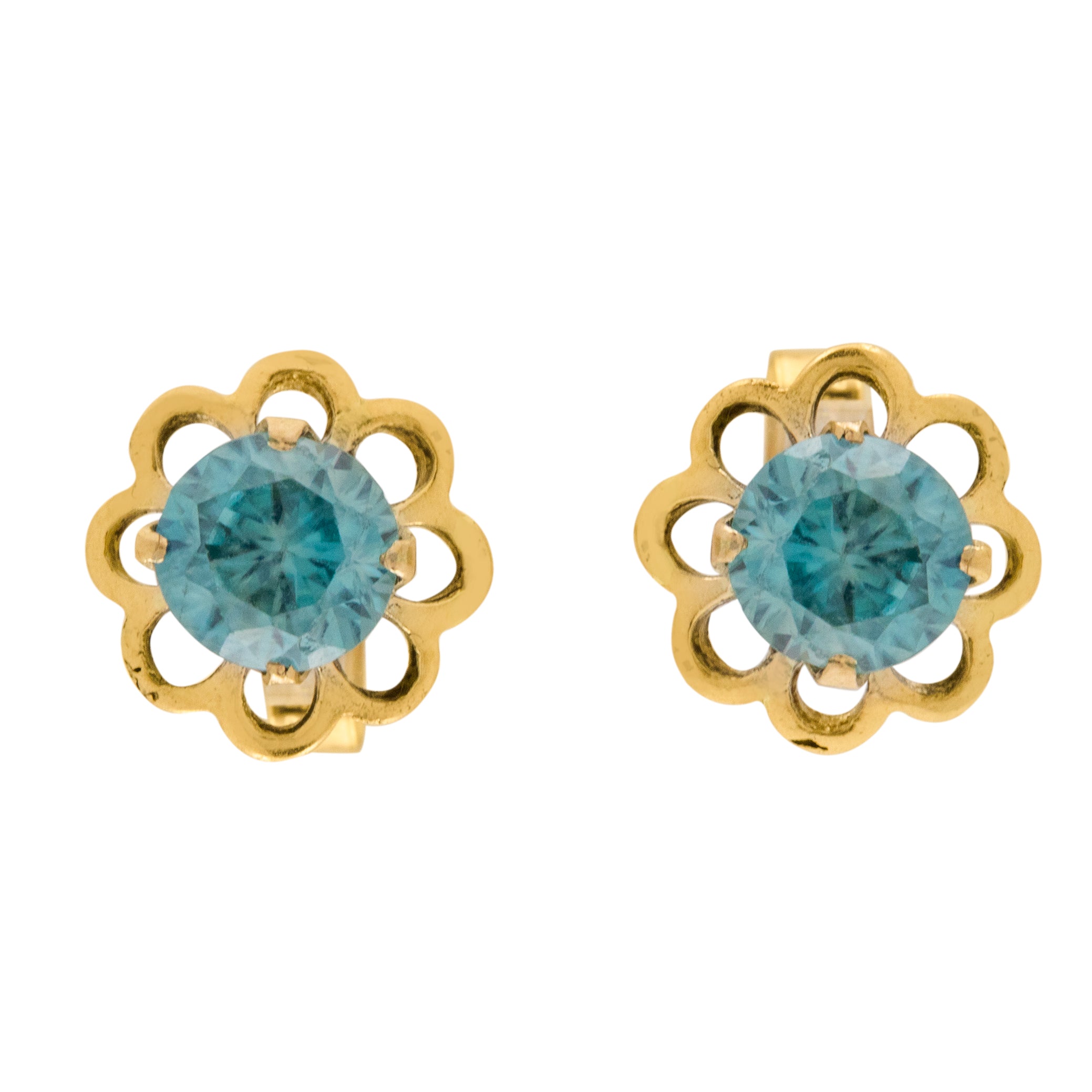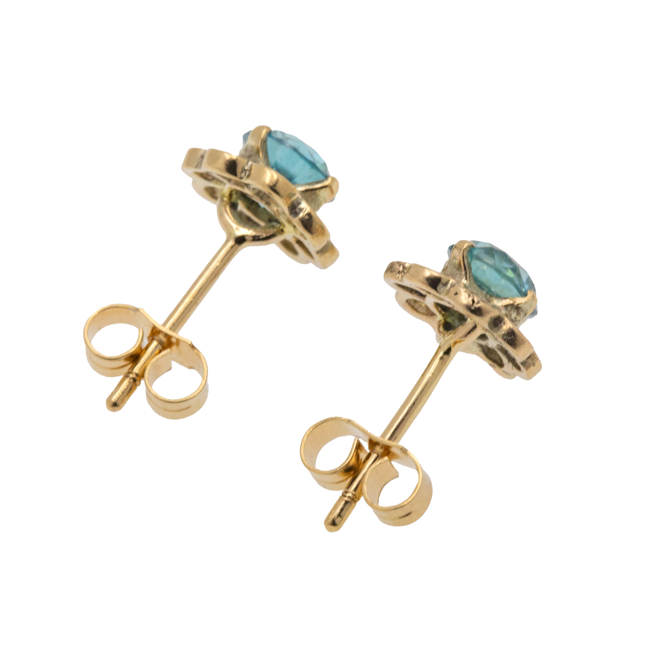VERY GOOD. These 9ct Gold blue Topaz flower earrings are in very good condition. The blue Topaz sit securely within their their claw settings, with a lovely shimmer throughout. There are a few nibble marks on the Topaz, but this is only noticeable under a jeweller's loupe. There is some minor surface wear on the Gold petals, but this is barely noticeable due to their glossy finish. With firmly soldered posts and secure butterfly backs, you can wear these Edwardian Topaz earrings confidently; they would make a prized possession within anyone's jewellery box!