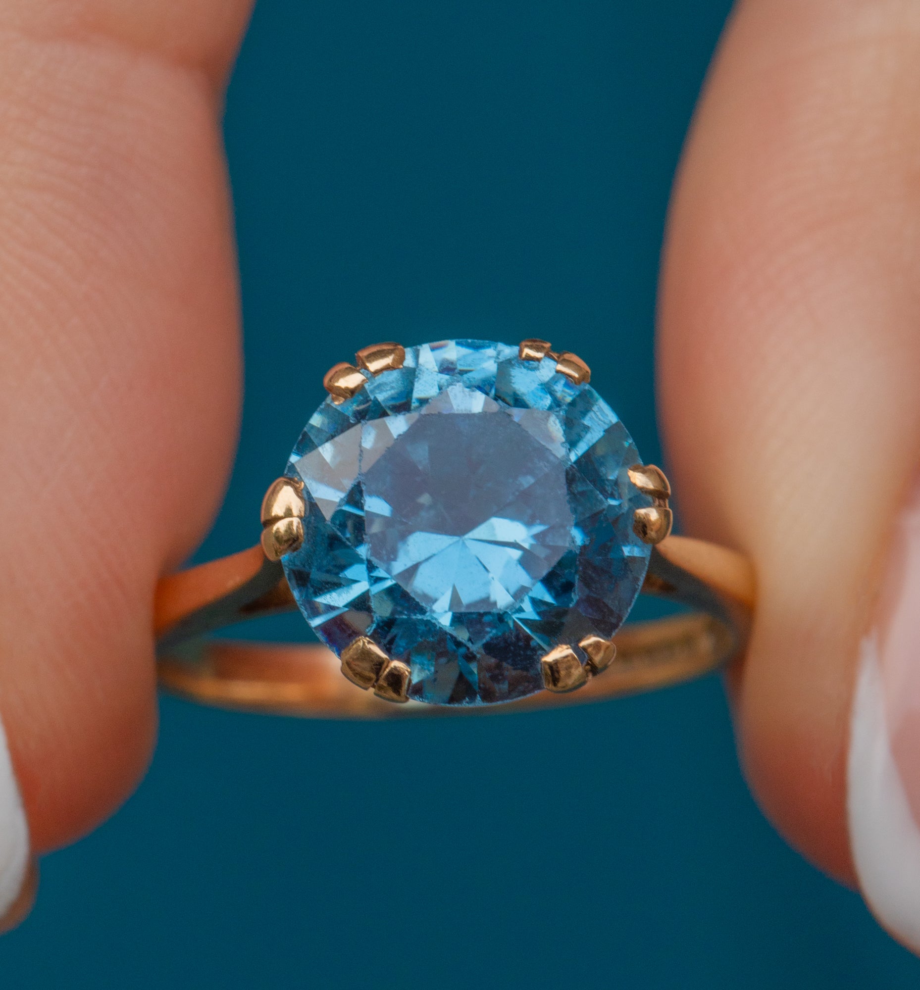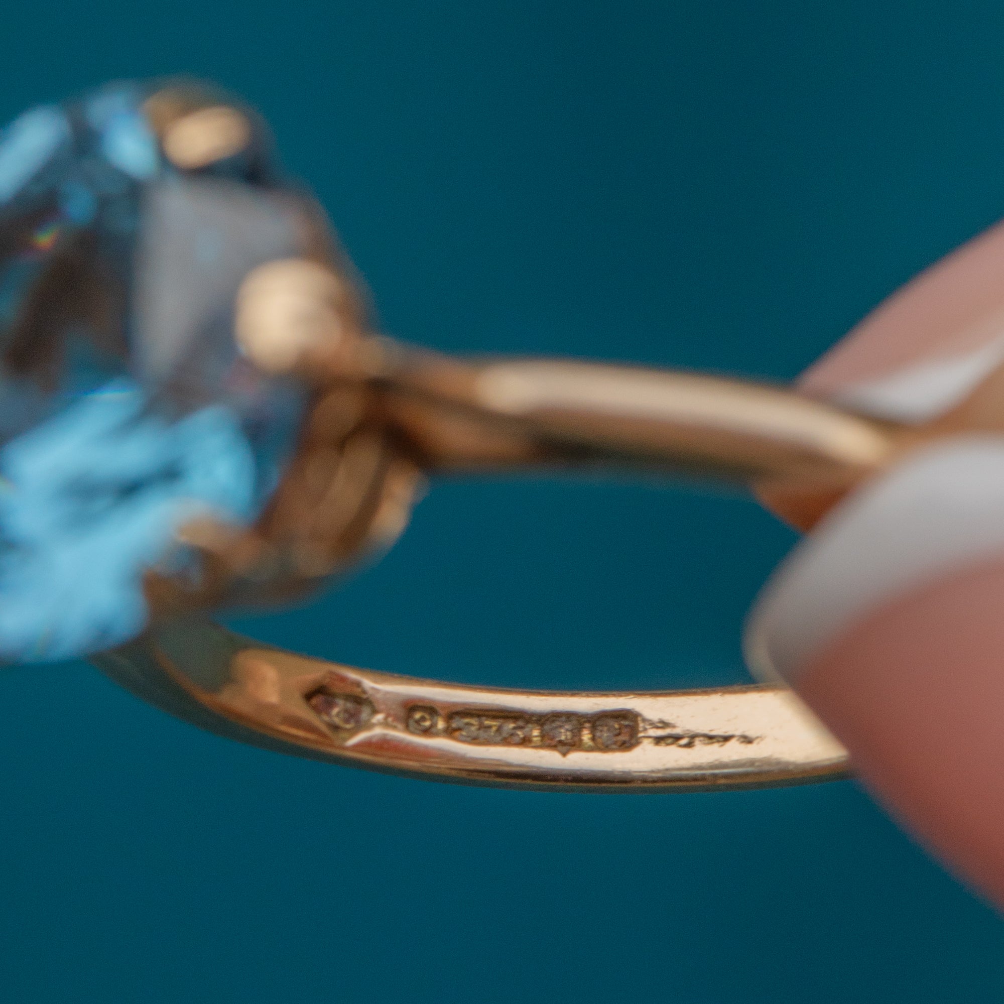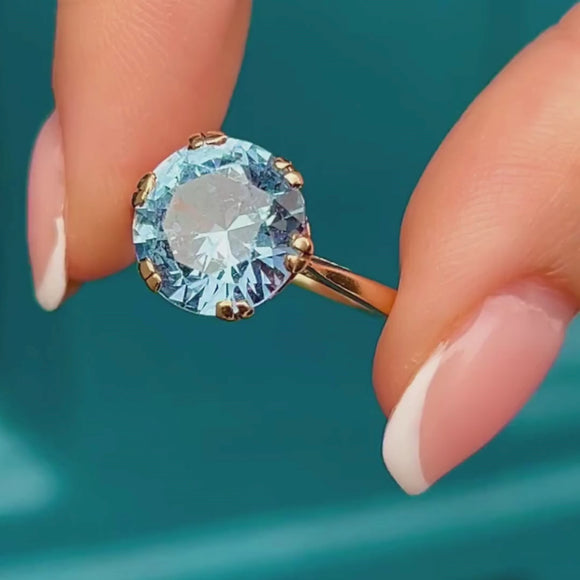 EXCELLENT. This 9ct Gold blue Topaz solitaire ring is in excellent condition! The magnificent Topaz is securely held within its claw settings and has crisp facets that are free from chips or abrasions. The Gold is buttery and sleek, with lovely vintage hallmarks inside the band. This outstanding Topaz ring will delight for years to come!
