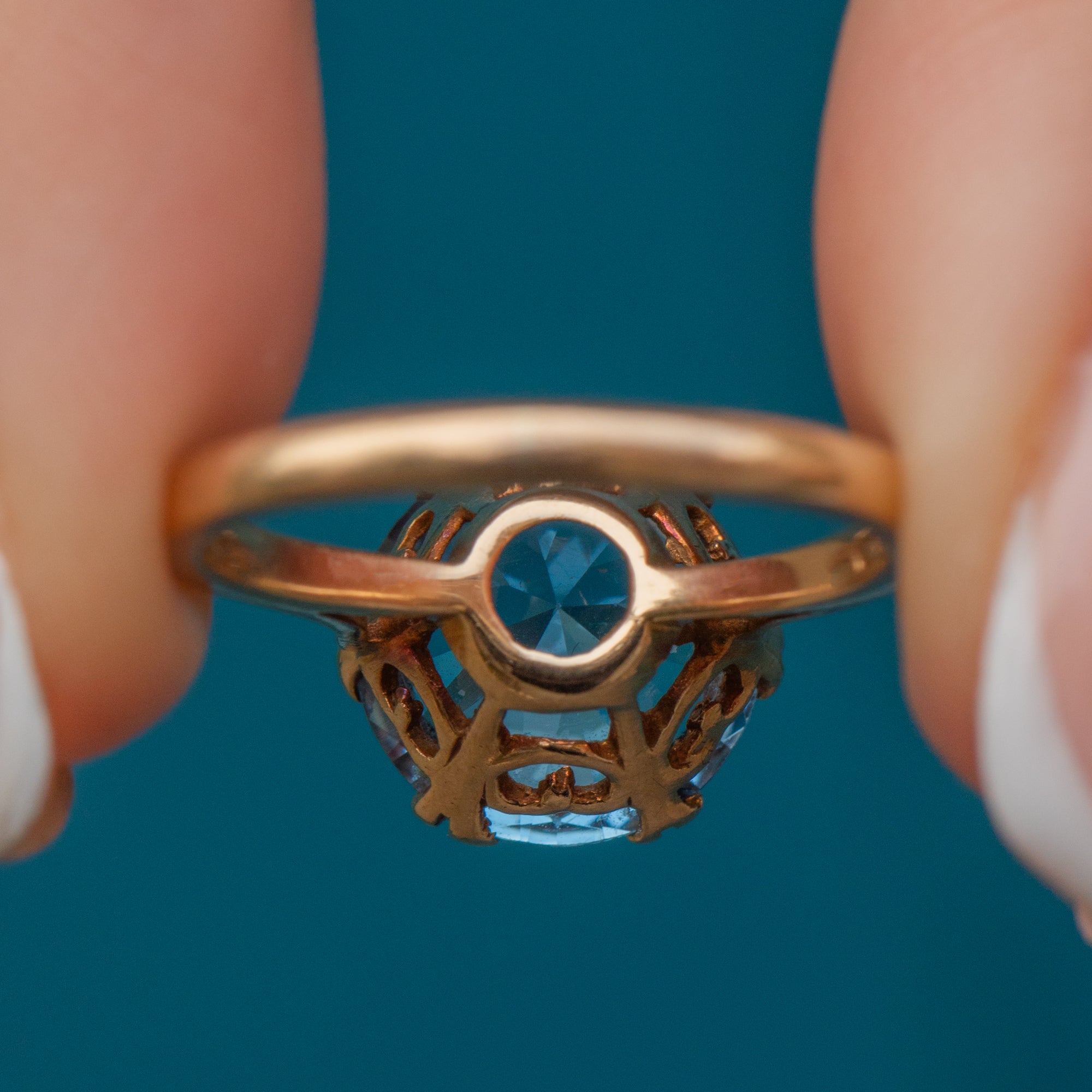 Her rich 9ct Gold forms her slender band that effortlessly flows around your finger; she fits snugly in all the right places, making her oh-so-comfortable to wear. Upon looking at the gallery of this Vintage ring, you will notice that each side is adorned with a Gold heart for a romantic touch!