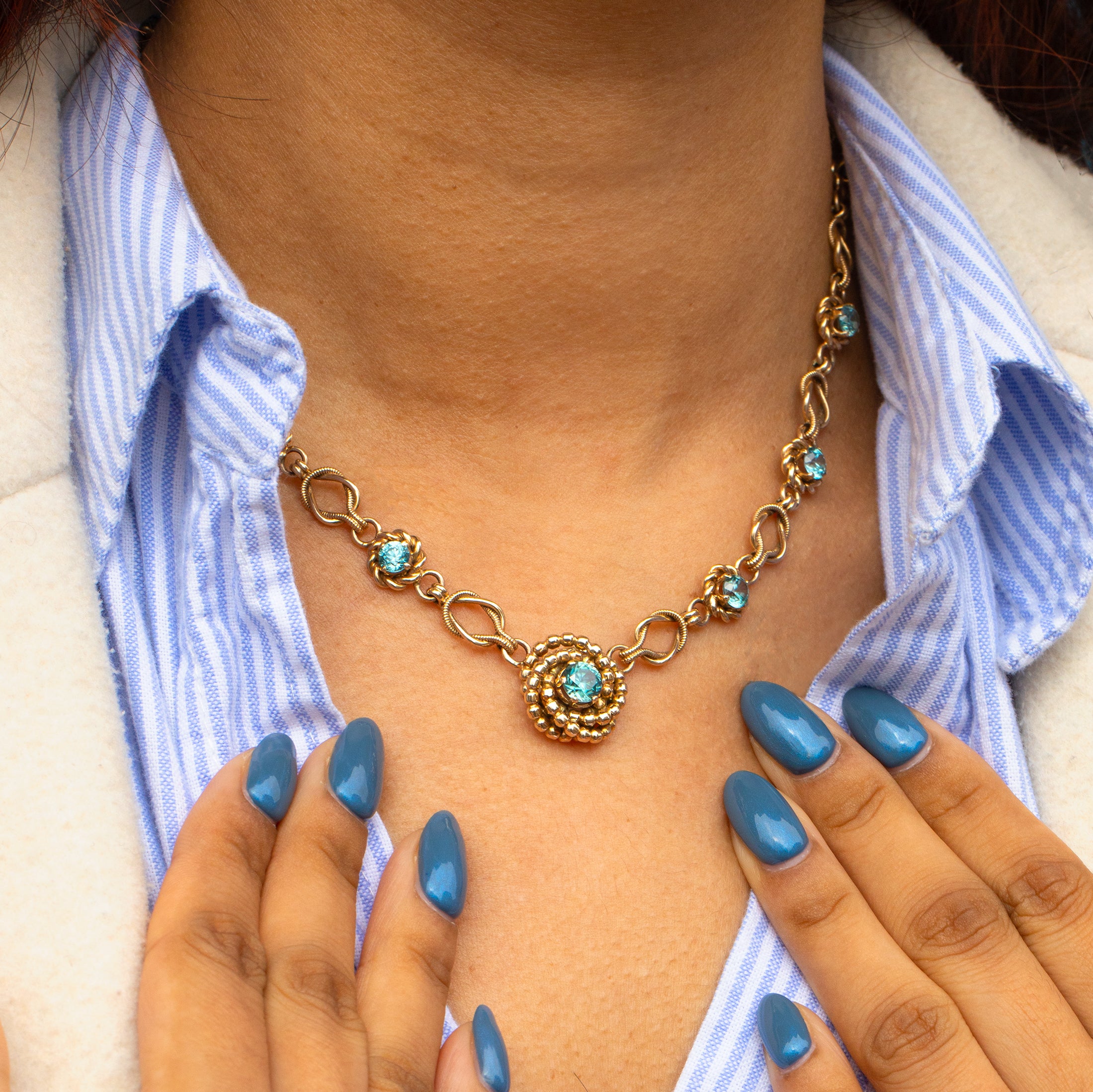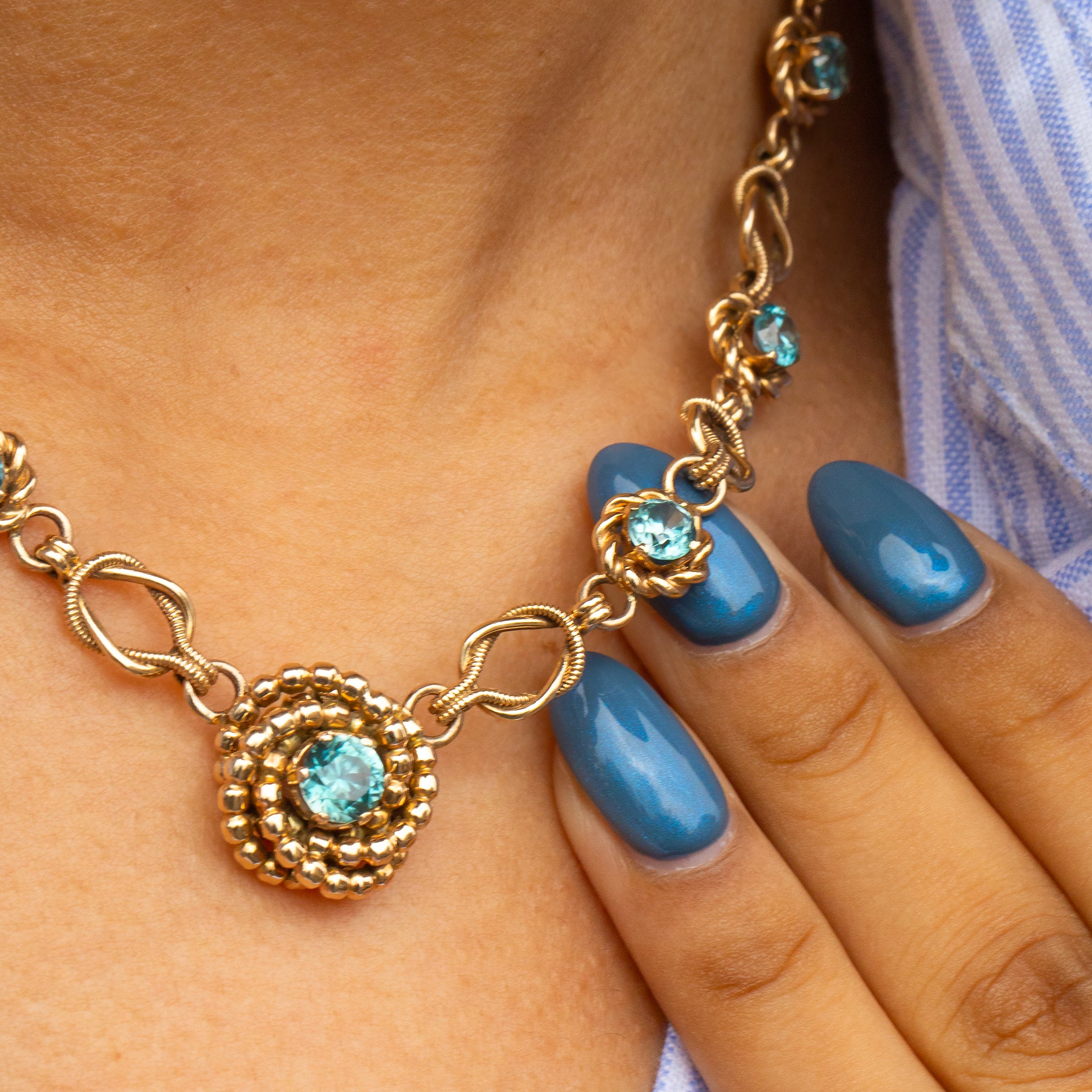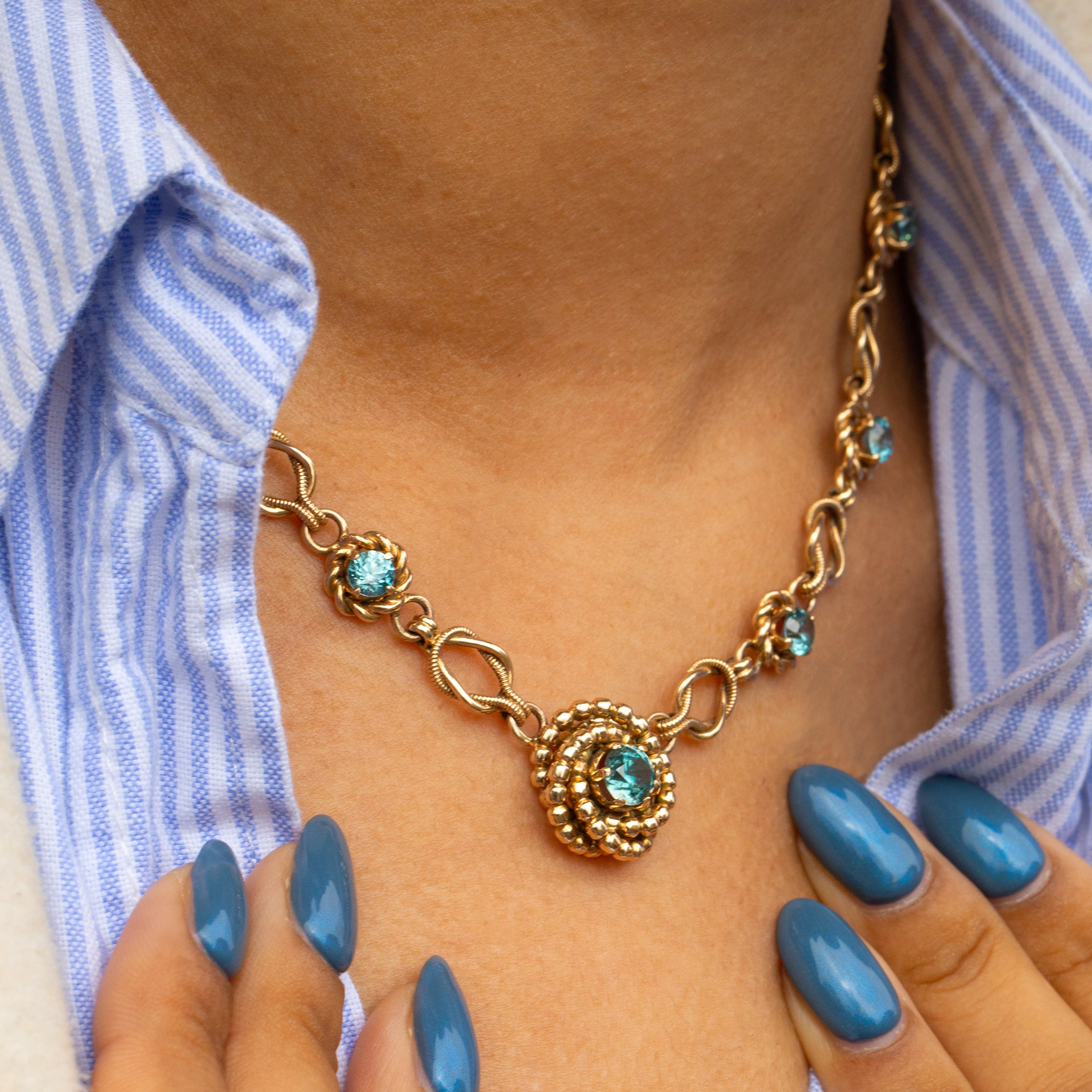 With a combined carat weight of 6.70ct, her Blue Zircons provide a sea of crisp arctic blue hues that sparkle across your collarbones. Falling at the centre of this Vintage Gold necklace is beaded knot detailing homing a 1.20ct Blue Zircon which gleams against the glossy 9ct Gold, finishing this Mid-century necklace to perfection!