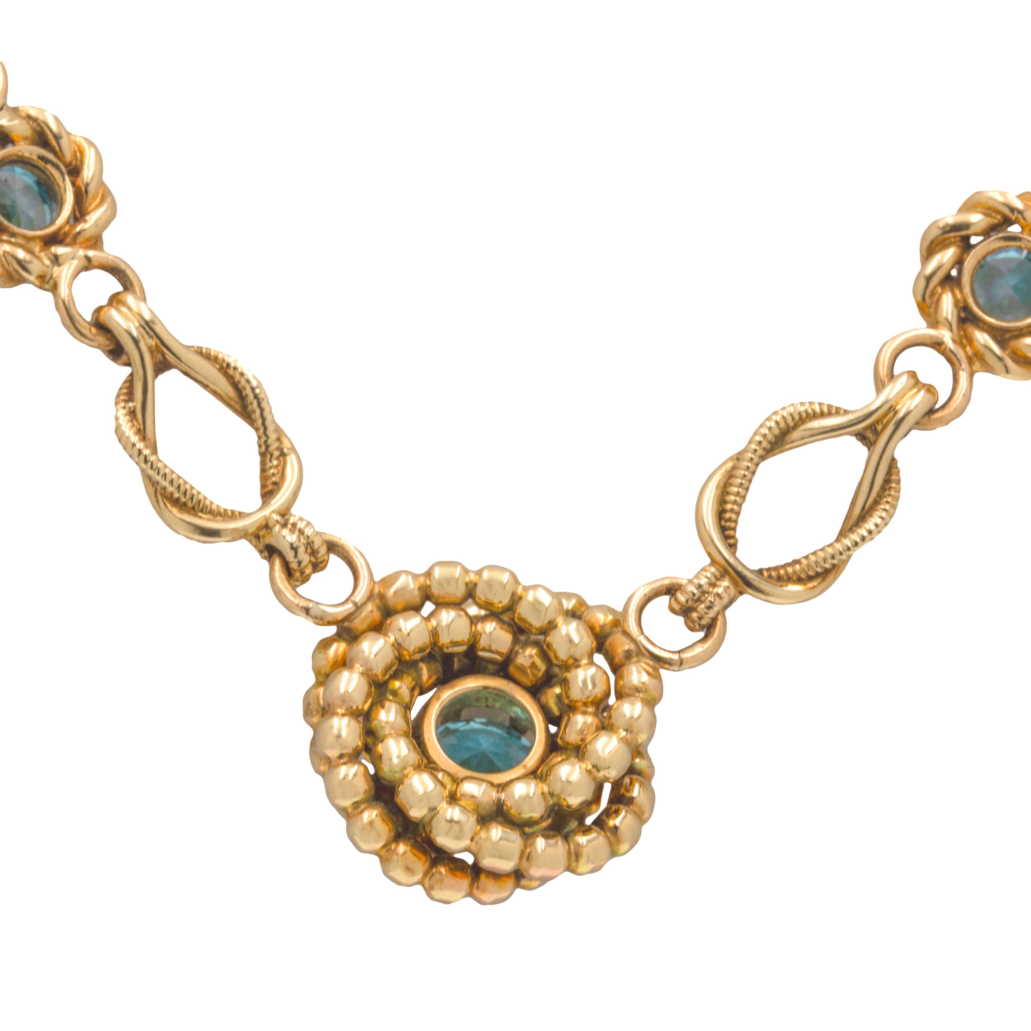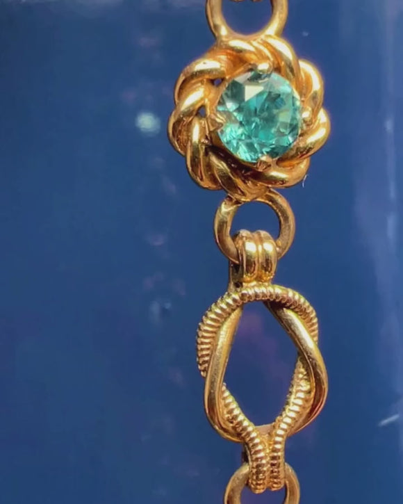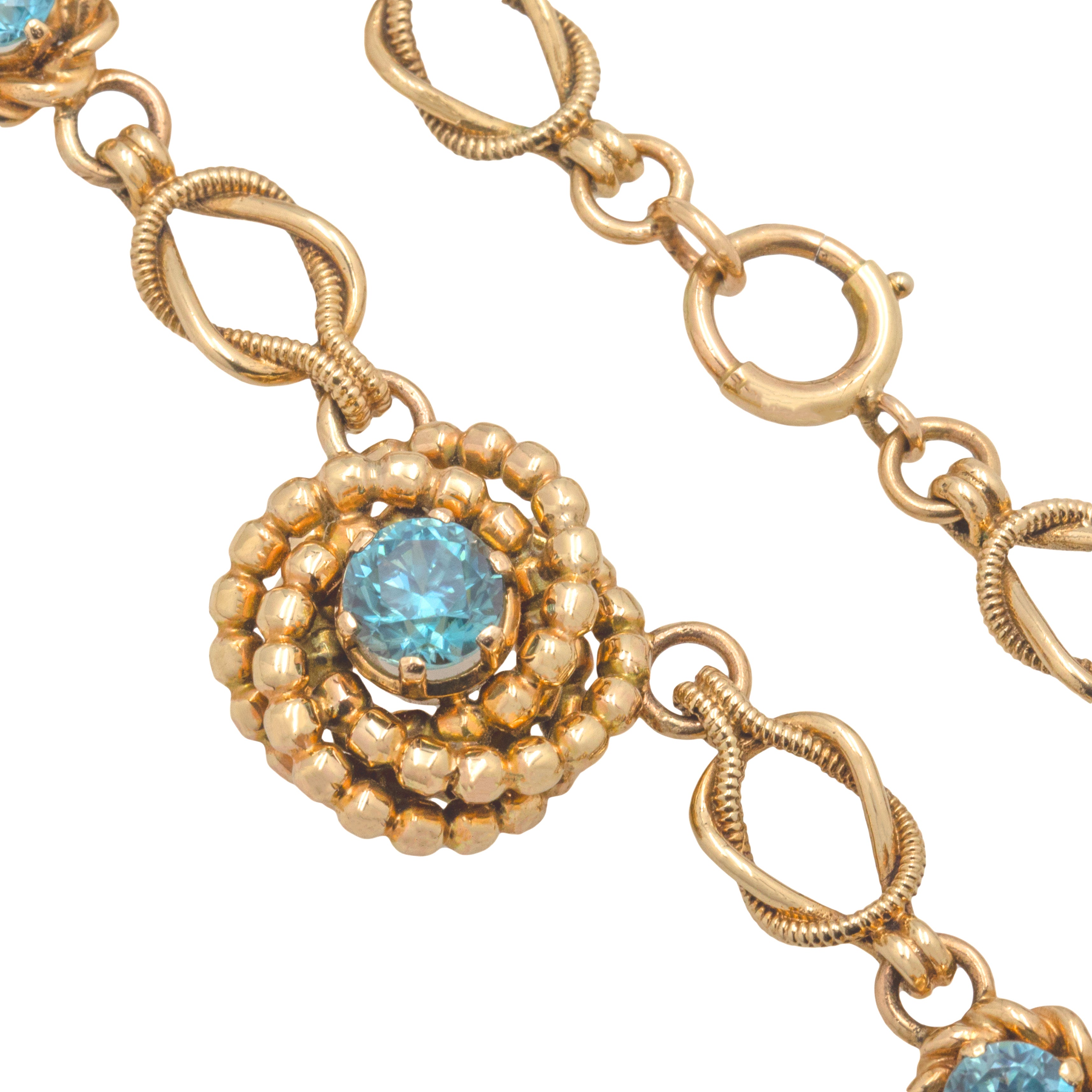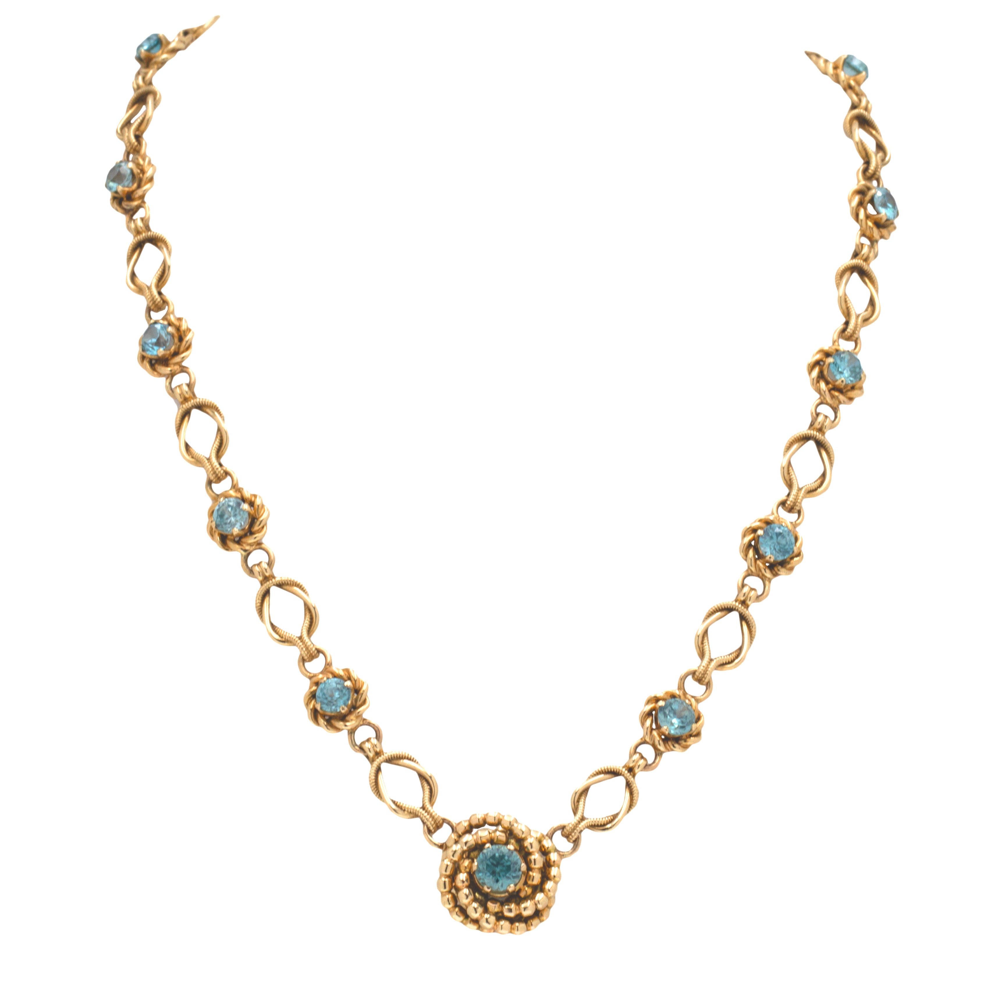 Prepare to be starstruck by the sheer beauty of this 9ct Gold Blue Zircon necklace! A display of fine Vintage craftsmanship, her 16-inch length is formed of historical lover's knot links alternating with 12 Blue Zircons, haloed by rope detailing, creating a breathtaking necklace sure to grab the attention of any onlookers.
