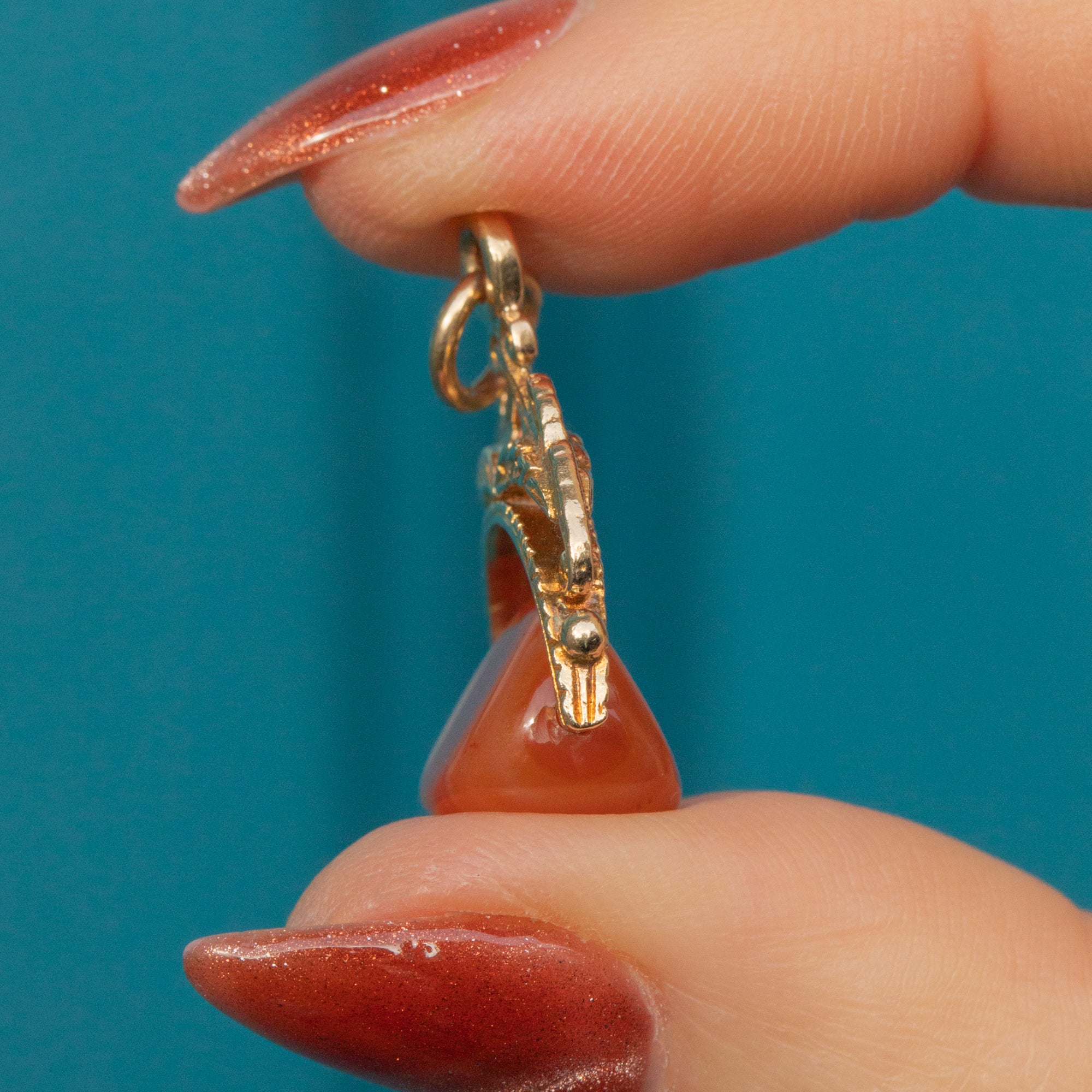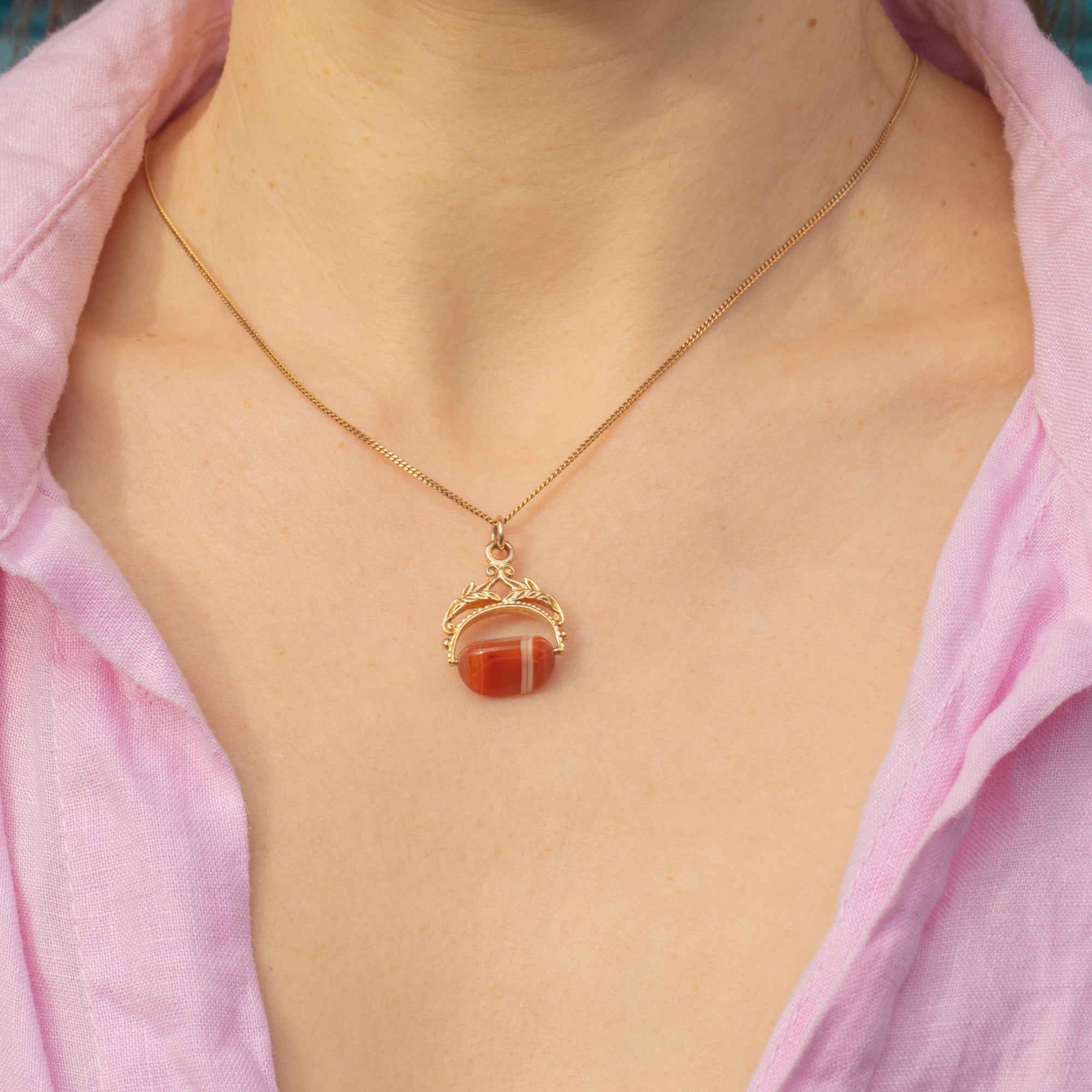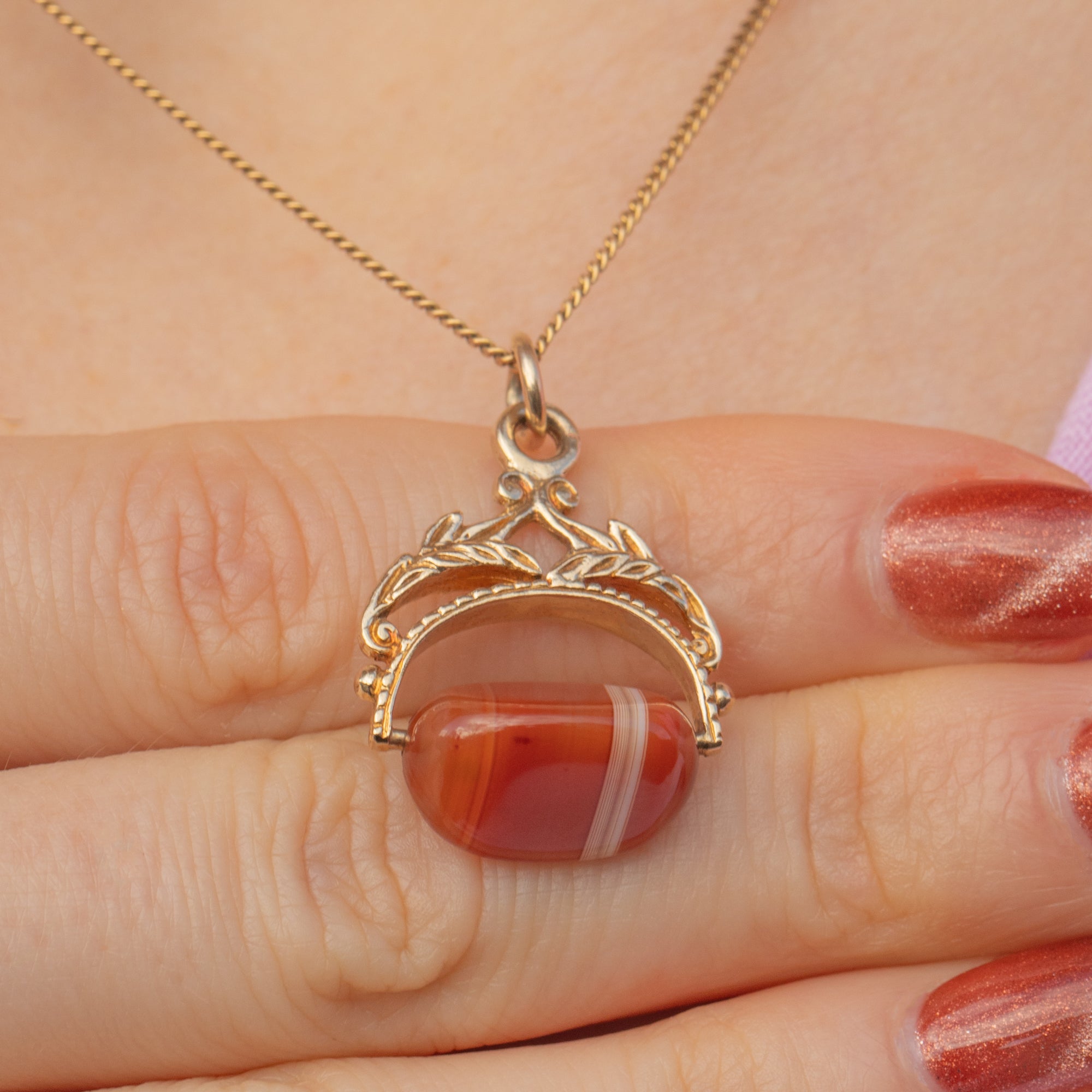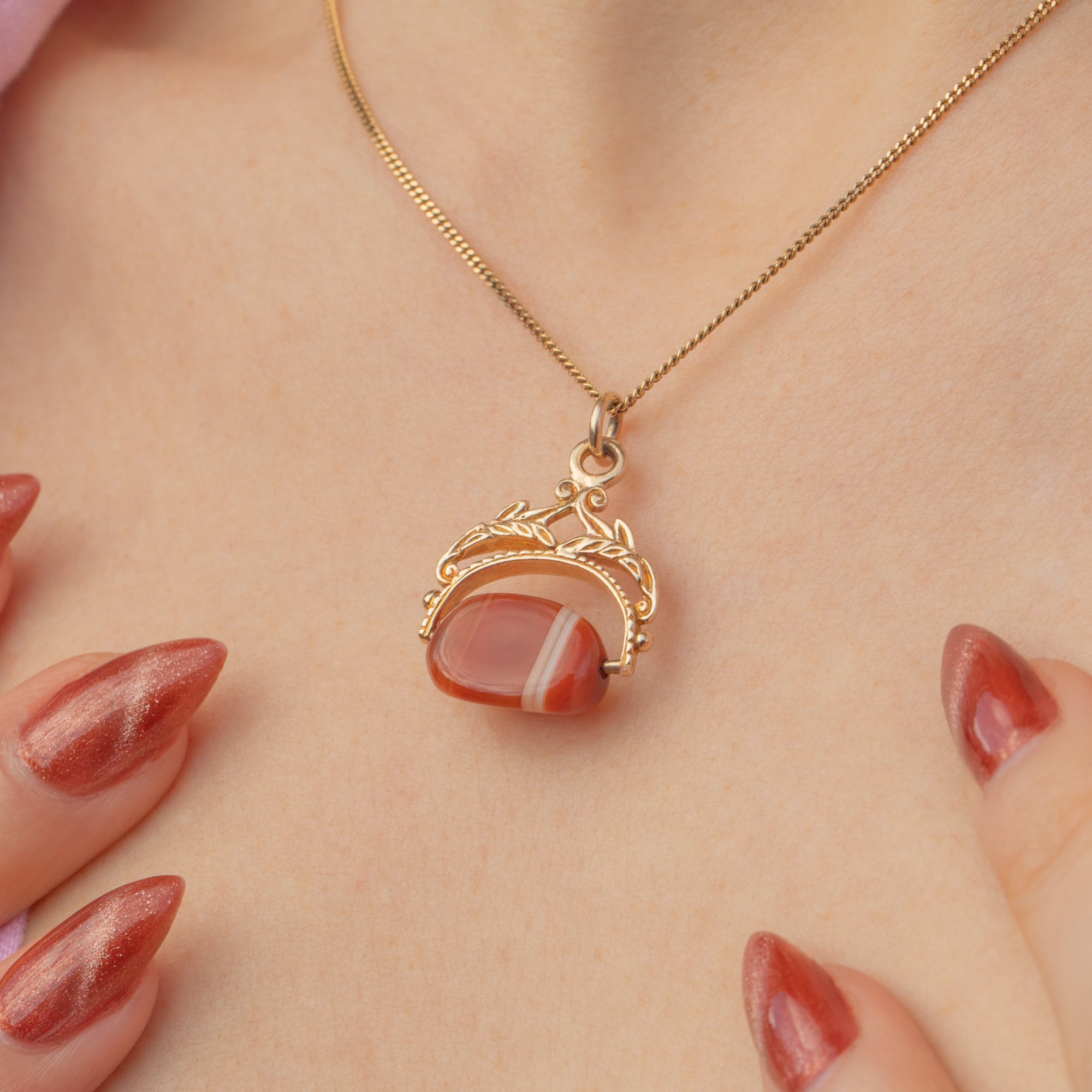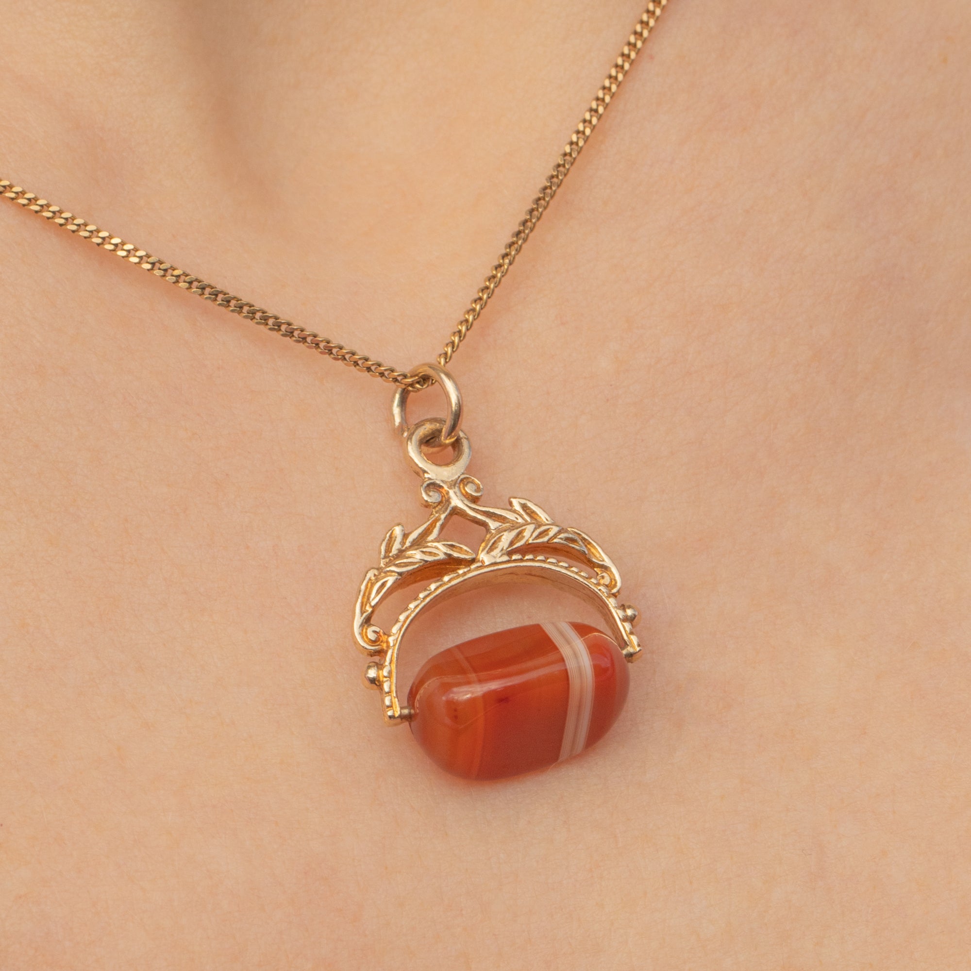 This striking 9ct Gold Carnelian spinner fob pendant will provide you with endless wearing pleasure! The body of the fob has been beautifully formed from 9ct Gold with delicate leaf details sweeping over the vibrant Carnelian.