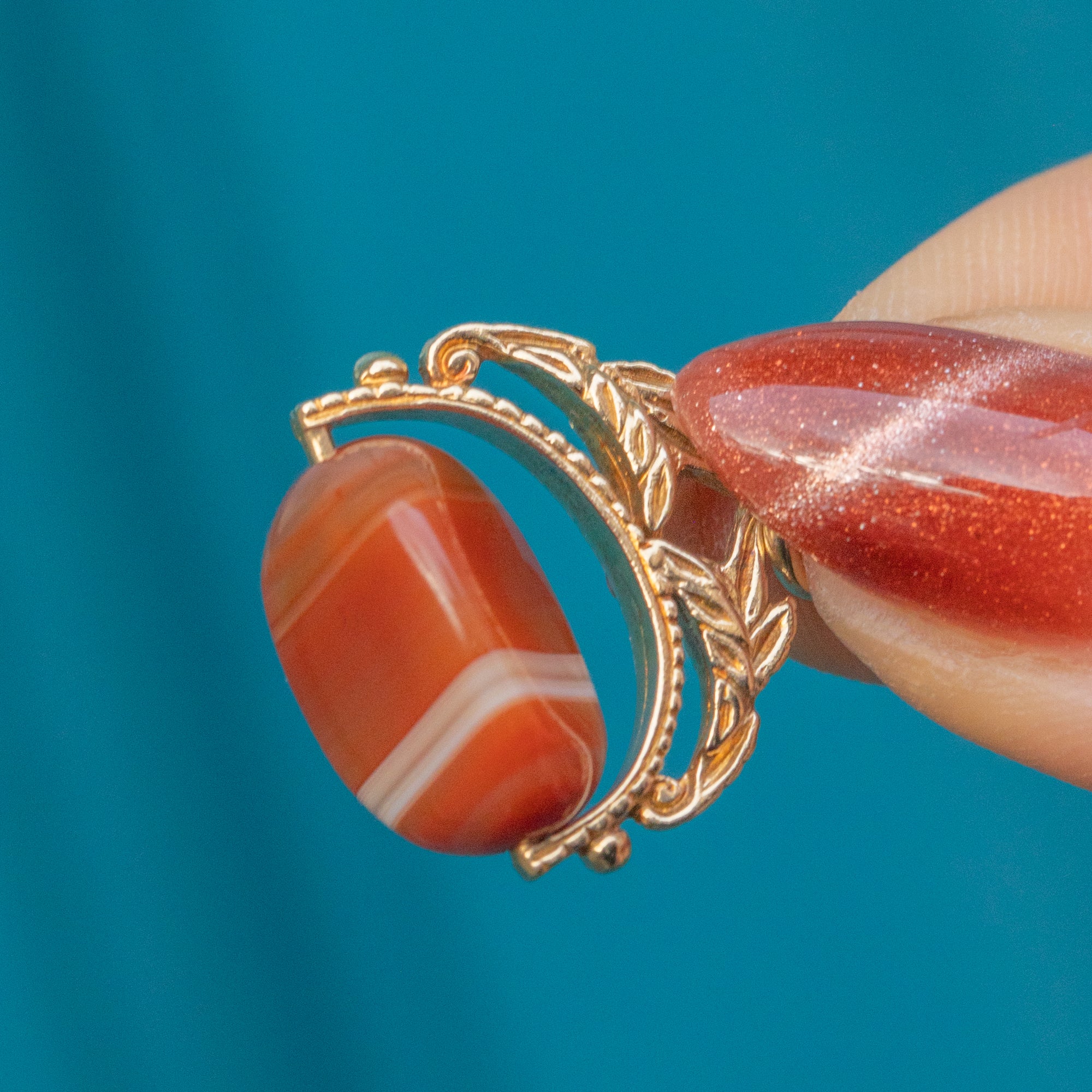 The smoothly cut Carnelian boasts a terracotta orange hue, with a double white band running around the stone off-centre, creating a visually interesting effect guaranteed to please. The Carnelian spins freely making this vintage fob a tactile and fun piece to add to your collection!