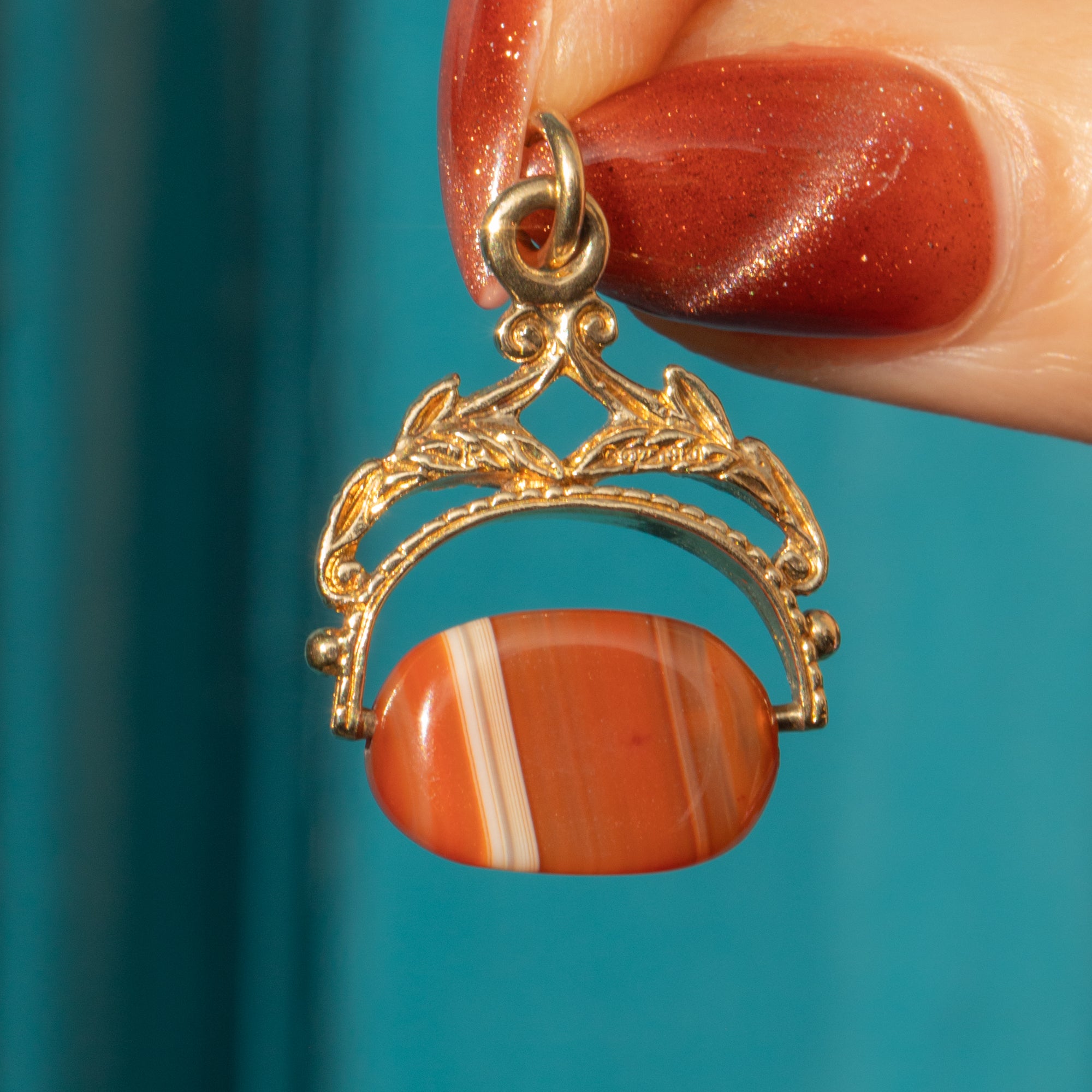 EXCELLENT. This 9ct Gold Orange Agate spinner fob pendant is in excellent condition. The Agate is satisfyingly smooth with no surface wear to note, is securely set, and spins freely. The Gold is buttery, fully hallmarked, and the details have all remained defined, with no dings or scuffs visible. With lots of wear potential, you will enjoy this vintage Carnelian fob for years to come!