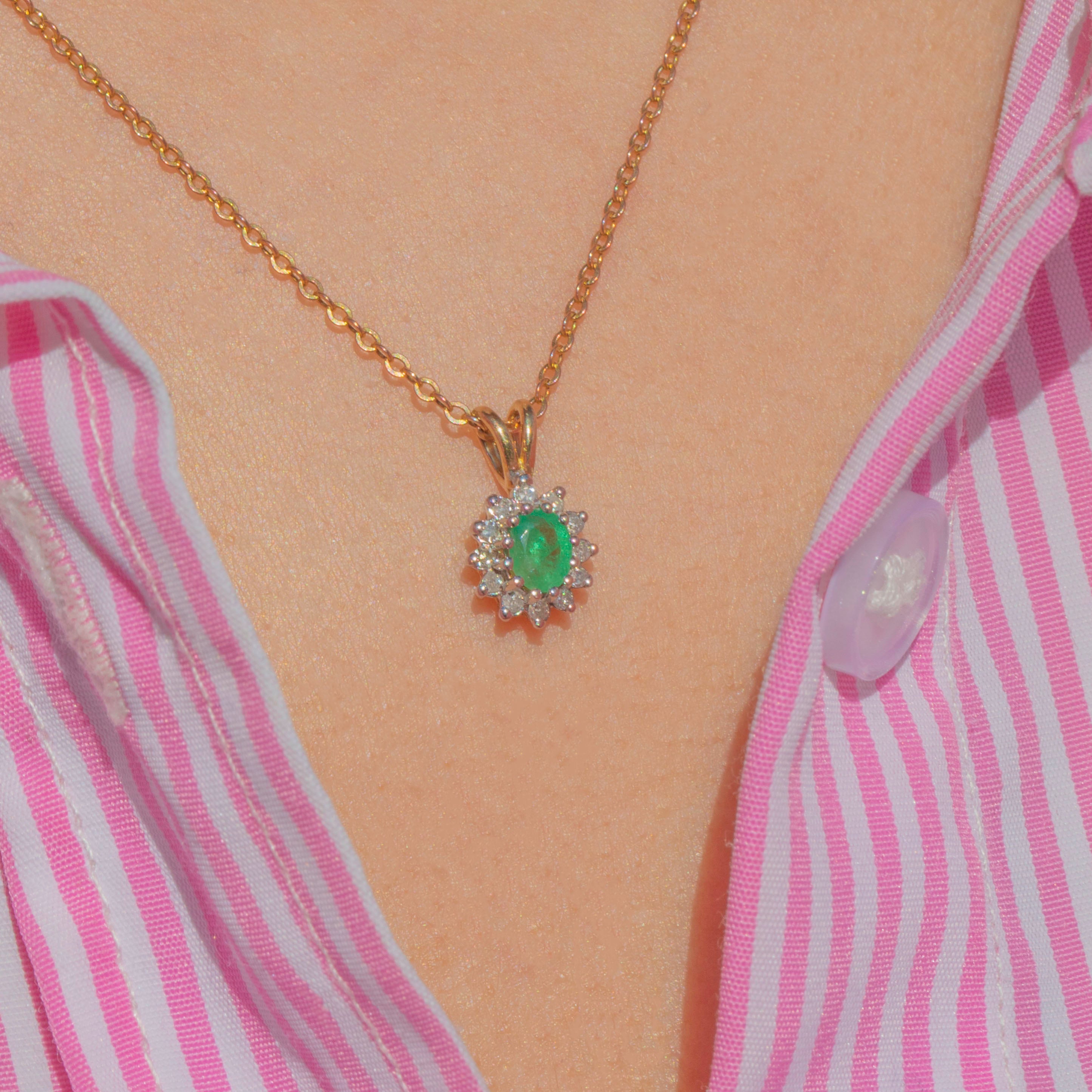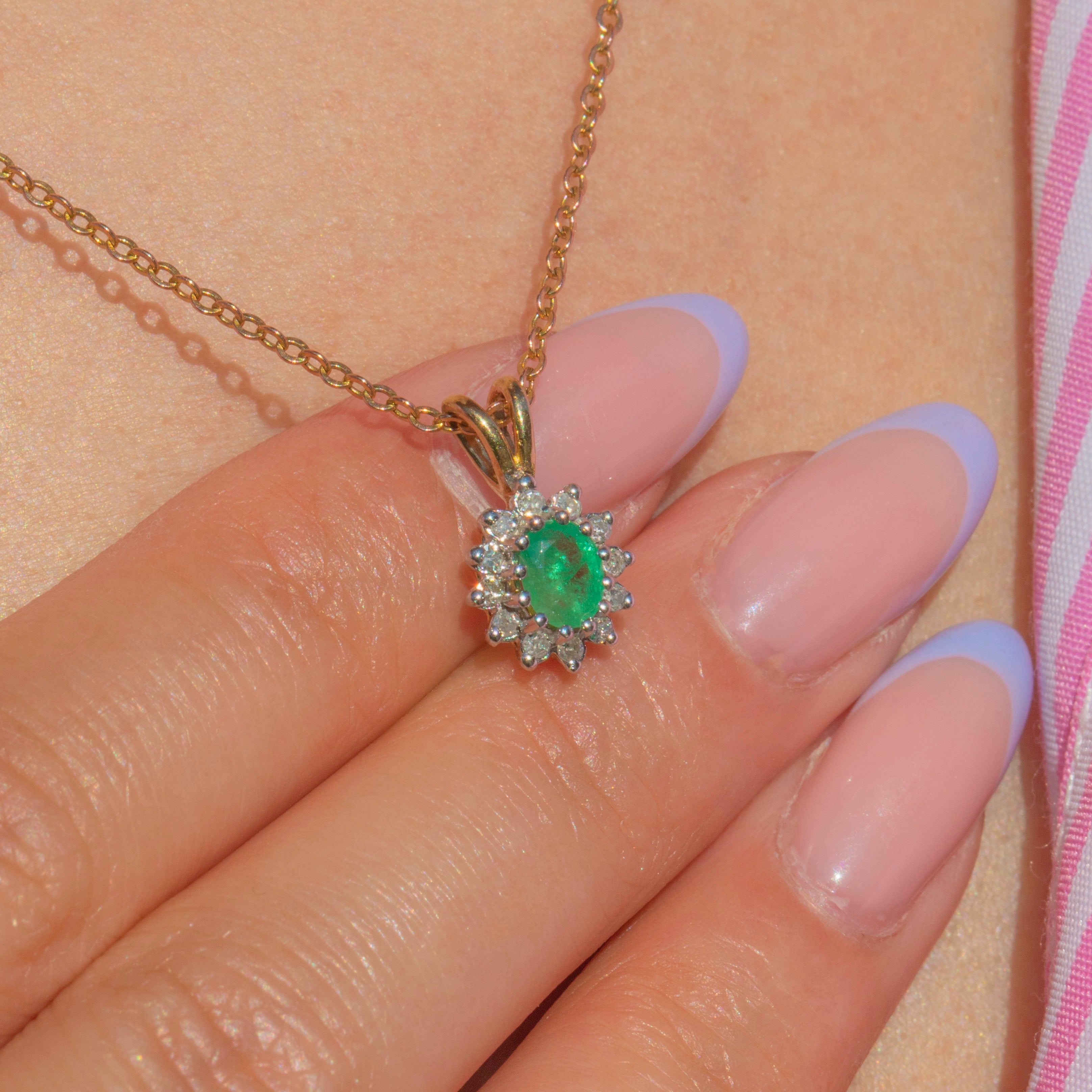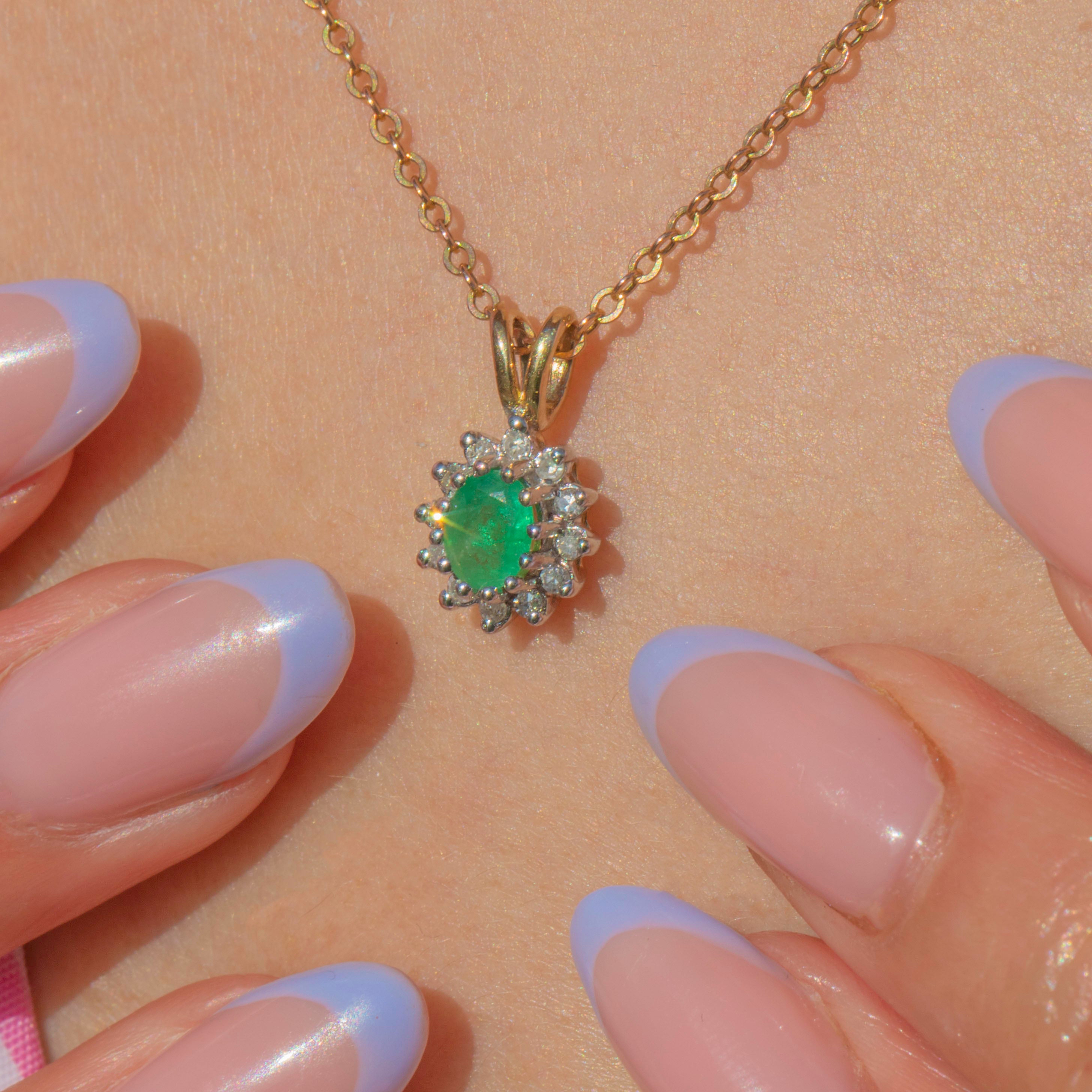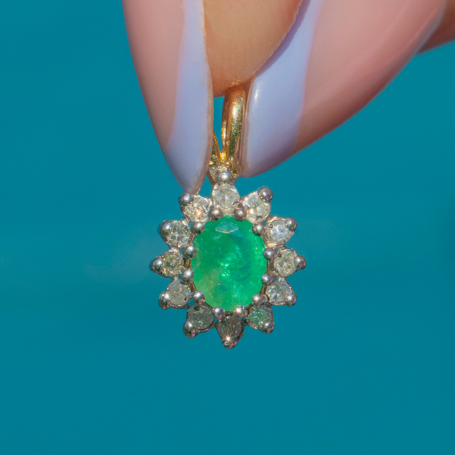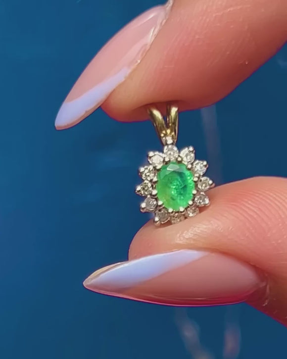 EXCELLENT: This 9ct Gold Emerald Diamond cluster charm is in excellent condition. Each of her gemstones is radiant, with no chips or abrasions, and set securely within its setting. With a secure bale, you can wear this vintage charm with confidence!