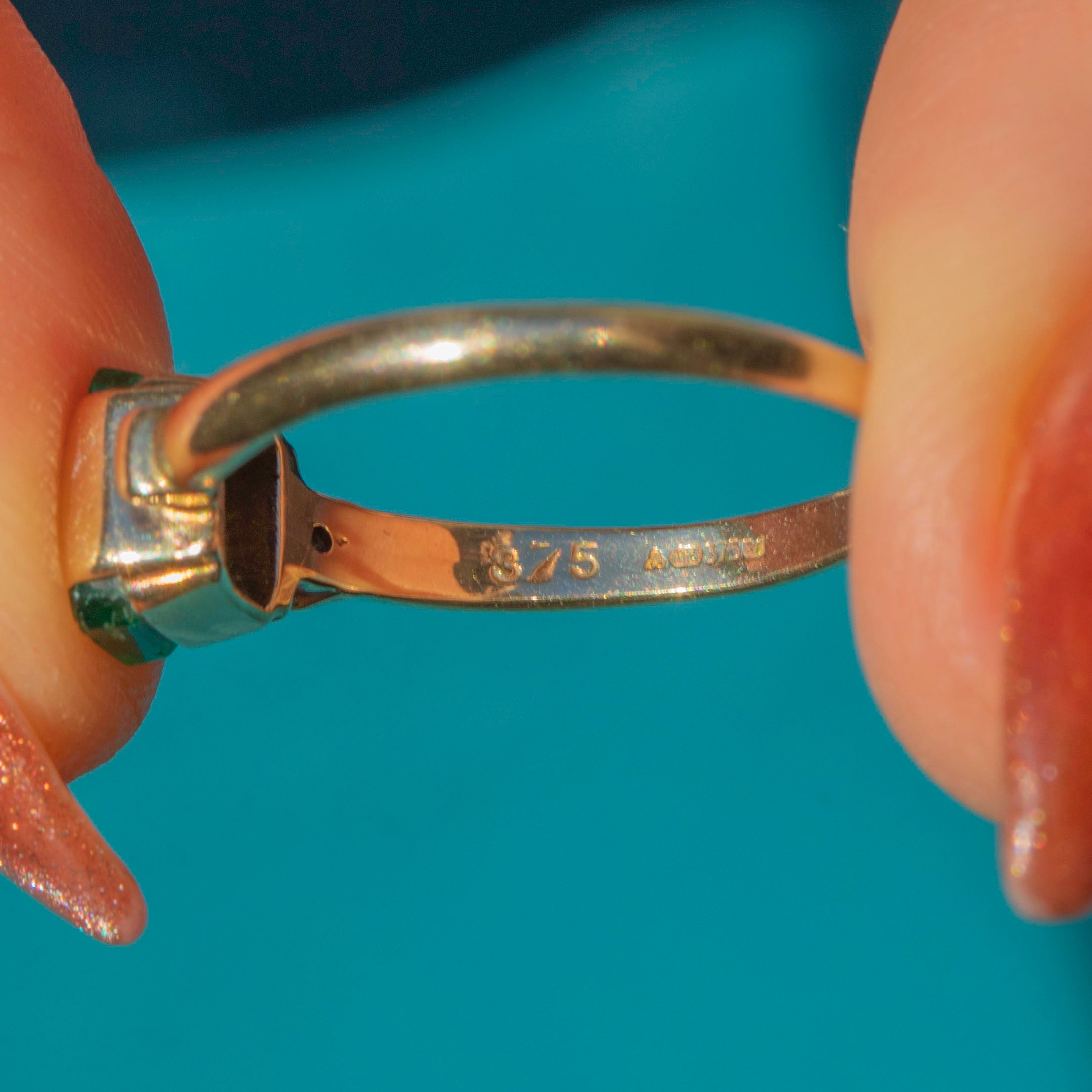 VERY GOOD: This 9ct Gold Emerald and Diamond ring is in very good condition. Each of her gemstones are radiant and set securely within their settings. There are some fleabites to the Emerald, though this is difficult to spot without a loupe. There is also a slight thinning towards the back of the band, however she remains secure. In very good condition, she is a must-have.