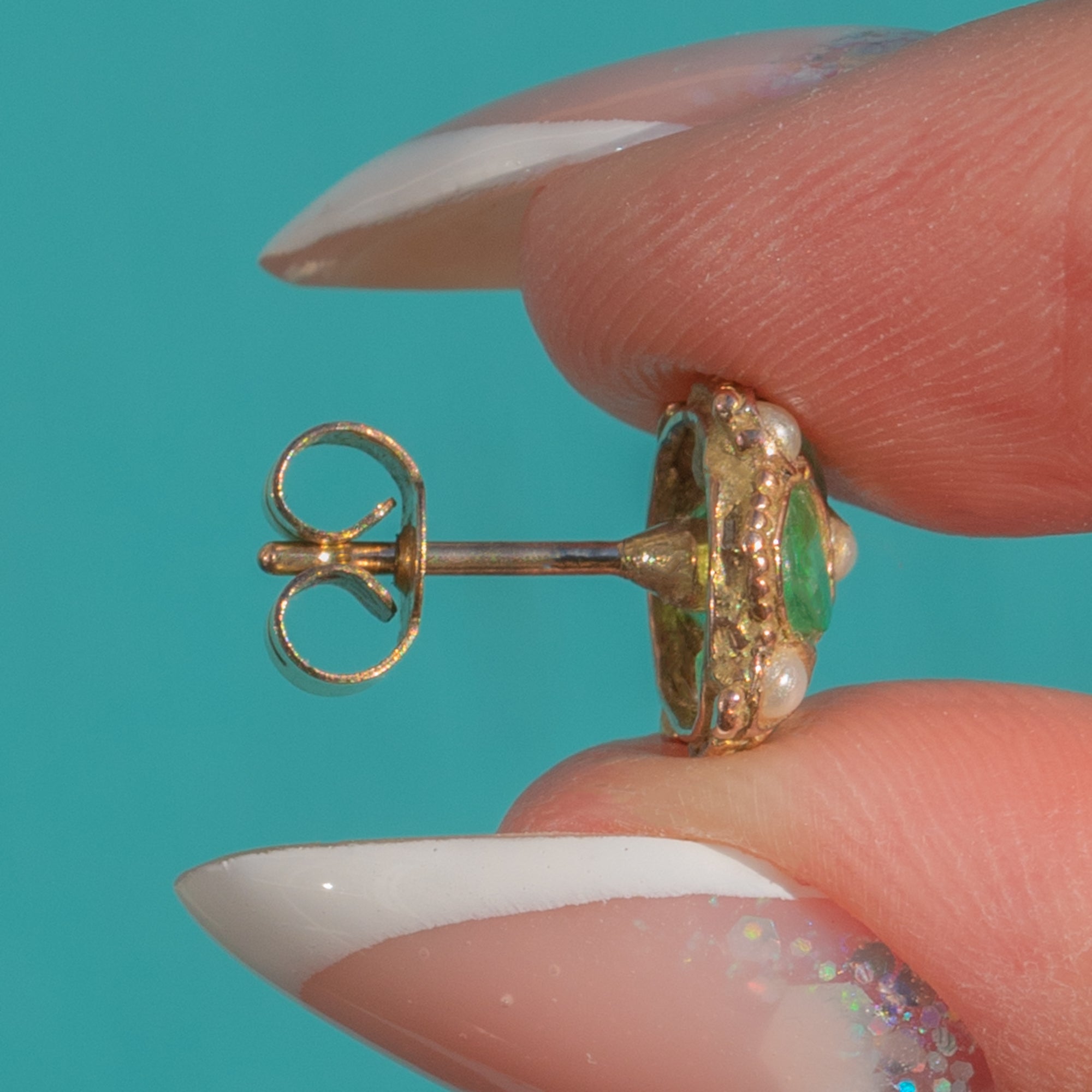The rich green hues and pretty pinched-gold settings create a beautifully antique feel, while their neat size makes them effortless for everyday wear. With their original Victorian character and wonderfully feminine presence, these earrings bring a touch of timeless elegance to any look.