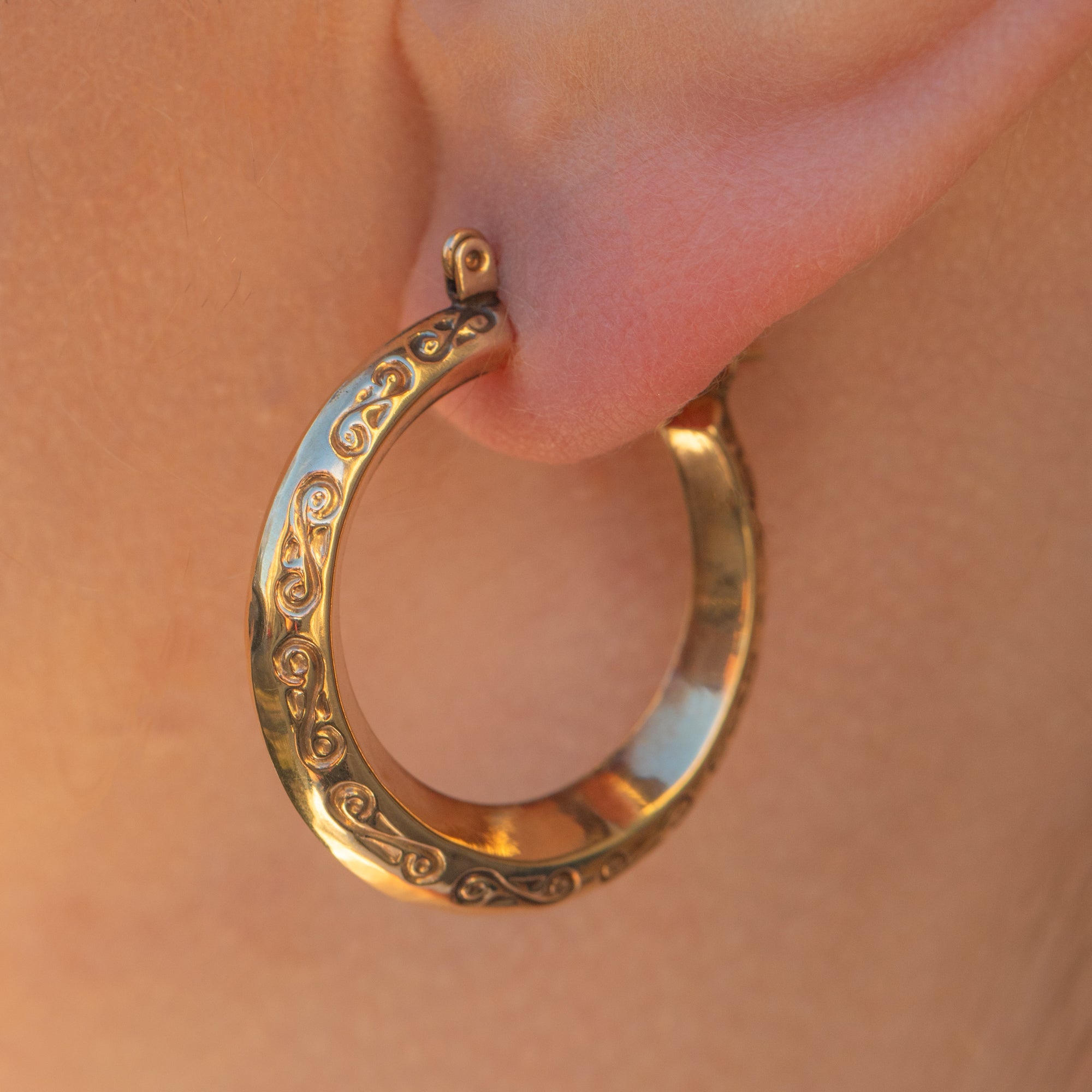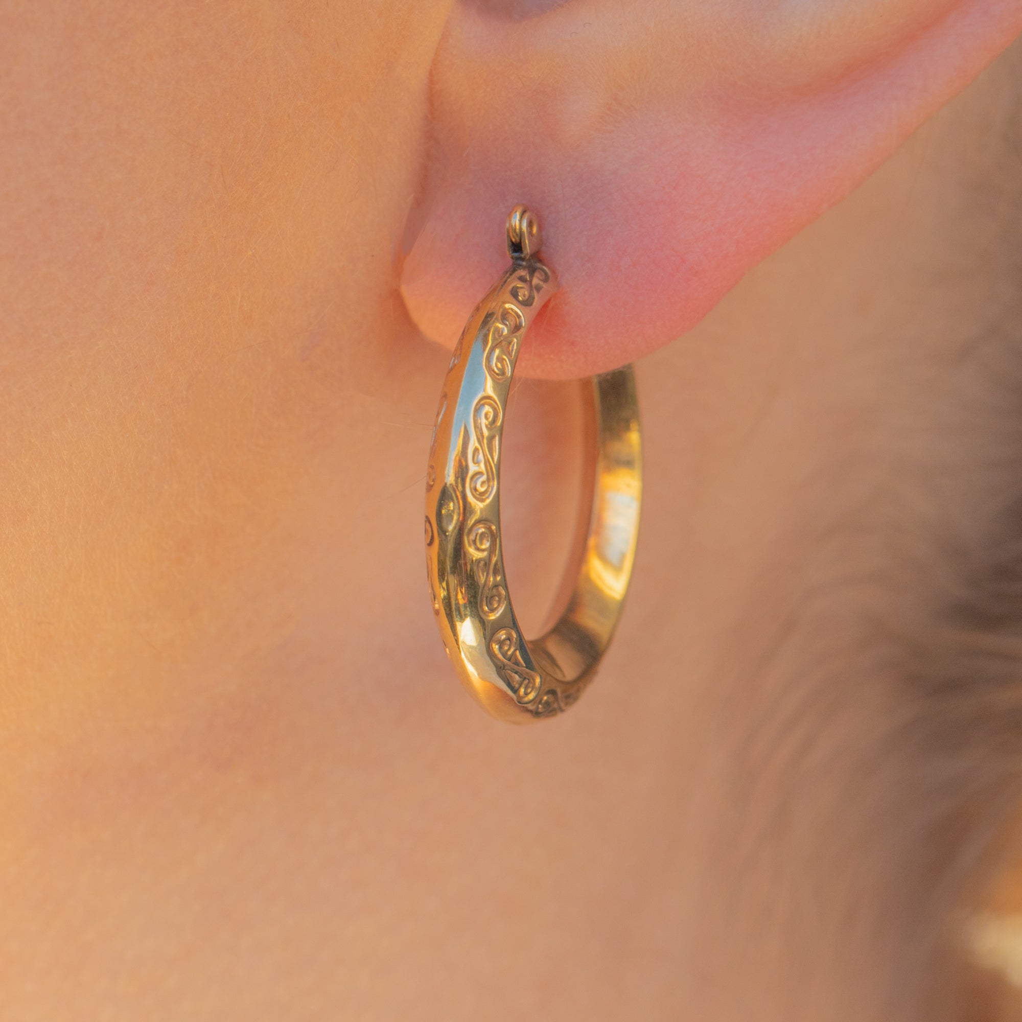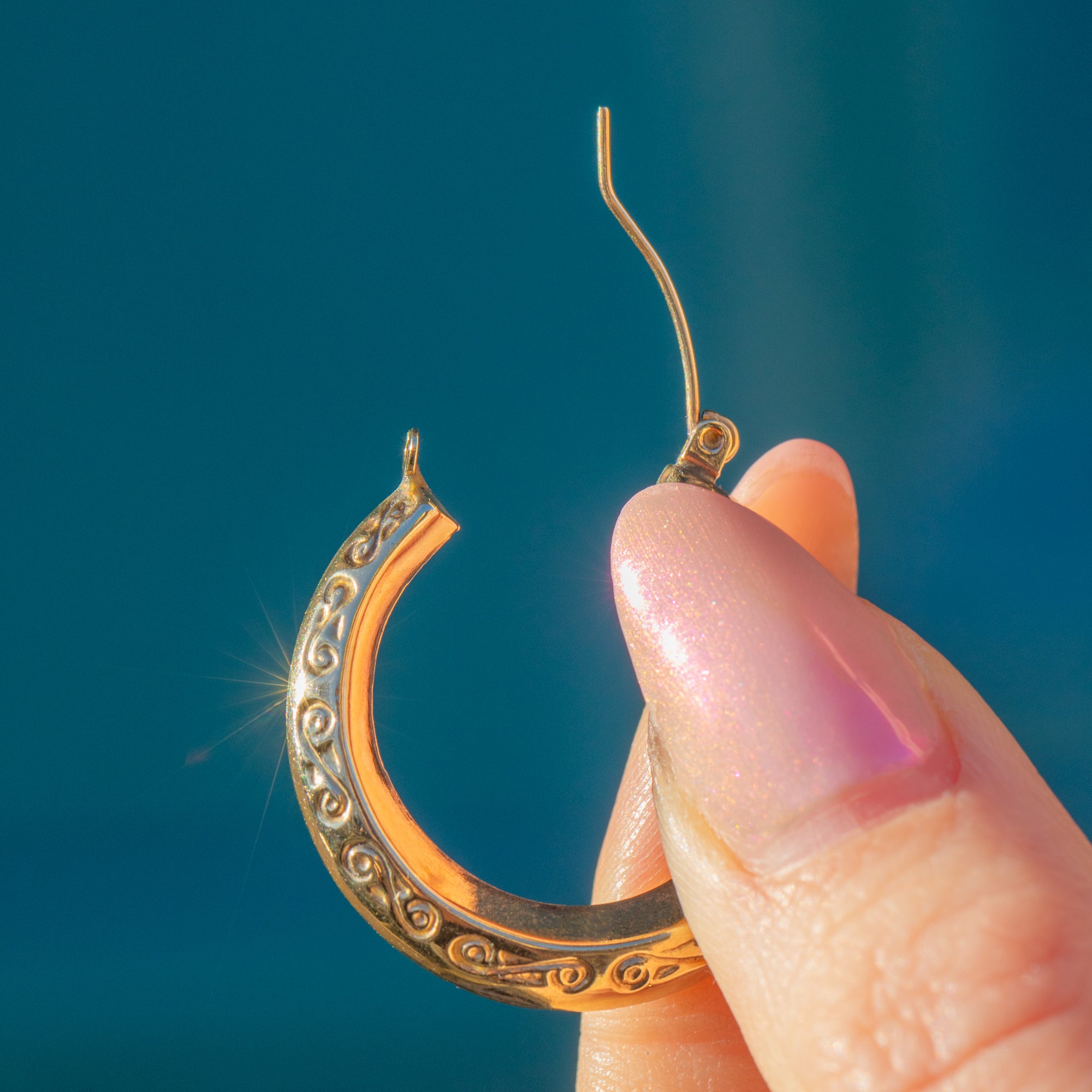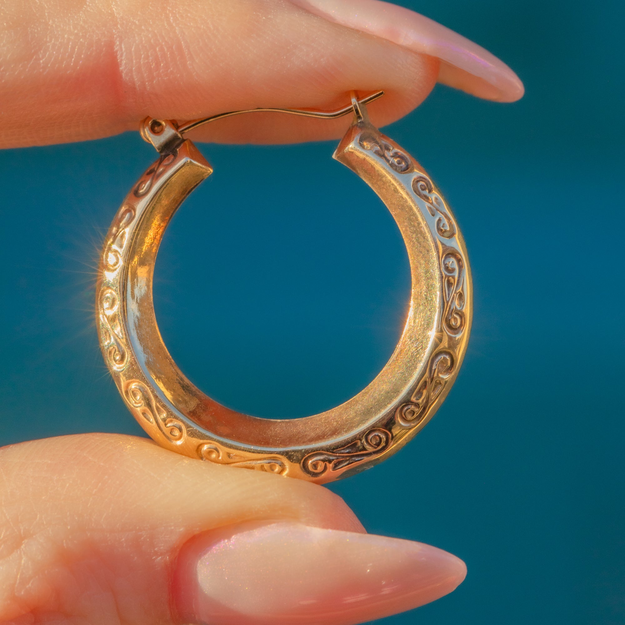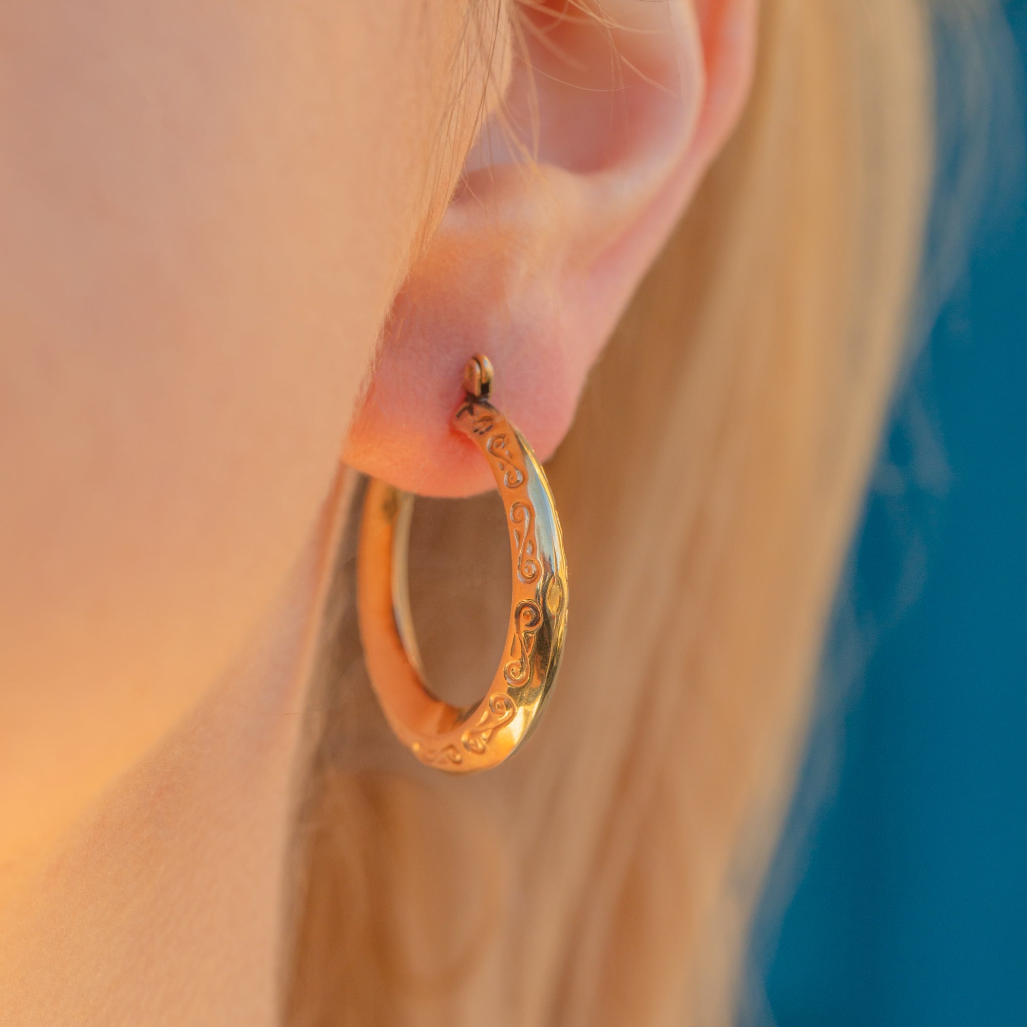 VERY GOOD. This pair of 9ct Gold engraved hoop earrings are in very good condition. The earrings have kept their shape well, and despite a small ding to the base of each earring, you cant see this when you wear them. Some, but not all, of the swirly details have accrued a patina, but this is only an aesthetic feature that is visible up close.