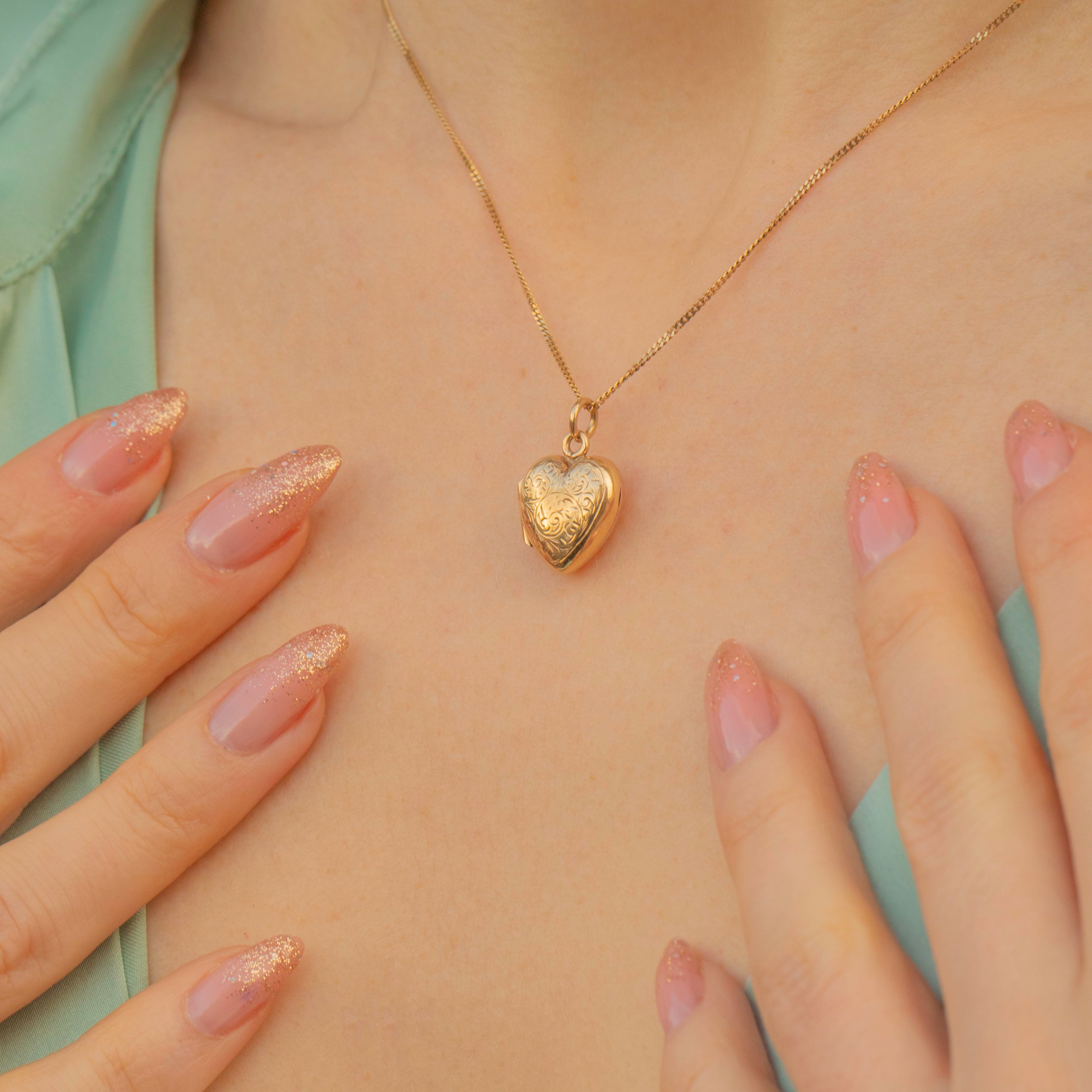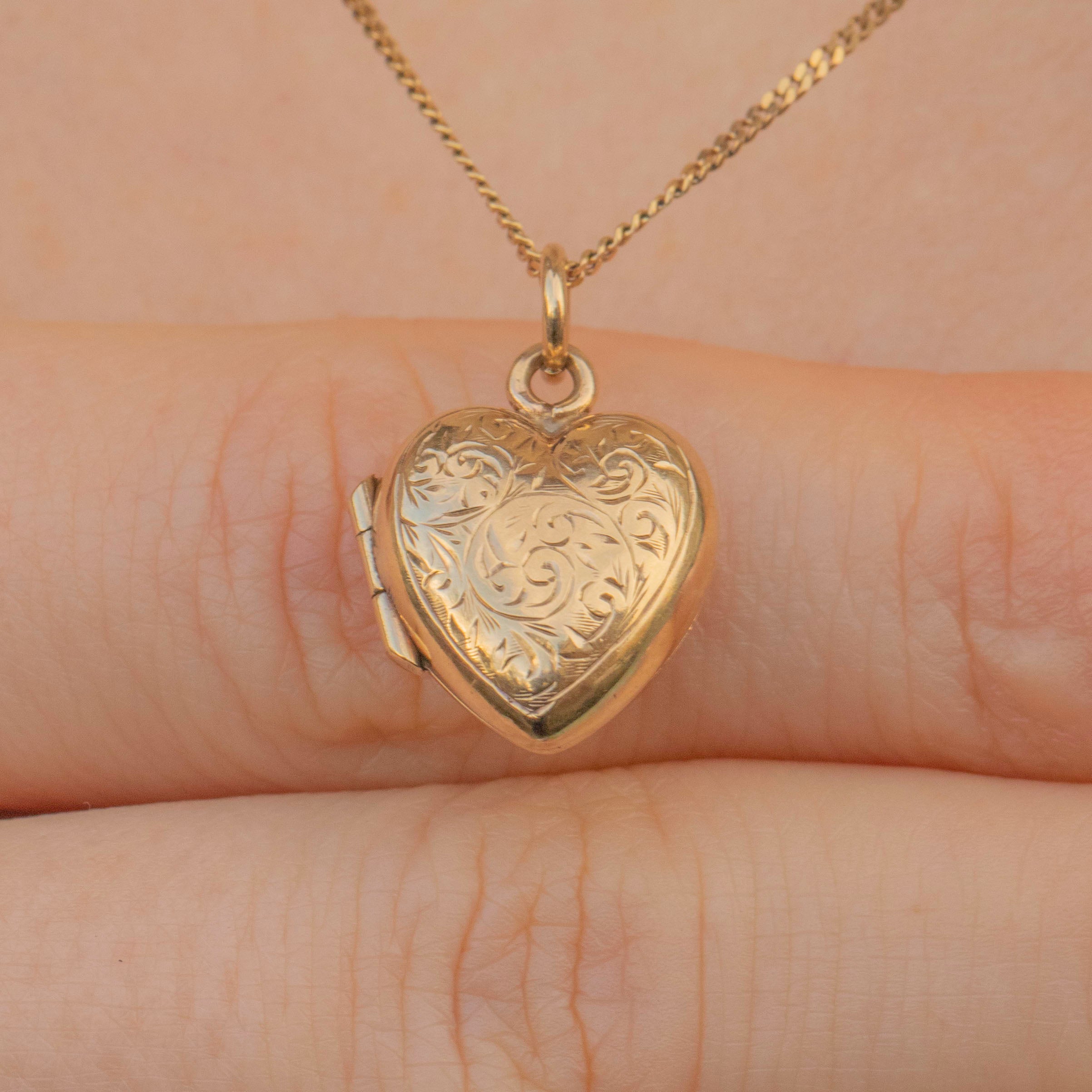 EXCELLENT This 9ct Gold Engraved Mini Heart Locket is in superb condition, with its intricate acanthus leaf engravings perfectly preserved. Tiny age-related dings blend seamlessly into the design, remaining unnoticeable when worn. It opens easily and secures tightly, keeping your treasured keepsakes safe and close to your heart.