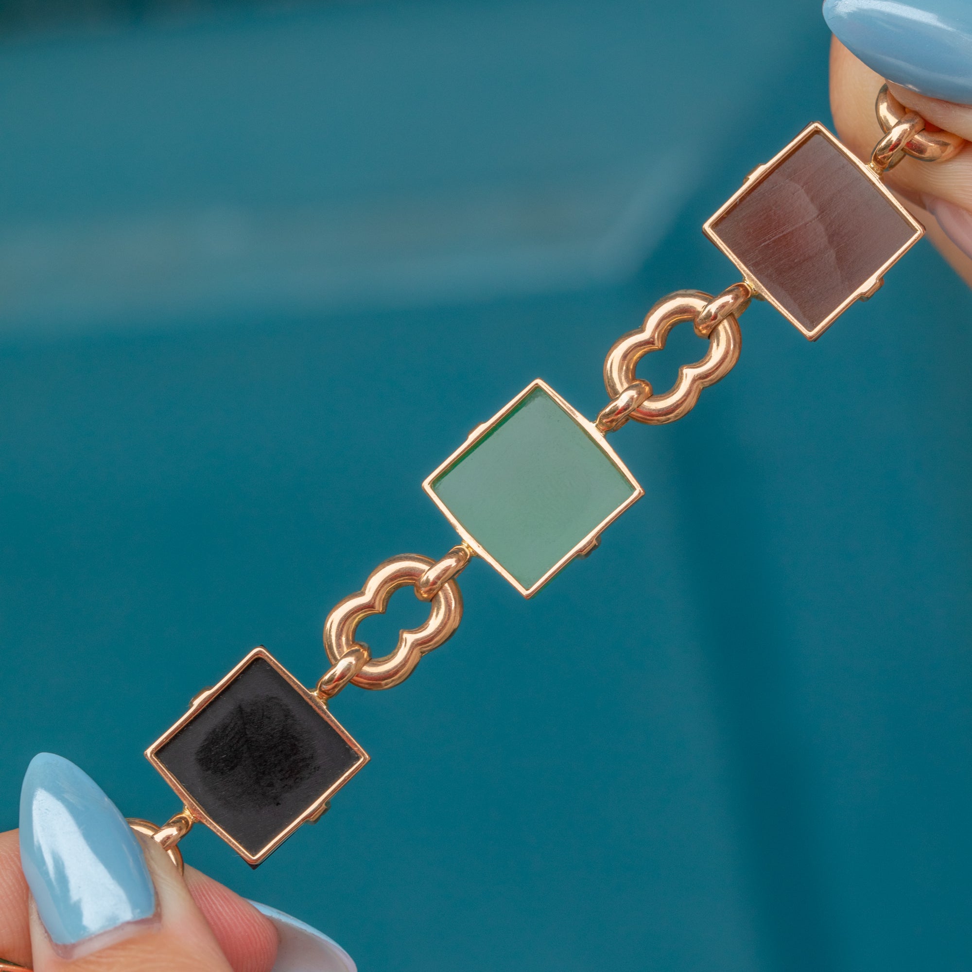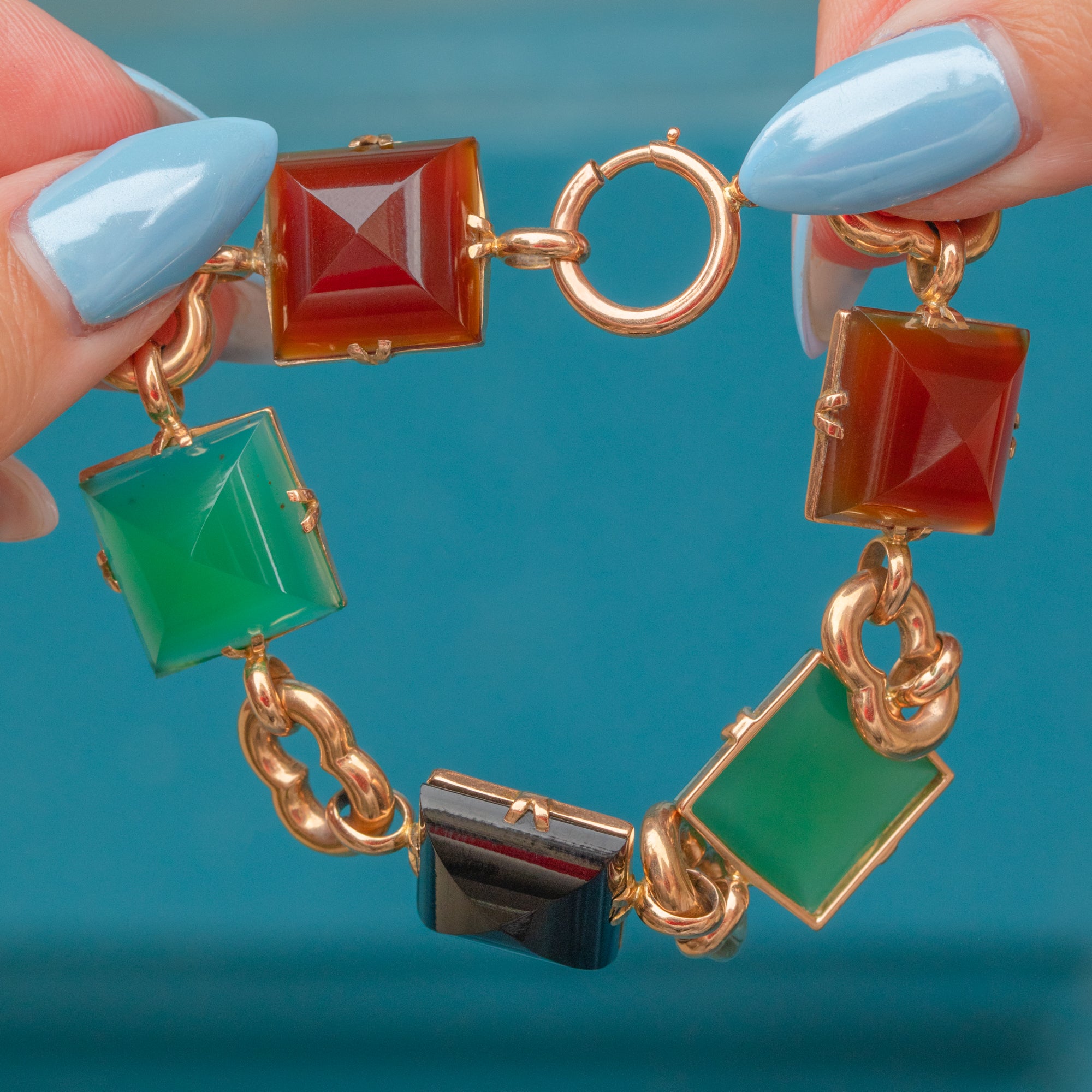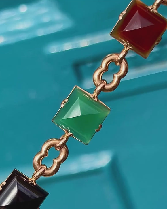 If you are looking for a standout piece of jewellery that exudes luxury, this vintage Agate & Chrysoprase bracelet is a must for your collection! Crafted from solid, buttery 9ct Gold, this mid-century bracelet is inlaid with alternating Agate and Chrysoprase gems, their distinct sugarloaf cuts catching the light beautifully from every angle.