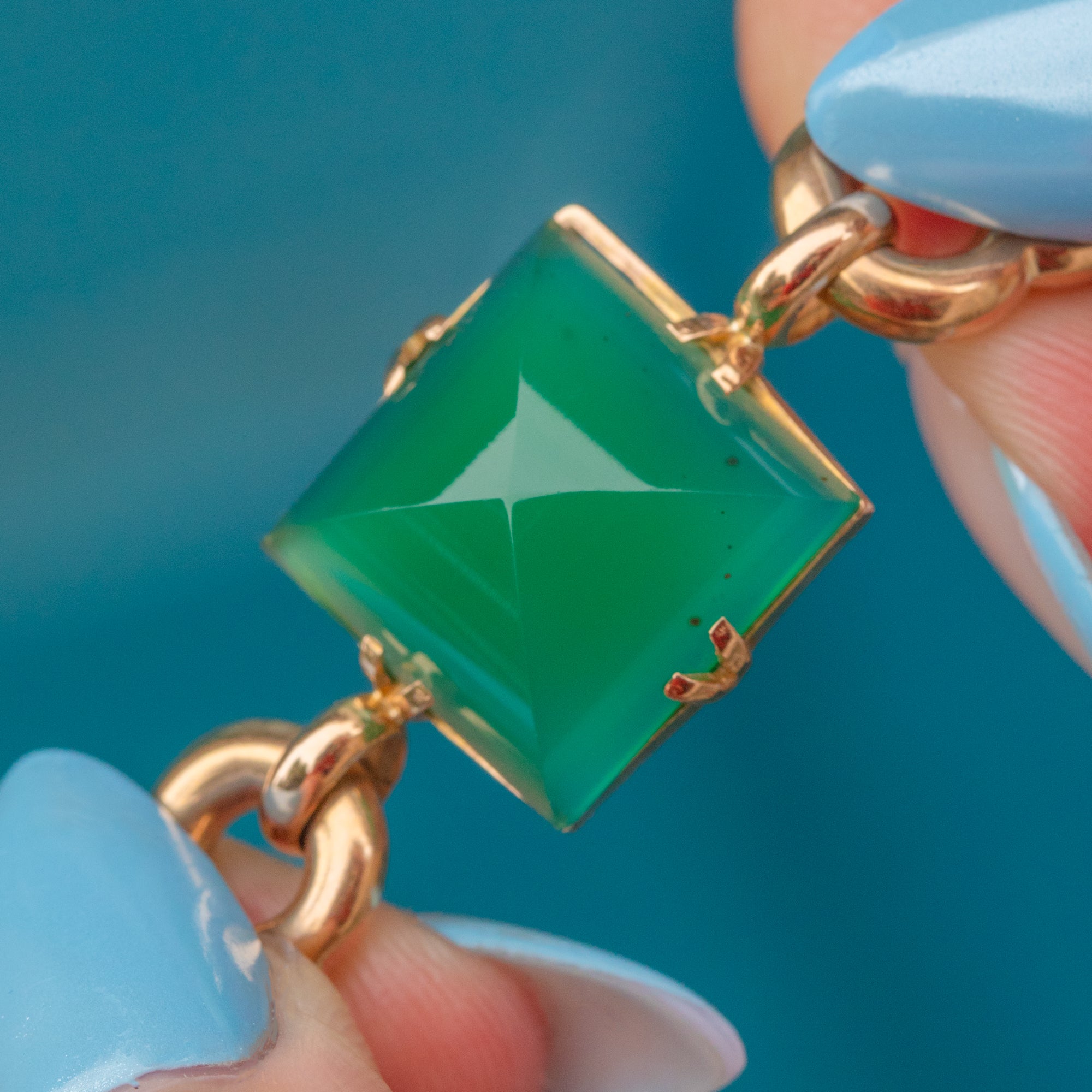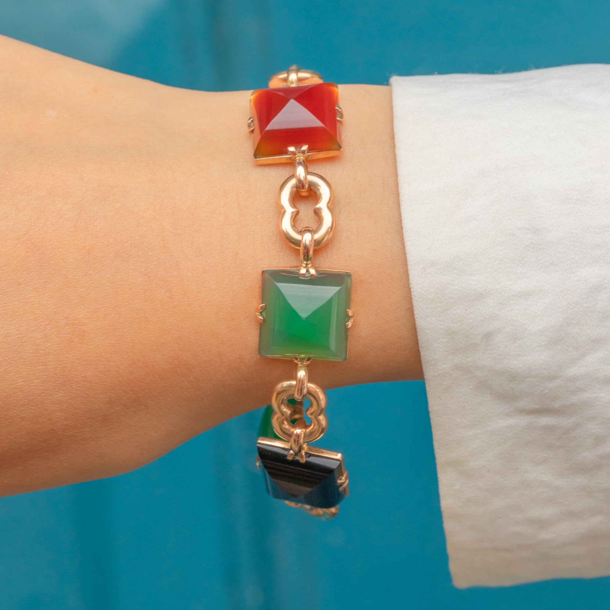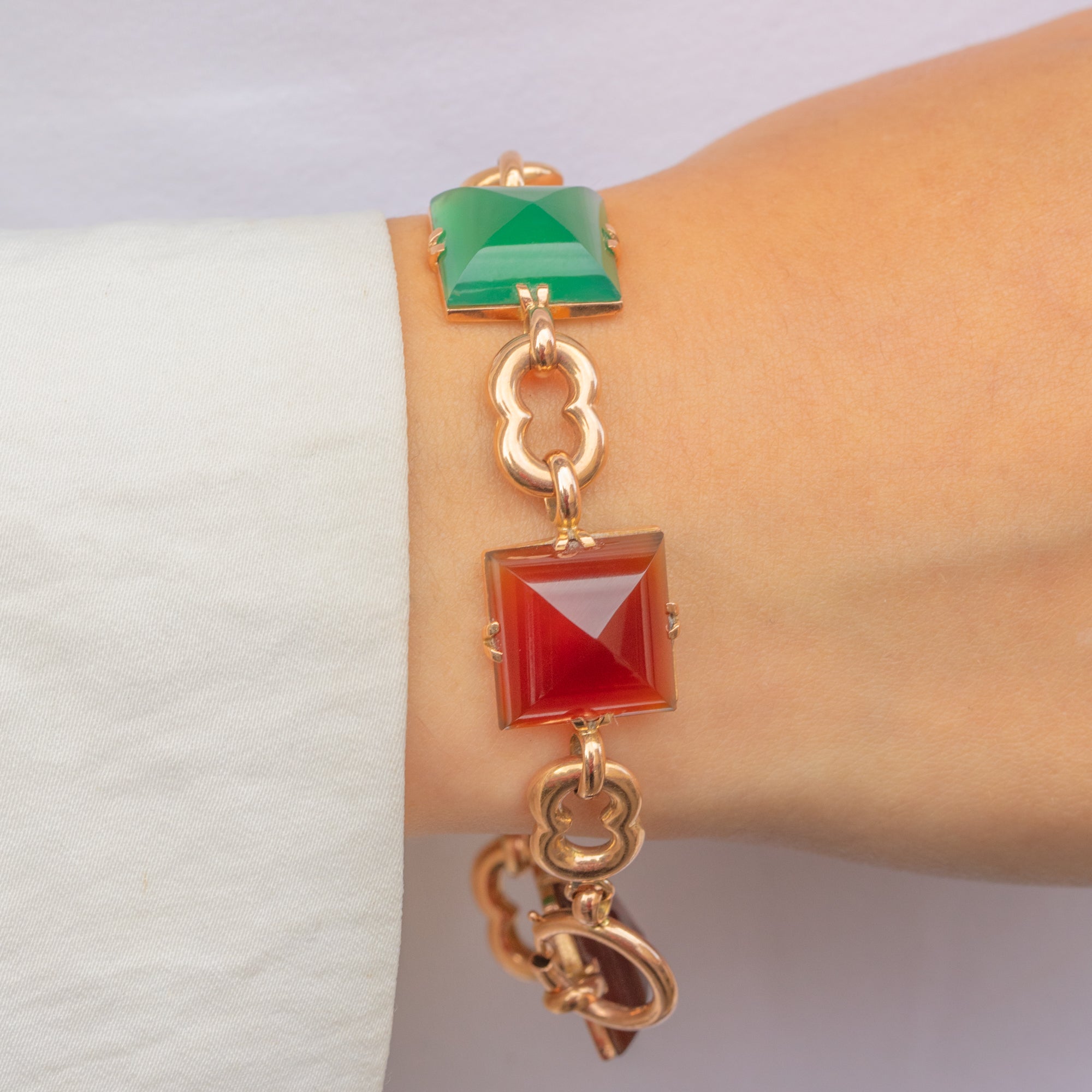 If you are looking for a standout piece of jewellery that exudes luxury, this vintage Agate & Chrysoprase bracelet is a must for your collection! Crafted from solid, buttery 9ct Gold, this mid-century bracelet is inlaid with alternating Agate and Chrysoprase gems, their distinct sugarloaf cuts catching the light beautifully from every angle.