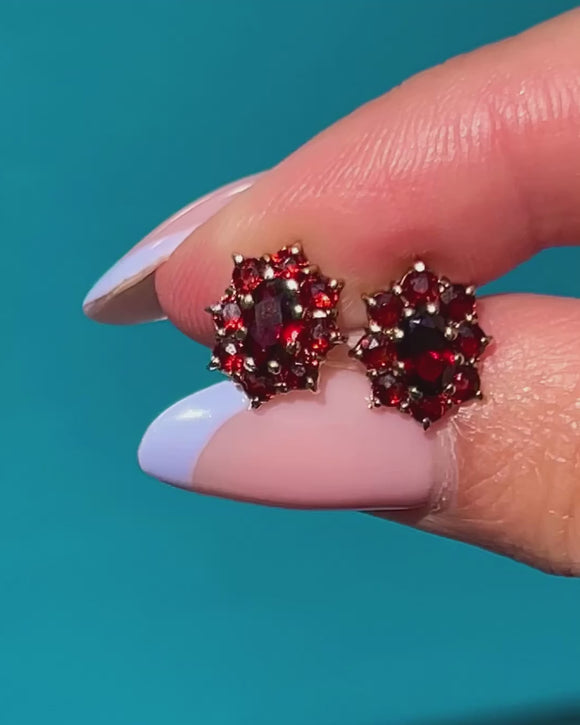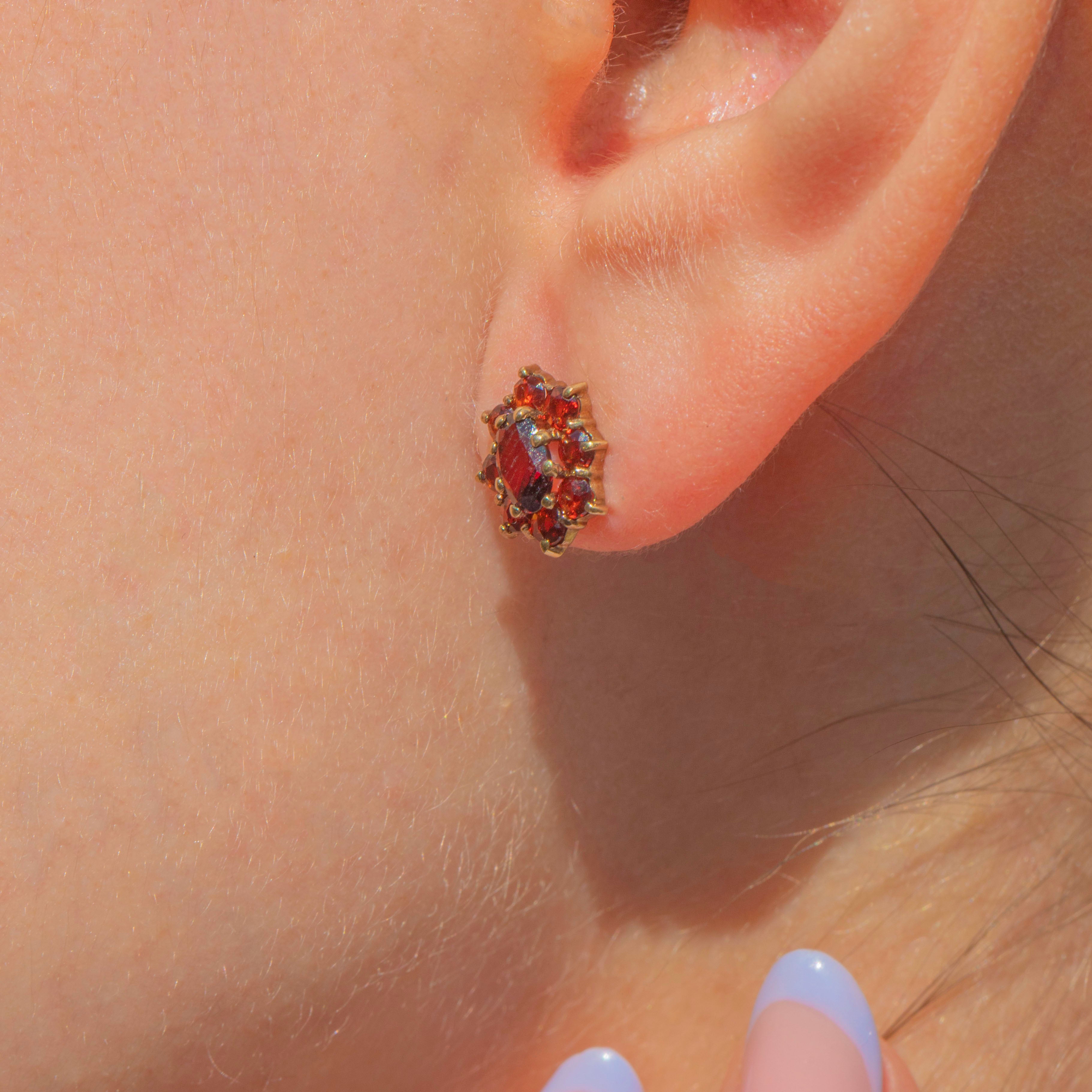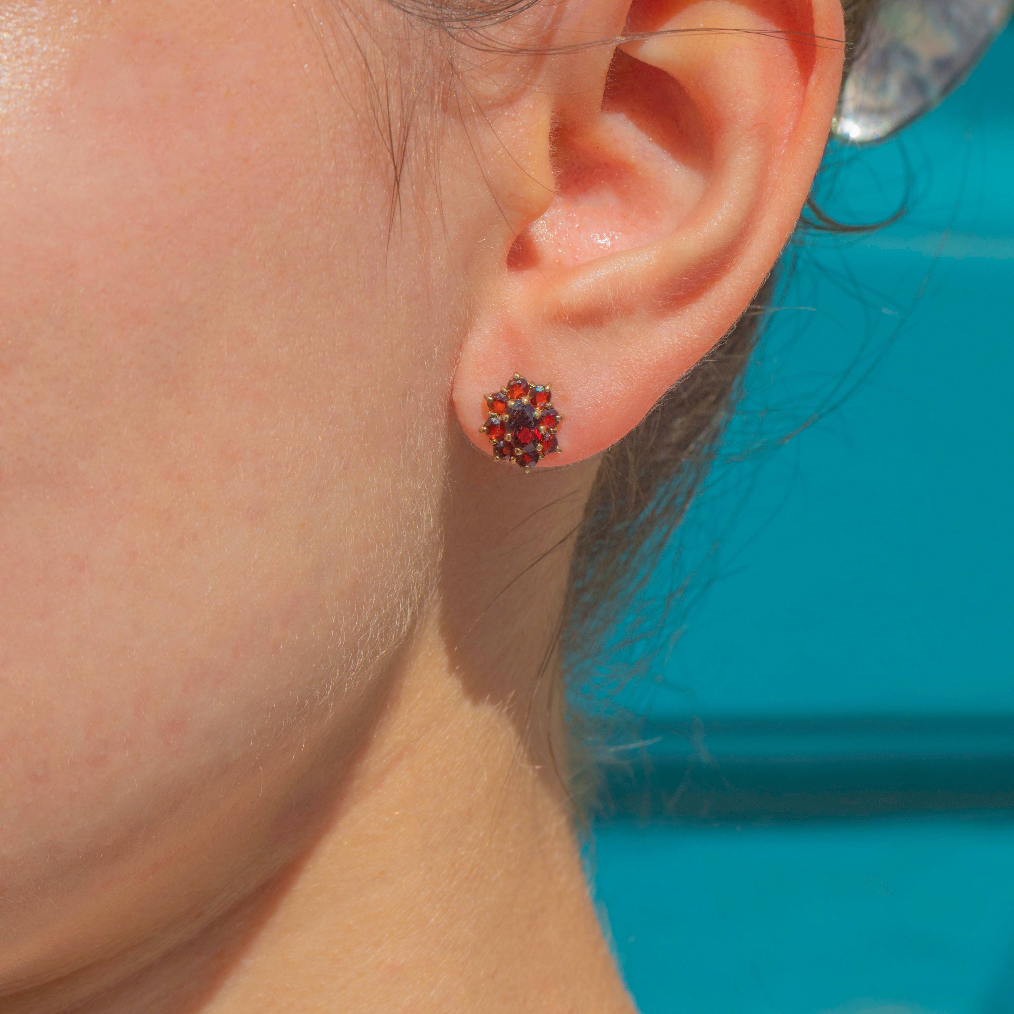 EXCELLENT: These 9ct Gold Garnet flower cluster stud earrings are in excellent condition. Each Garnet is radiant and secure in its setting. With securely attached posts and snug-fitting butterfly backs, these vintage flower studs are a must-have pair!