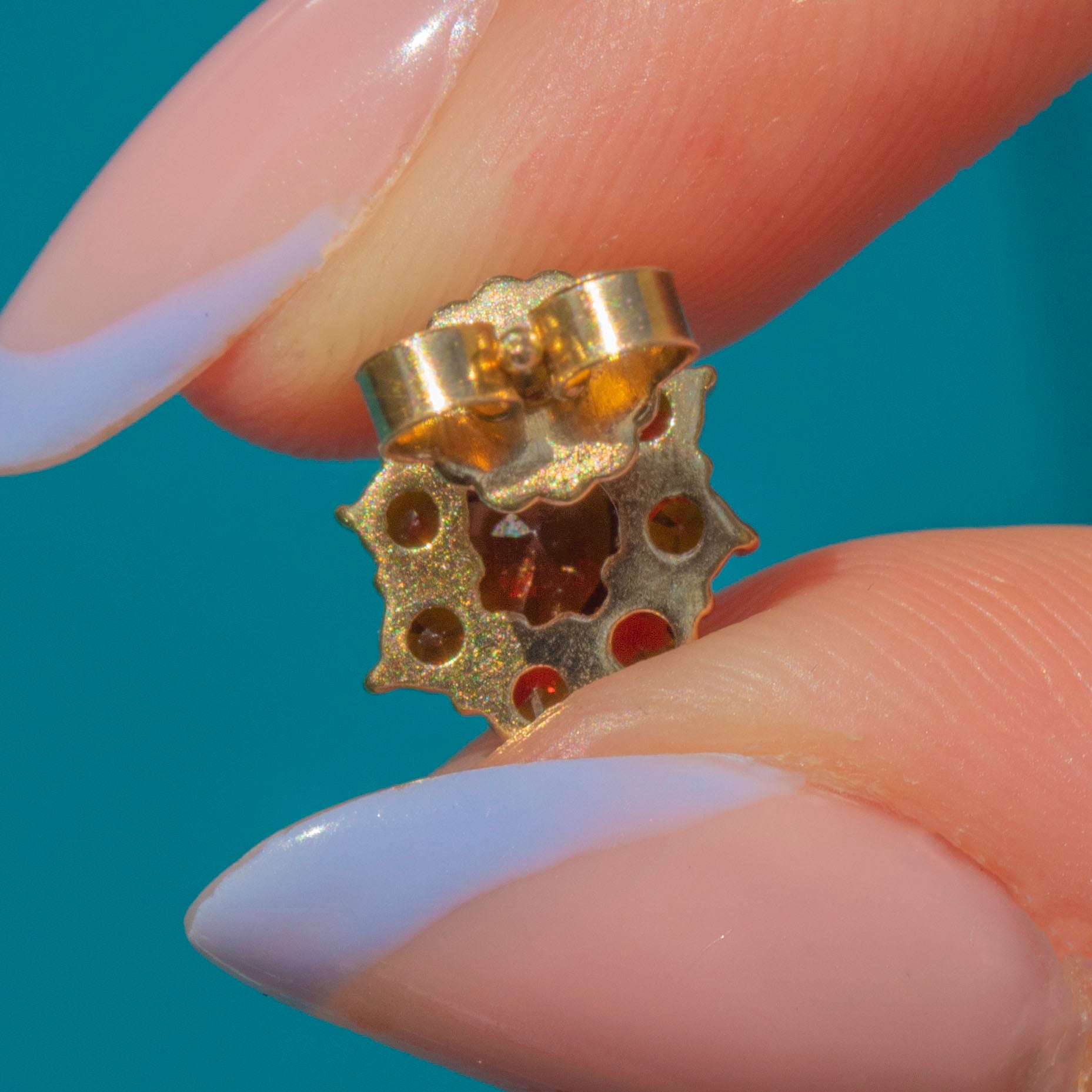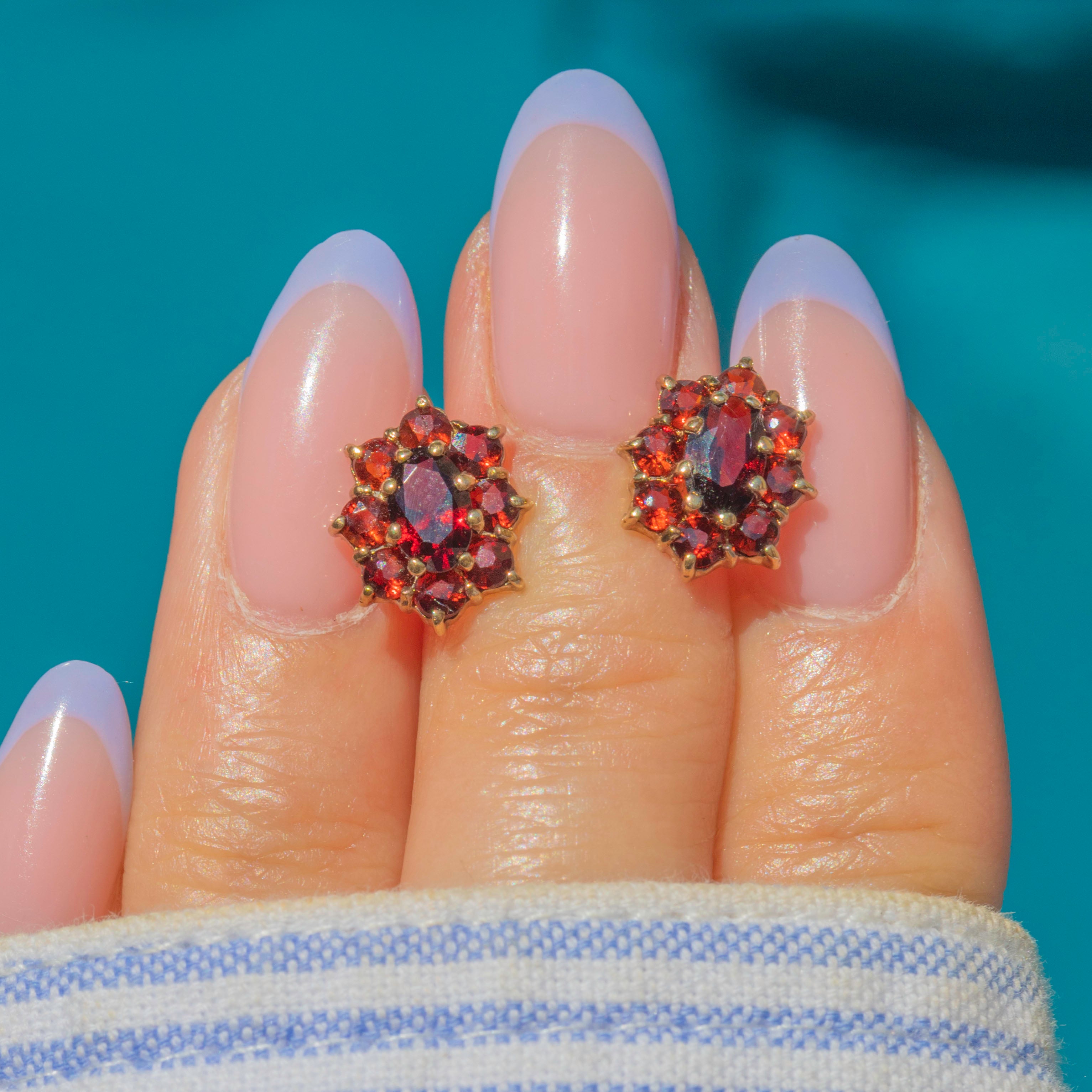 These 9ct Gold Garnet flower cluster stud earrings are a delight! Inlaid with dainty burnt umber Garnets forming their petite floral clusters, effortlessly complemented by the warmth of the 9ct Gold, they glisten magically under the light.