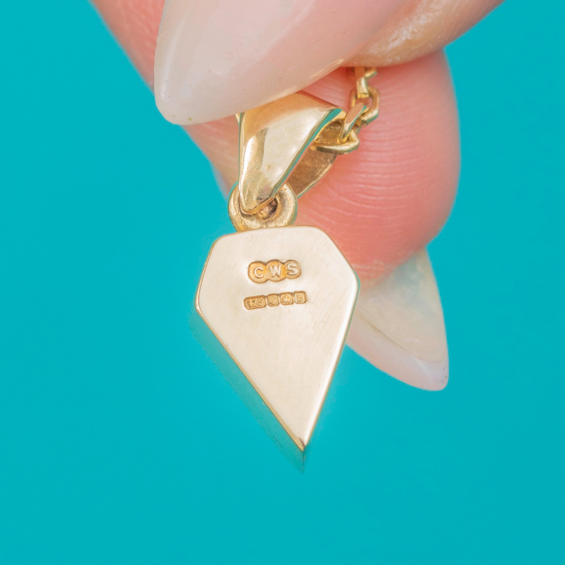 This eye-catching geometric Opal pendant showcases a mesmerising natural, solid Opal with a striking triangular shape! And a chunky bezel of solid 9ct Gold. The pendant is accompanied by an 18" Gold chain, making it ready to wear straight away.