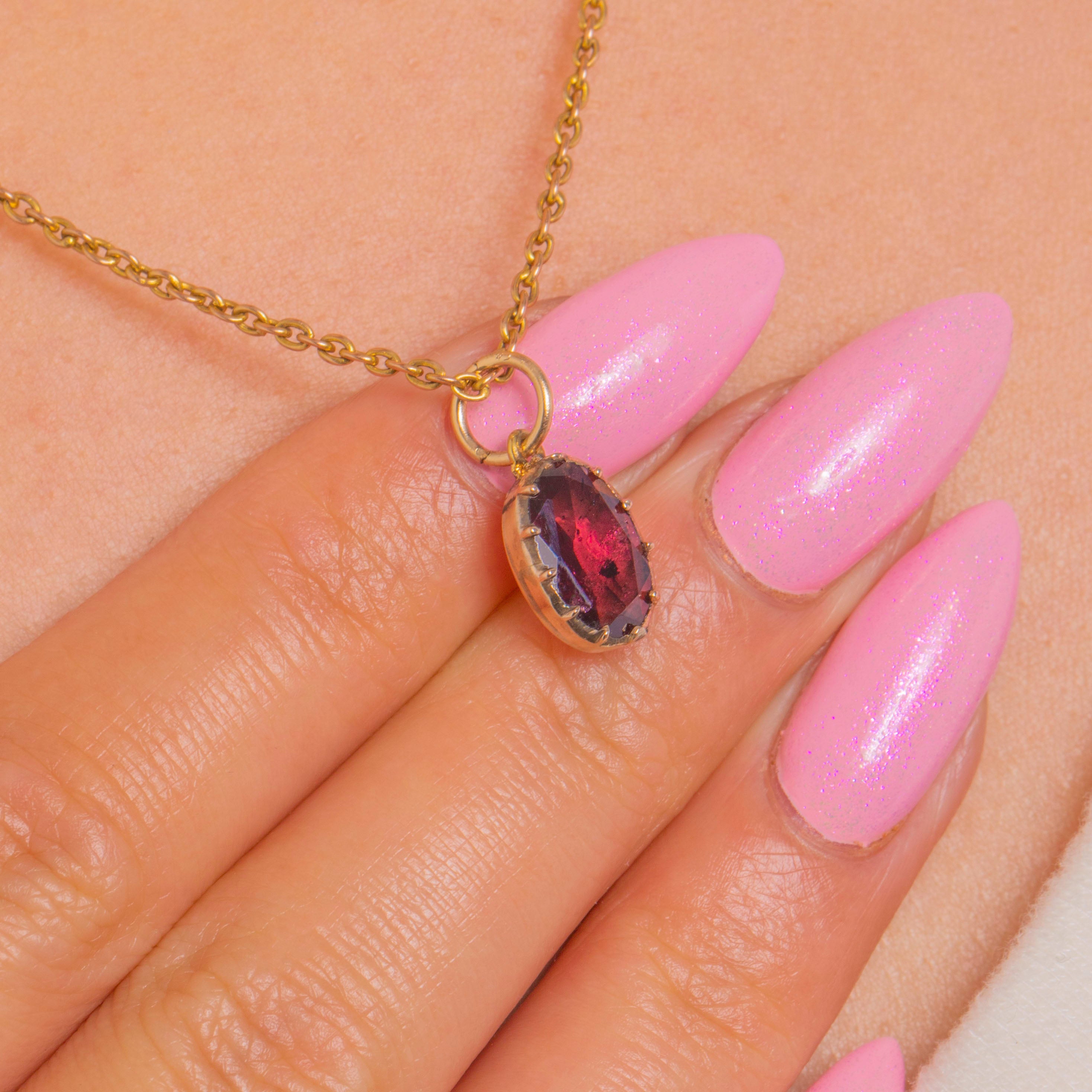 A petite treasure from the Georgian era, this charming 9ct Gold foiled flat-cut Garnet pendant distils timeless elegance into a delicate silhouette. The oval Garnet glows a deep, wine-red with bright flashes, enhanced by its traditional closed-back, foiled setting for a rich, romantic presence.