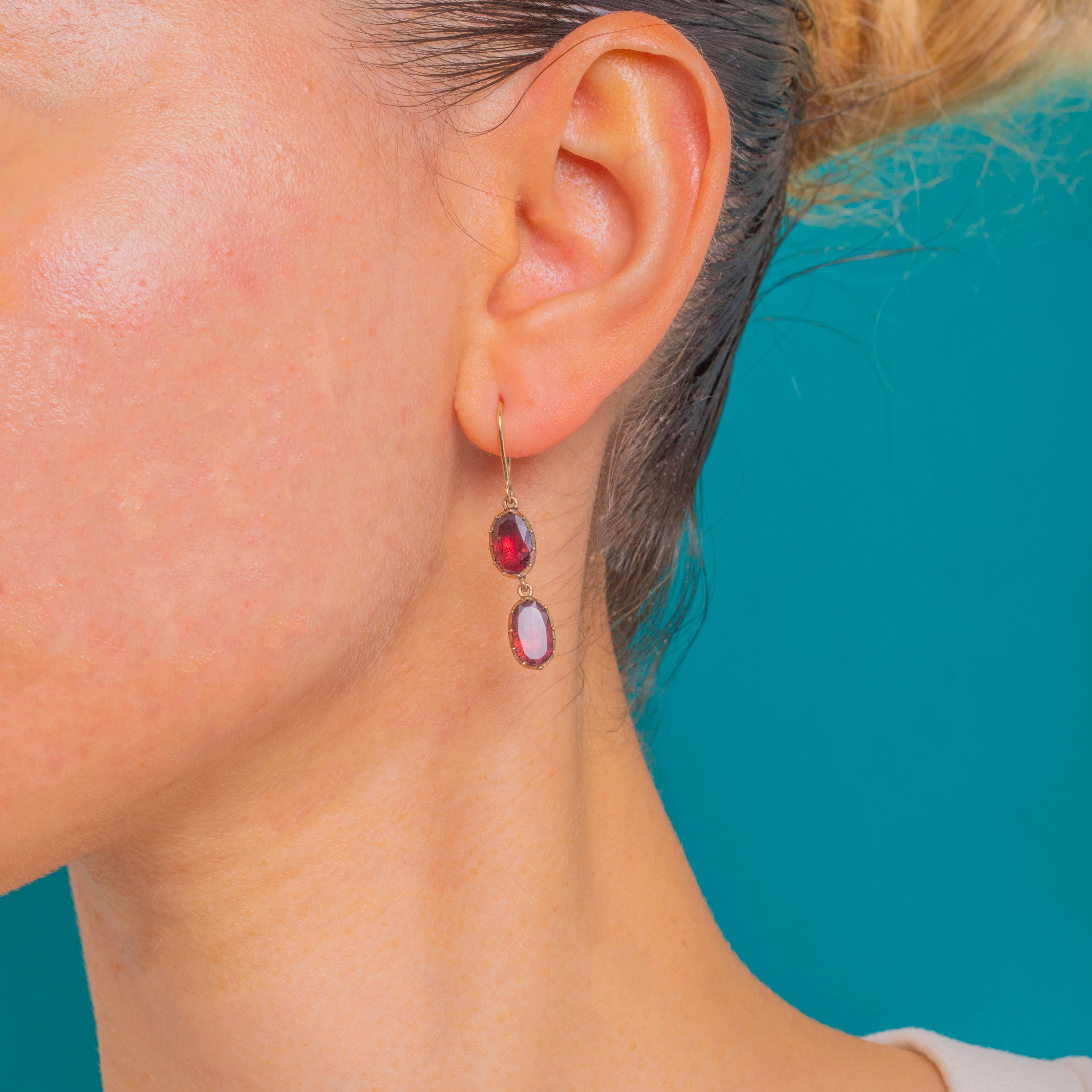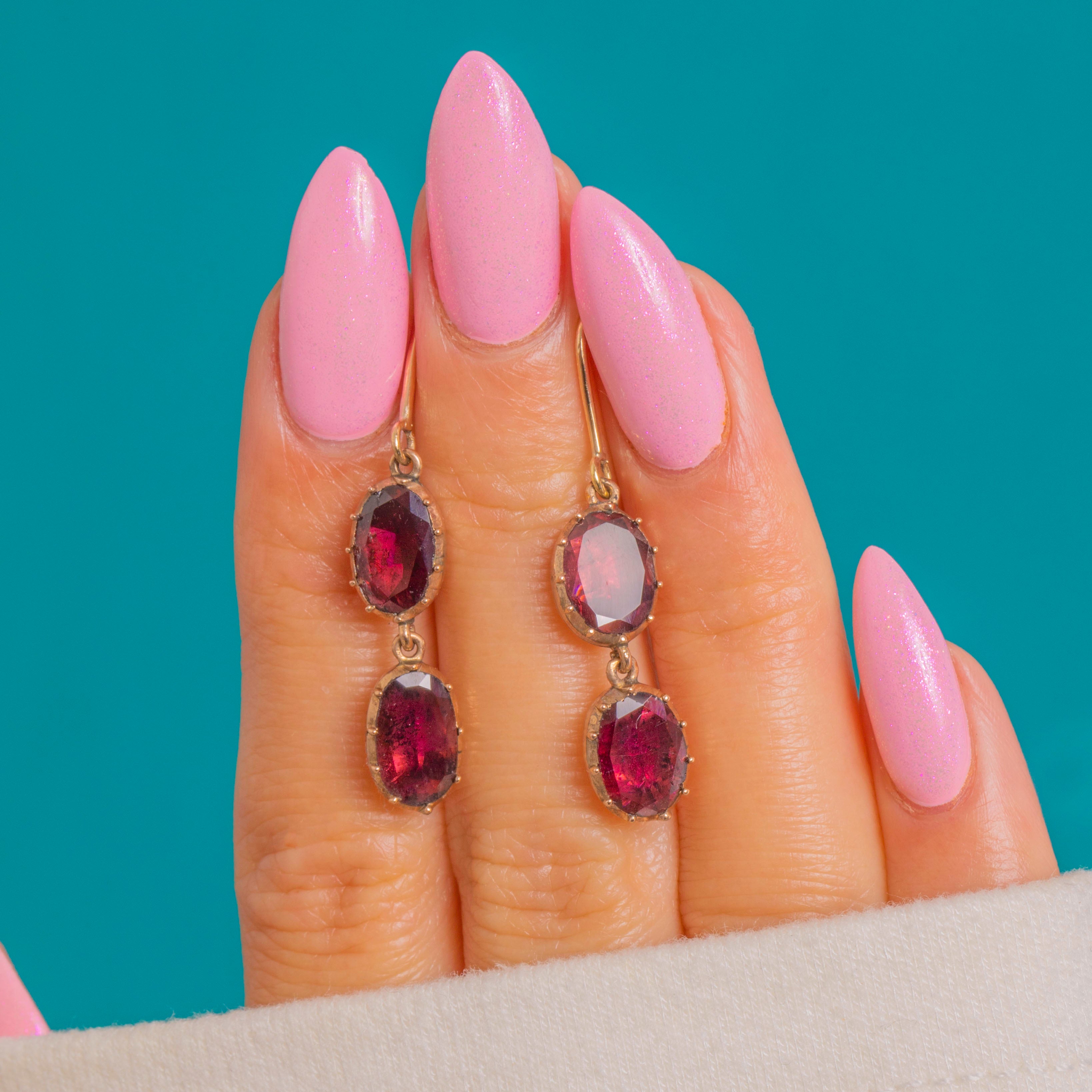 These Georgian double-drop earrings are a study in elegance, pairing rich Garnets with warm 9ct Gold. Each earring suspends two faceted oval Garnets in scalloped collet settings, linked so they sway softly with every movement. The deep crimson tones glow against the buttery hue of the Gold, creating a timeless, romantic allure.