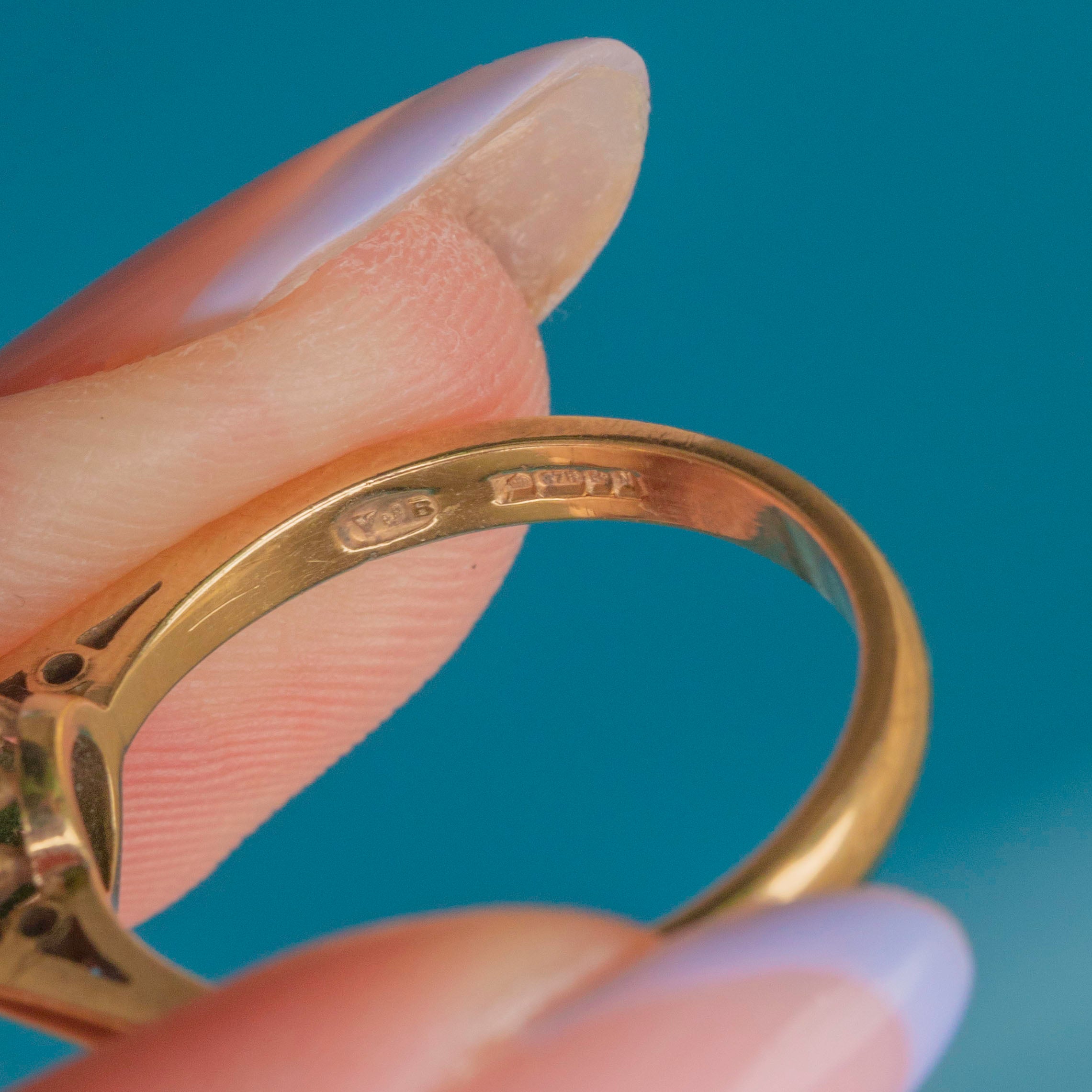 Crafted from buttery 9ct Gold, this vintage solitaire ring features a radiant round verdant green Paste stone in her centre, which is sure to catch your eye. She is hugged by 9ct Gold claws, with the warmth of the Gold effortlessly complementing the vibrancy of the Paste.