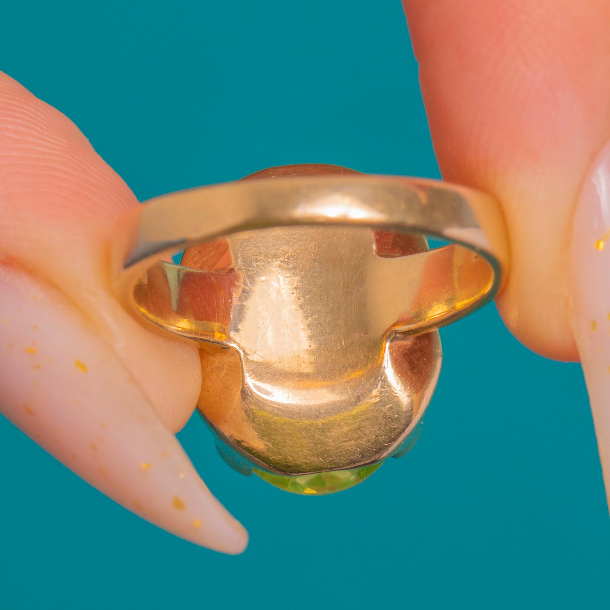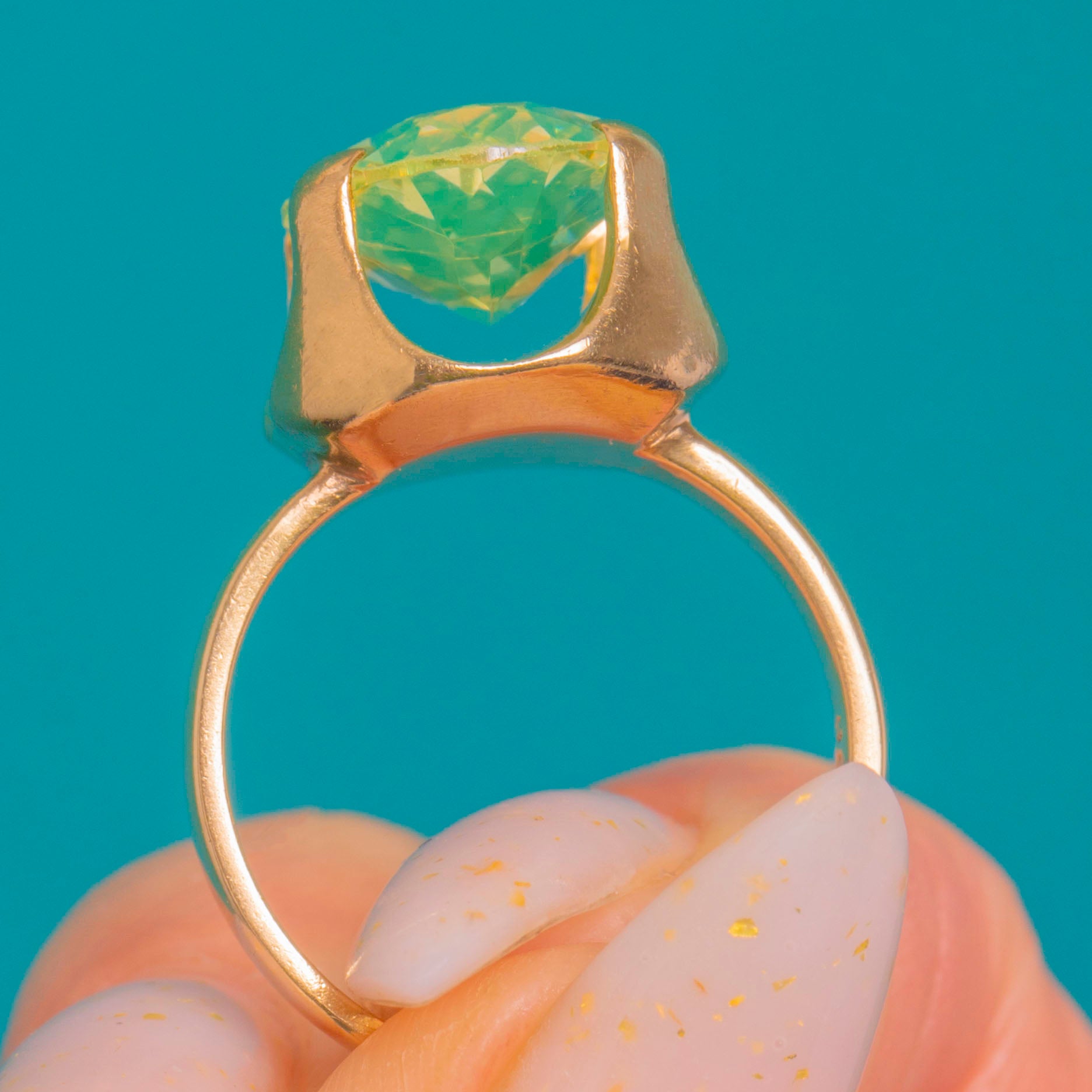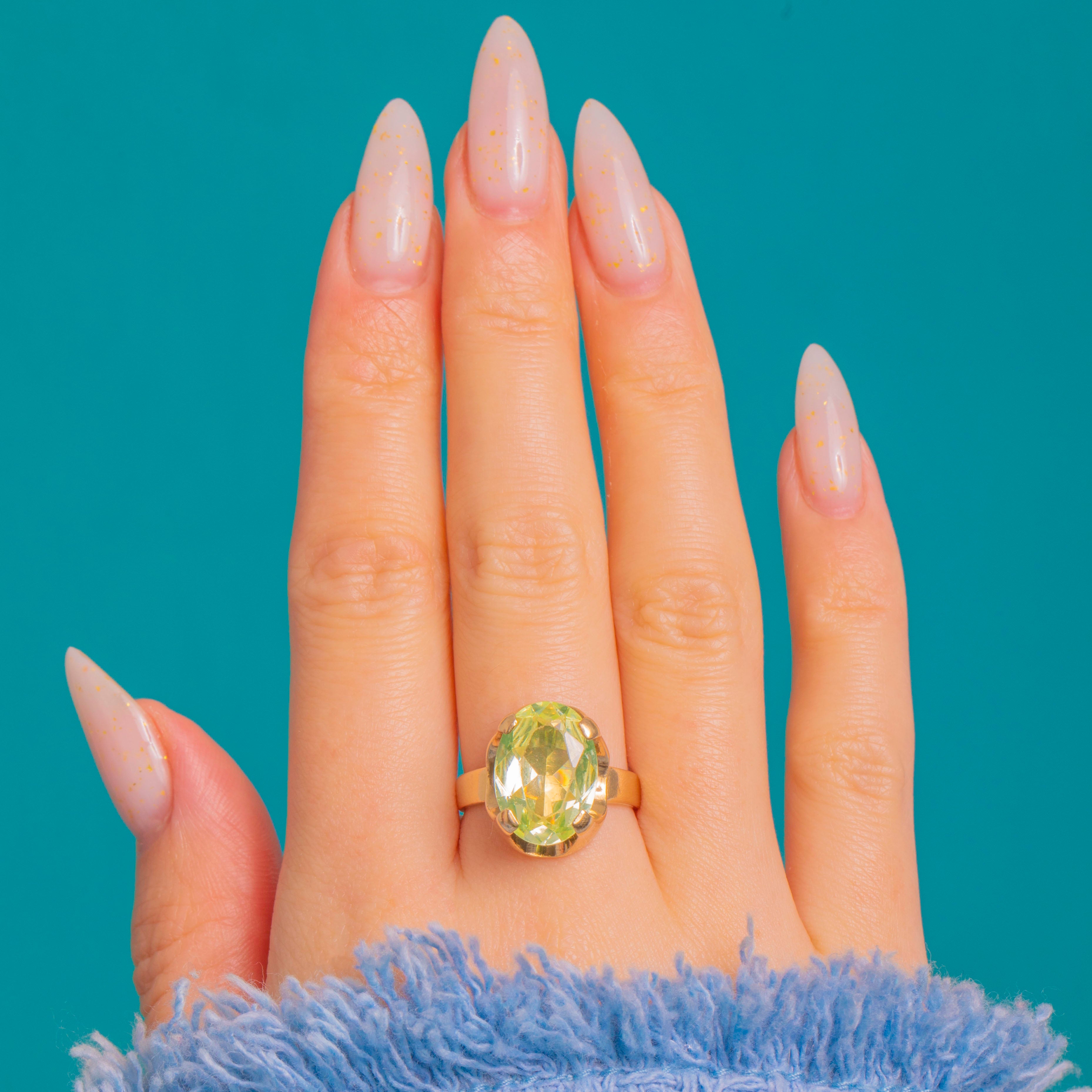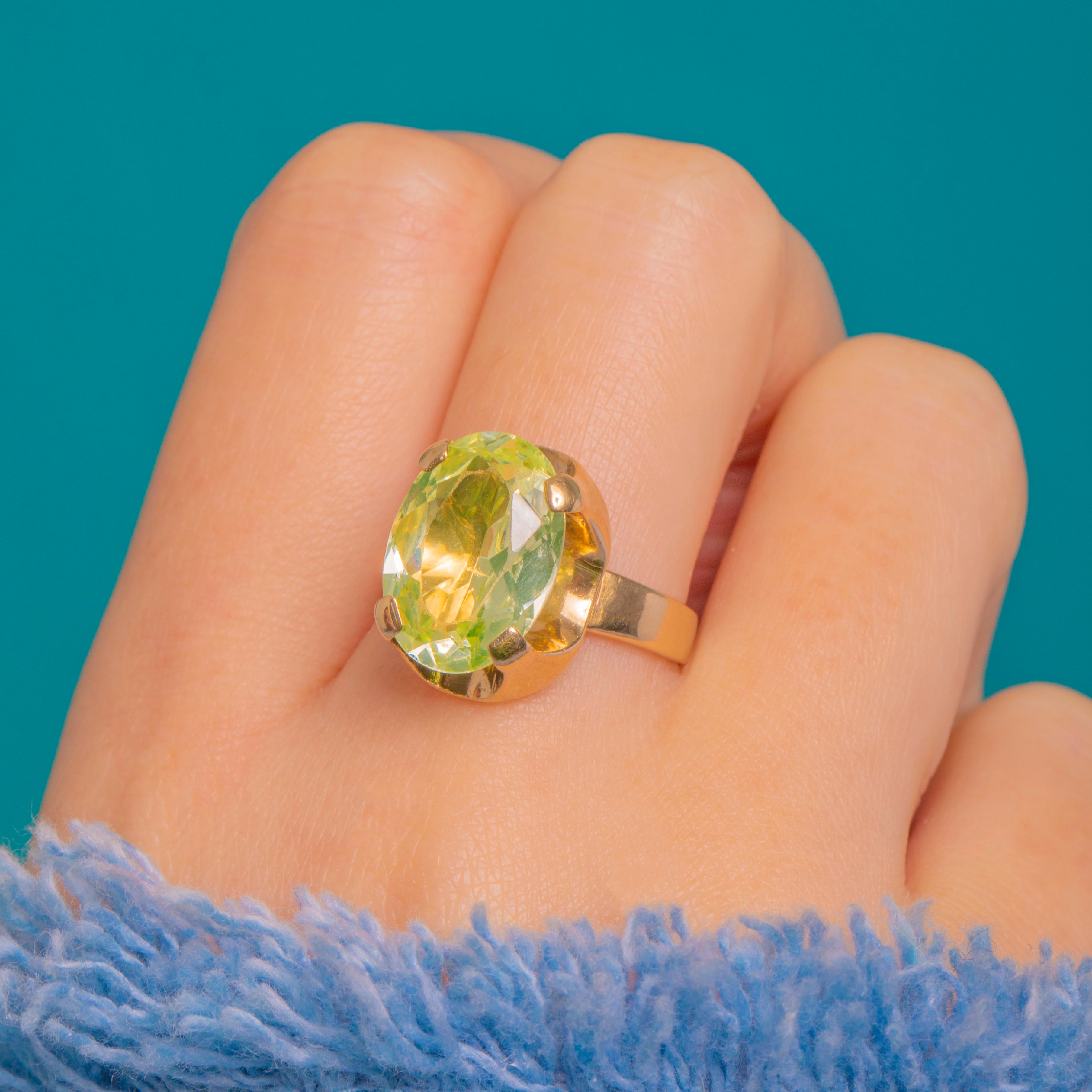 This bold Vintage solitaire ring showcases a vivid lemon‑lime green Synthetic Spinel in a sculptural 9ct Gold mount. The substantial head presents smooth, architectural lines with open side windows and a high gallery, giving the gemstone beautiful light and presence on the hand.