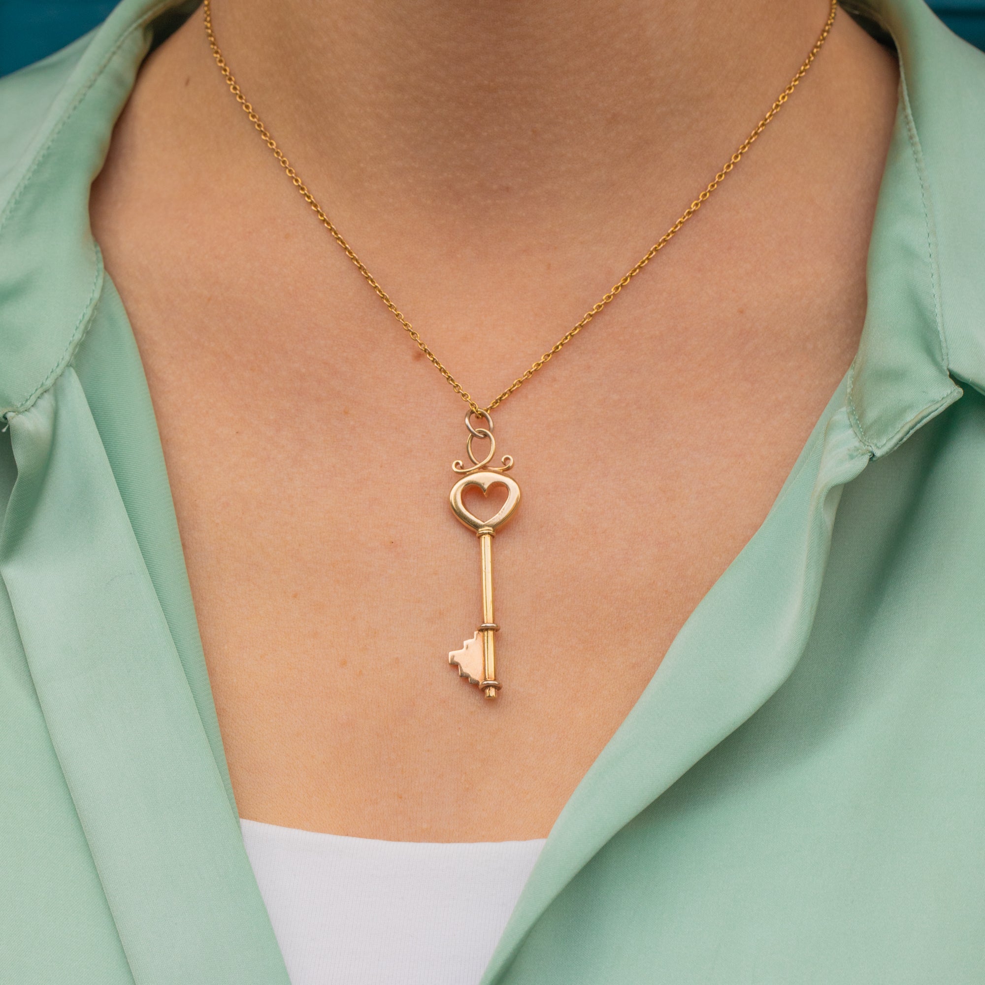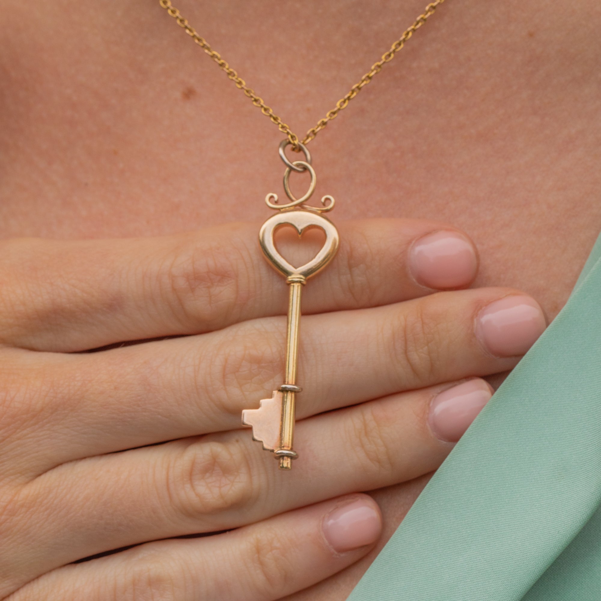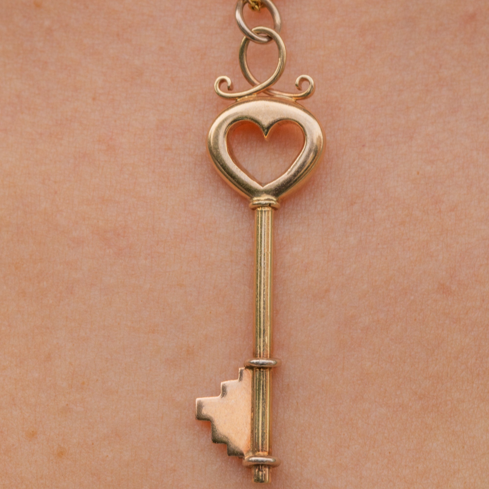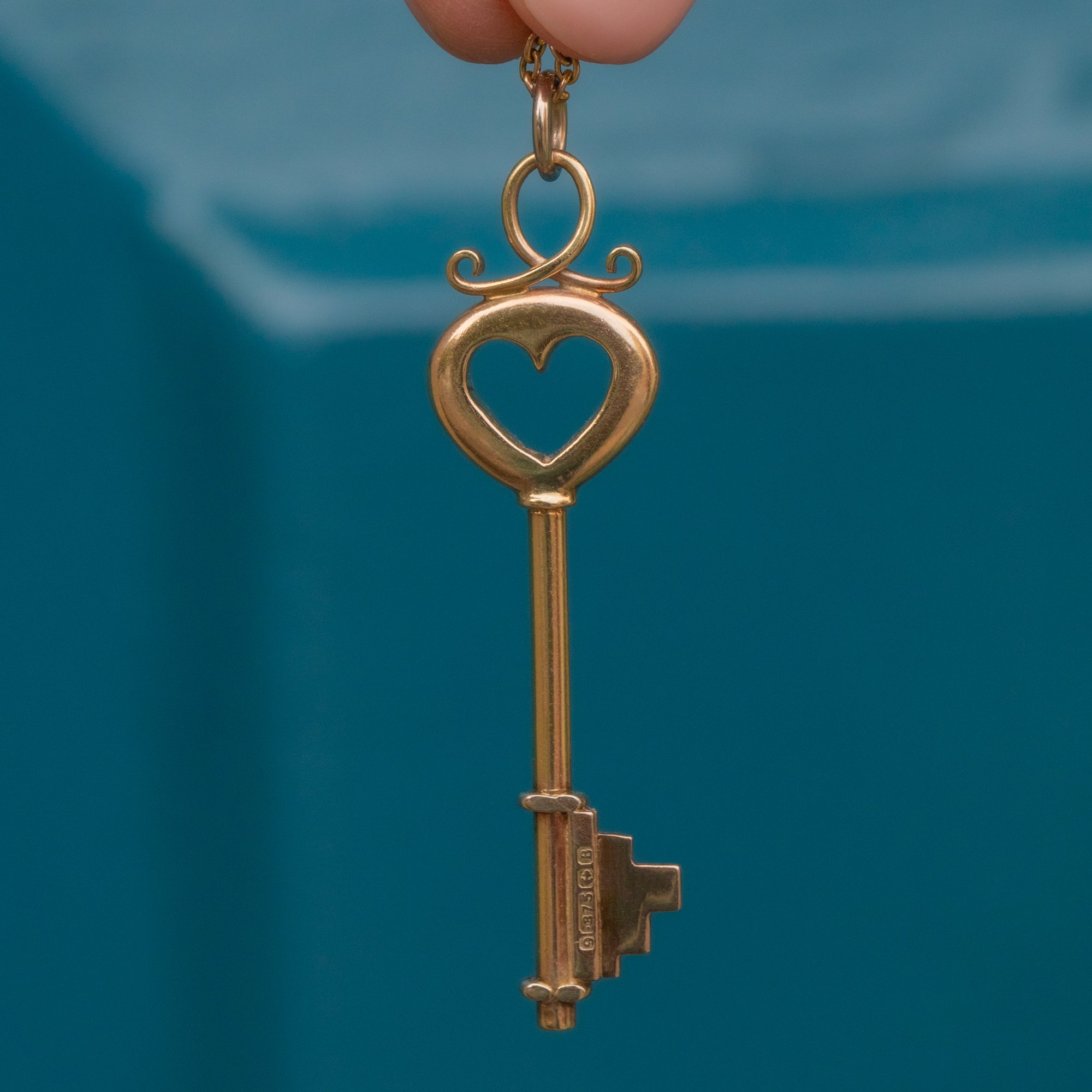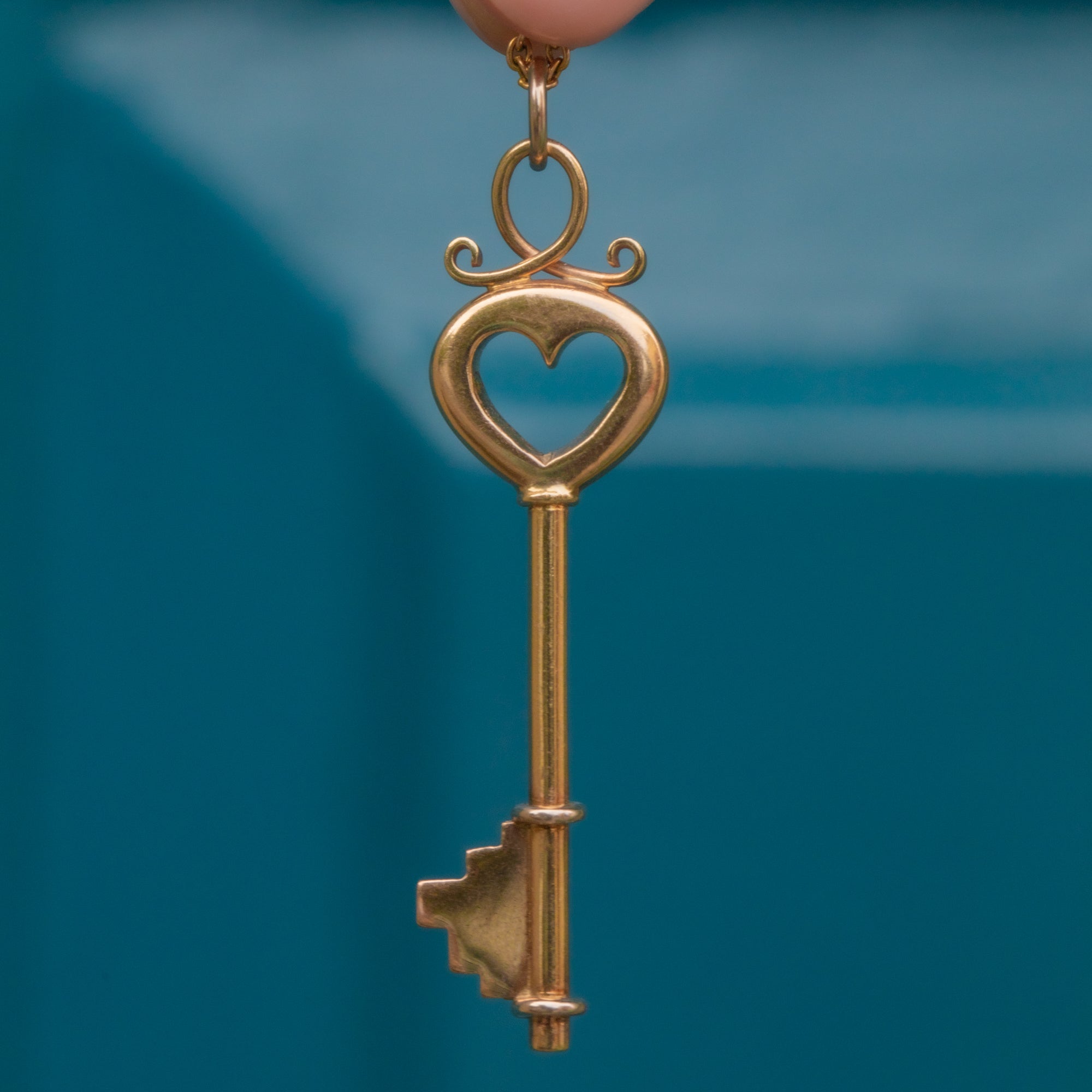 Art Deco 9ct Gold heart key charm! Your eyes will glide over her intricate design with ease, starting with her whimsical key head, and heart-shaped top making this piece a true romantic treasure.