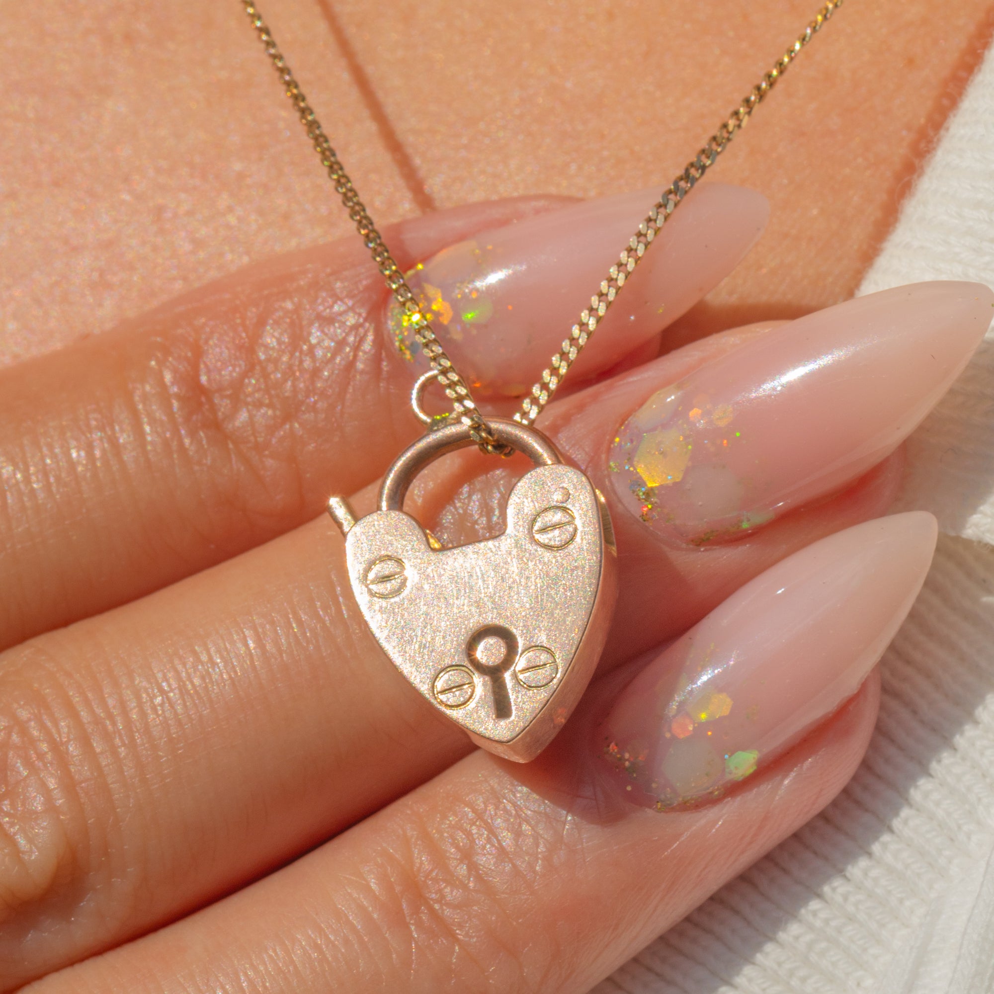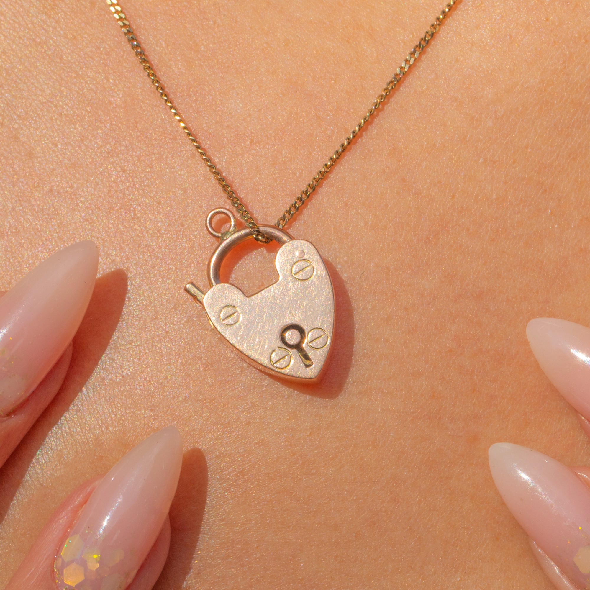 A sweet mid-century take on the classic heart padlock, crafted in warm 9ct Gold. The front is sleek and minimalist, punctuated by a keyhole motif and four neat slotted “screw-head” details for a subtle utilitarian edge. Petite yet impactful, it brings a whisper of romance to any look.