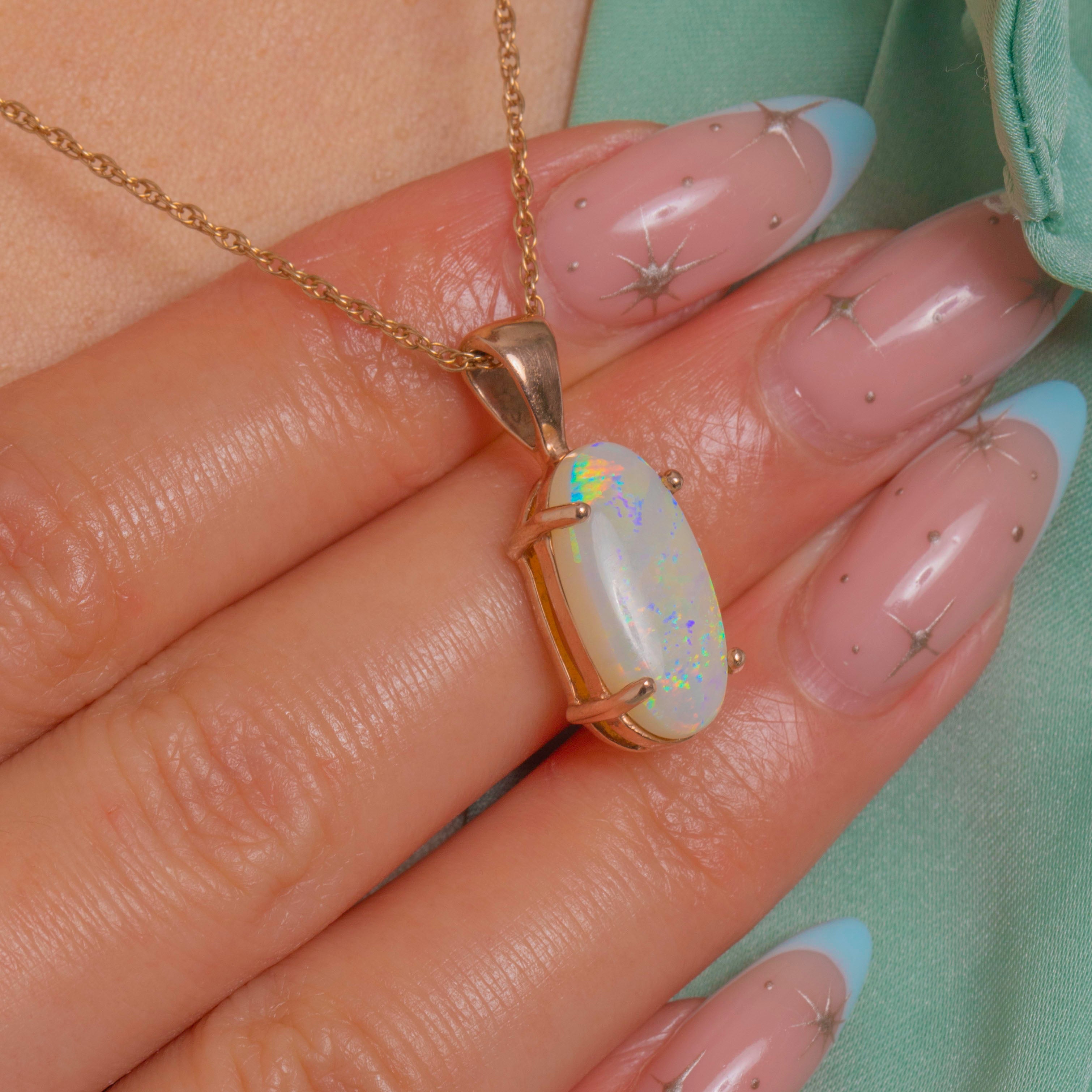 A luminous Opal cabochon shimmers with blue‑green play‑of‑colour and flashes of yellow, orange and pink in this elegant 9ct Gold pendant. The elongated oval stone is cradled in a refined four‑claw setting with open sides and a smooth tapered bail, creating a clean silhouette that lets the Opal take centre stage.