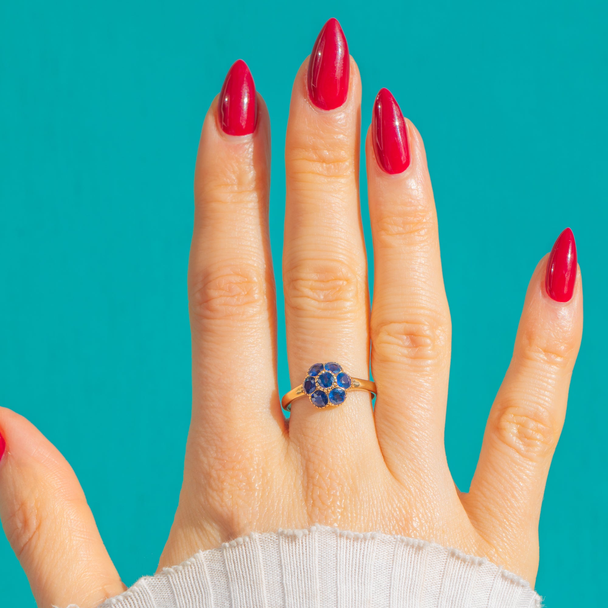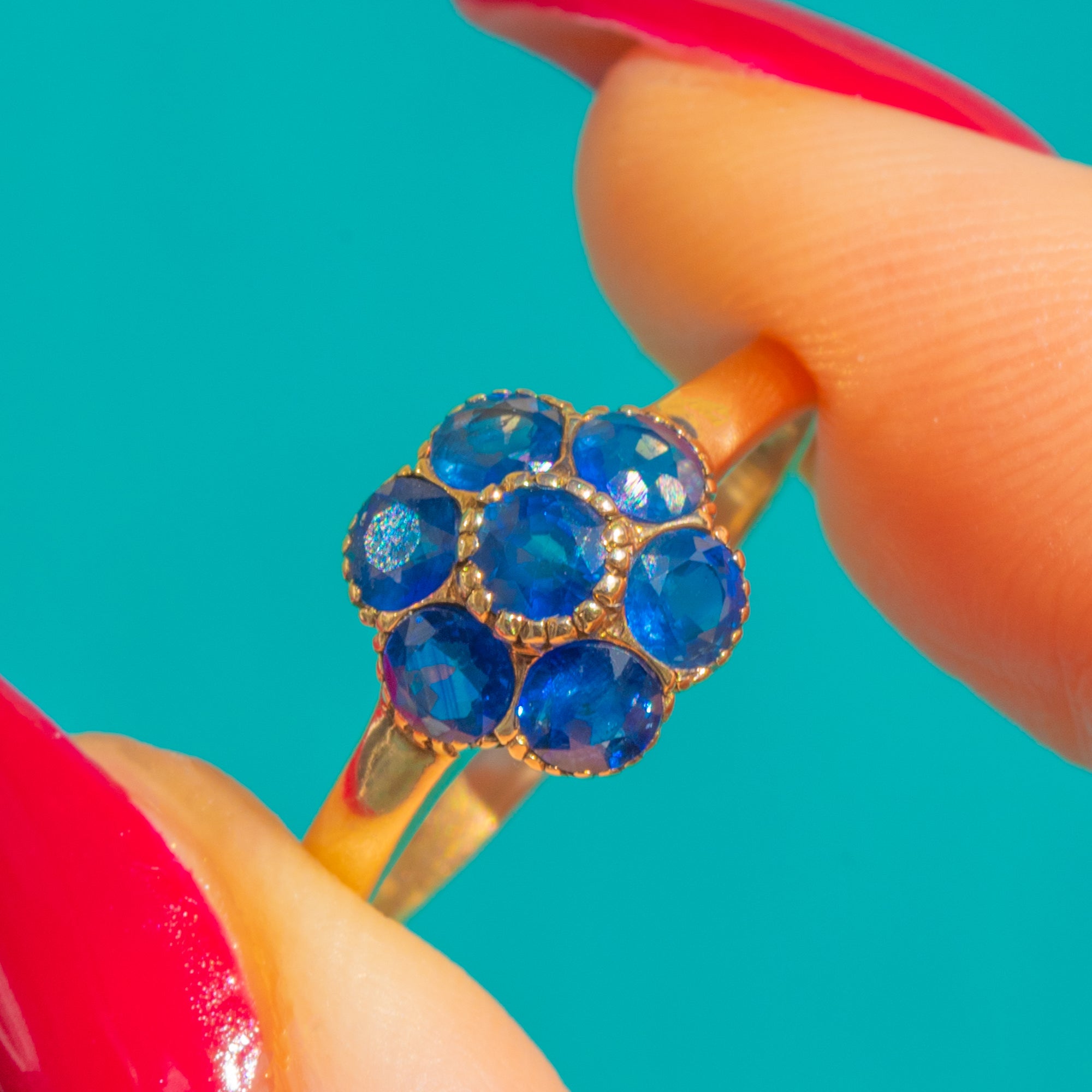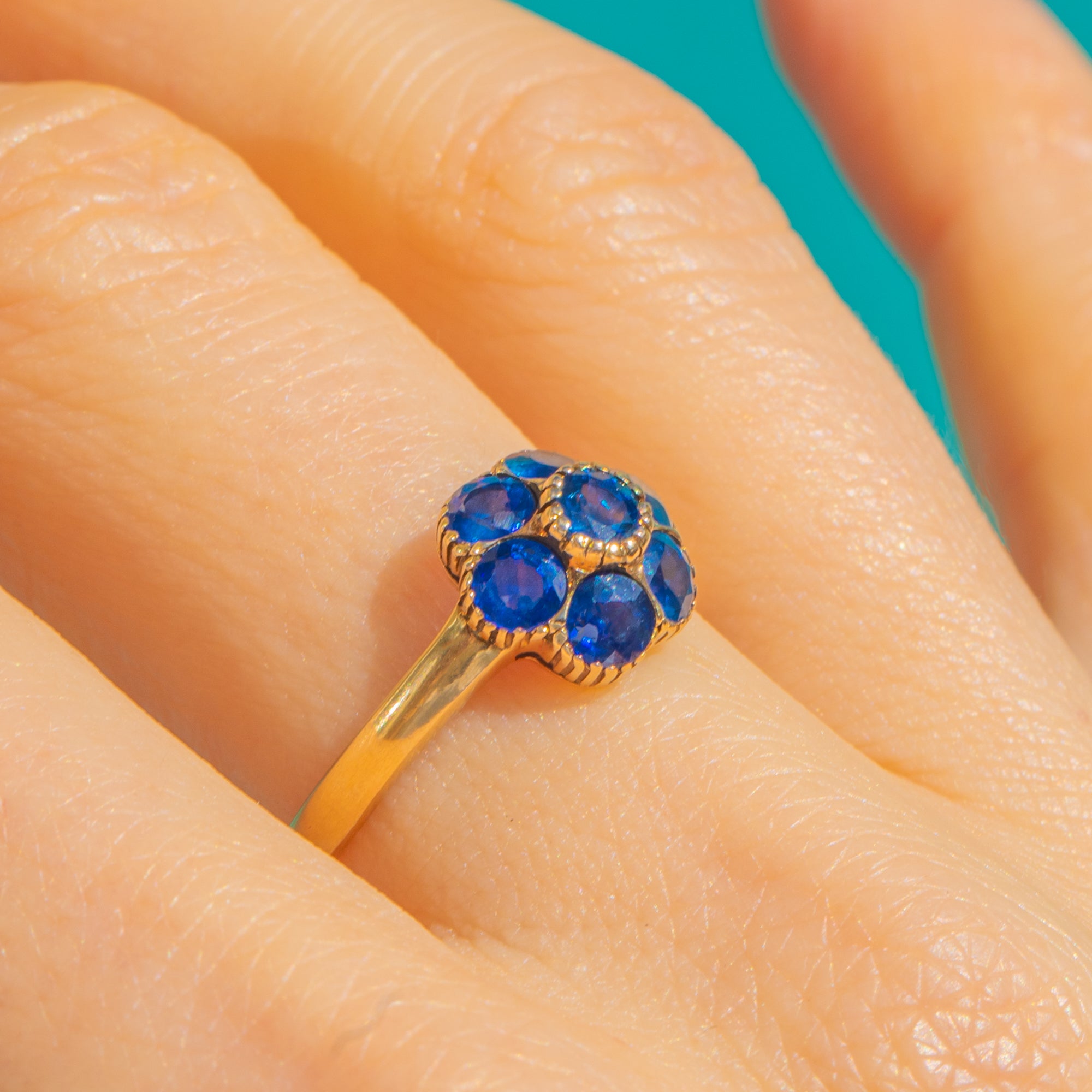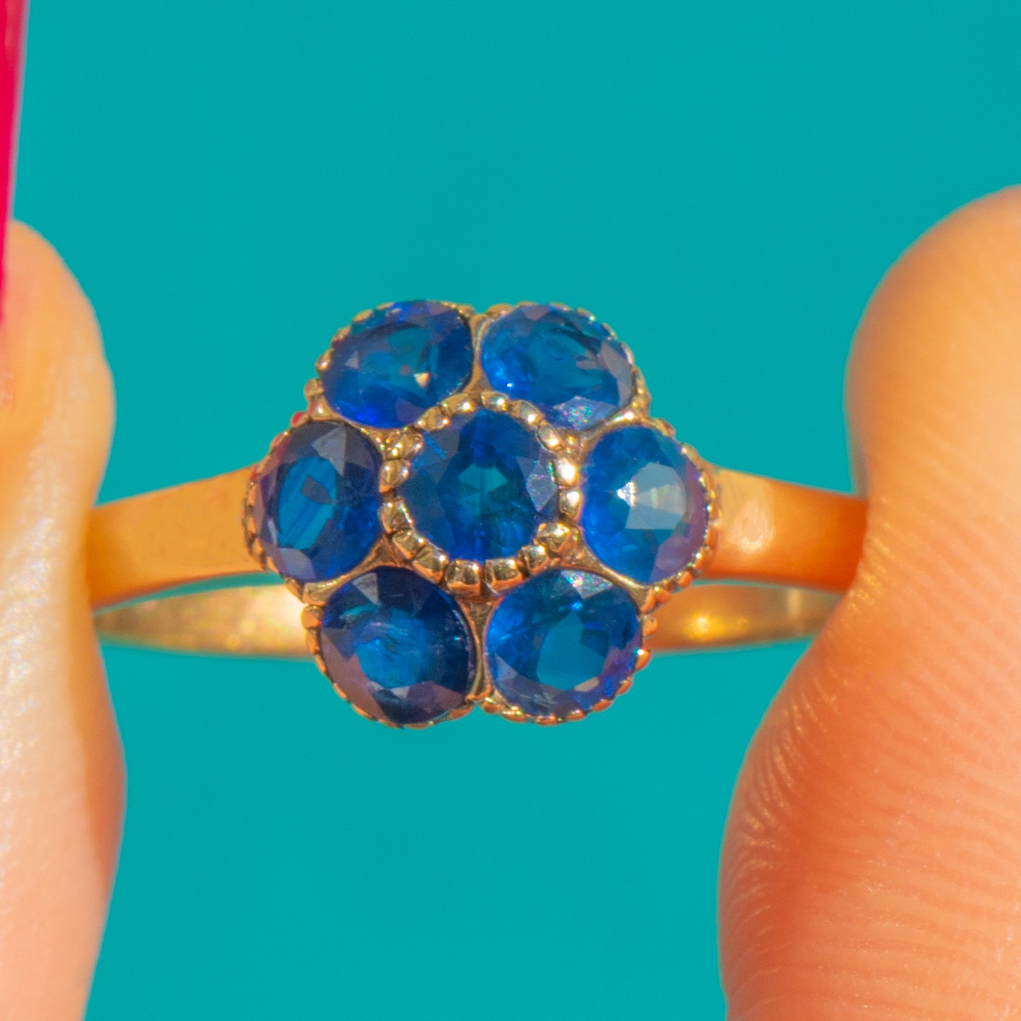 A timeless flower cluster ring in rich 9ct Gold, set with seven vivid blue Natural Sapphires that dance with light. The classic arrangement—one centre stone framed by six—creates a neatly rounded bloom with elegant presence and enduring charm. Totaling approximately 0.45ct, the Sapphires offer a beautiful pop of colour against the warm Gold.
