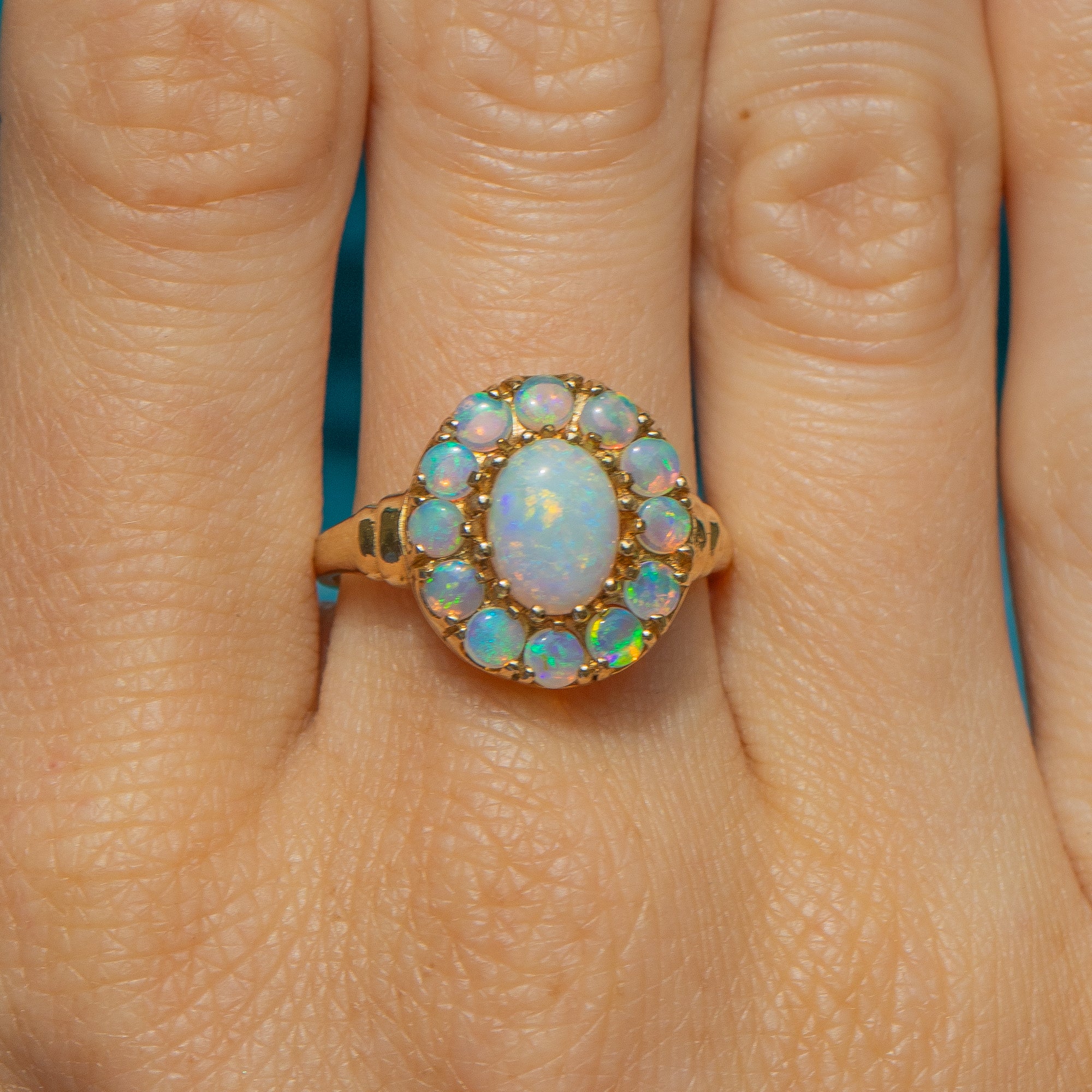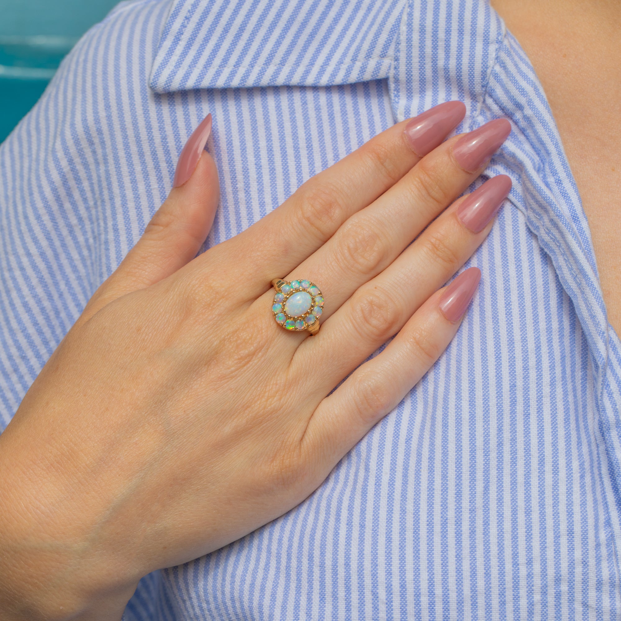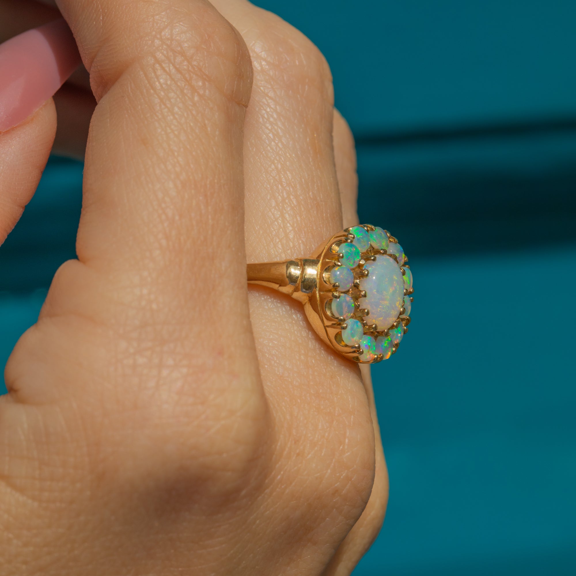 EXCELLENT. This 9ct Gold Opal flower cluster ring is in excellent condition, maintaining its original lustre. The Opals are secure in their setting with a glossy smooth finish. The Gold is buttery and has retained its form well, allowing you to wear it comfortably and securely all day long.