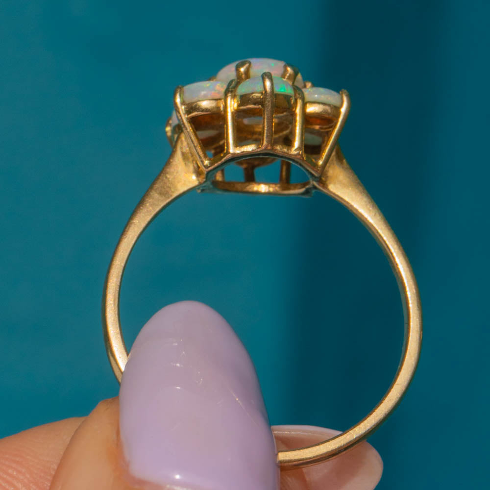 This 9ct Gold Opal flower cluster ring is bursting with vivacious hues! With punches of green and flashes of peach, this Vintage Opal ring will bring character to your ring stack.