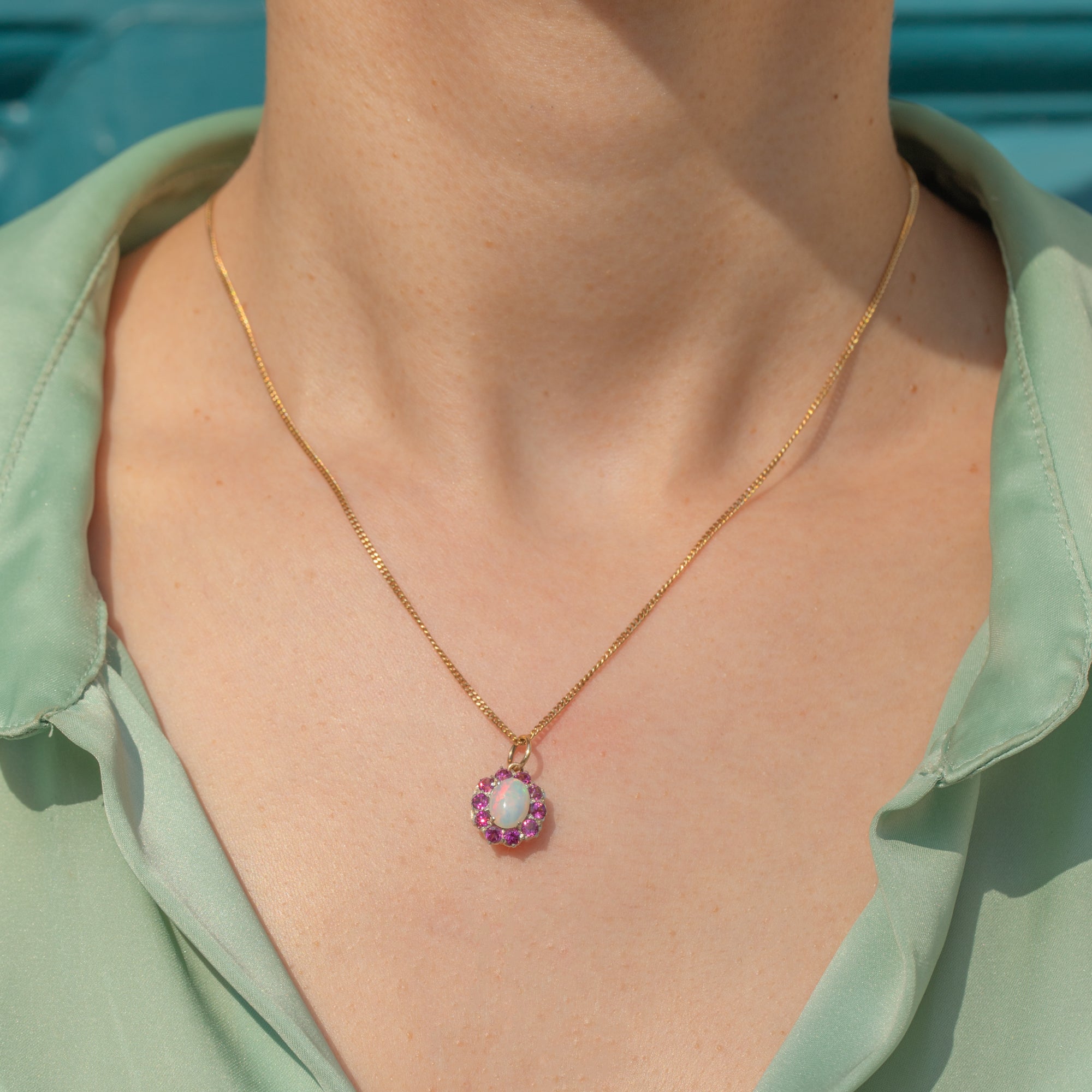 This 9ct Gold Opal Rhodolite Garnet cluster charm is endlessly pleasing to look at! Displaying a vivid Opal cabochon haloed by fuchsia-hued Rhodolite Garnets, this Art Deco pendant is a vibrant little treasure brimming with feminine charm.