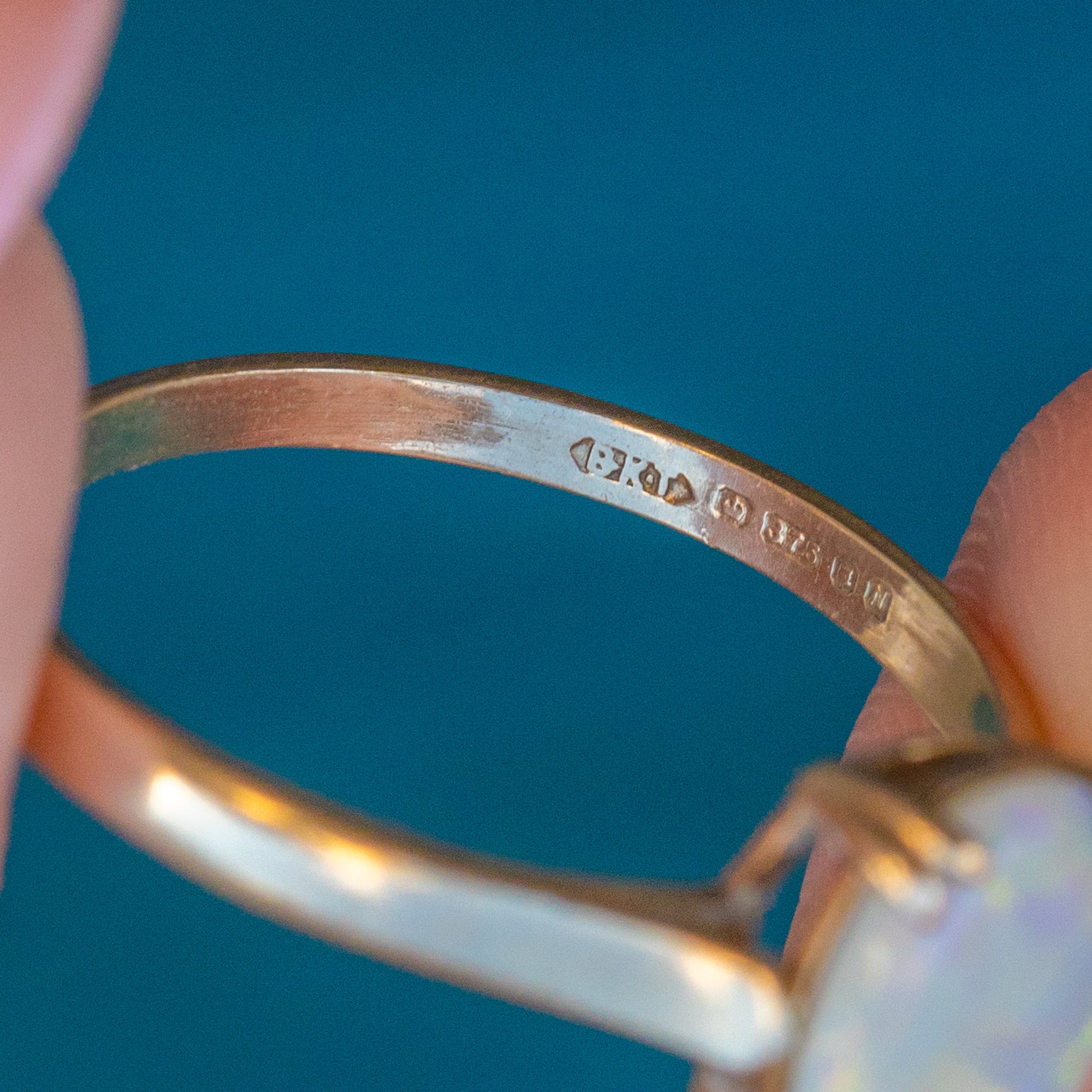 EXCELLENT. We are pleased to present this 9ct Gold Opal ring in excellent condition. Crafted from buttery 9ct Gold, the ring band is smooth and free from any visible signs of wear. Held securely by claw settings, her central natural Opal is gorgeous, radiating soft and vibrant hues, and free from any scuffs or chips. In such great condition, this ring is a true must-have!
