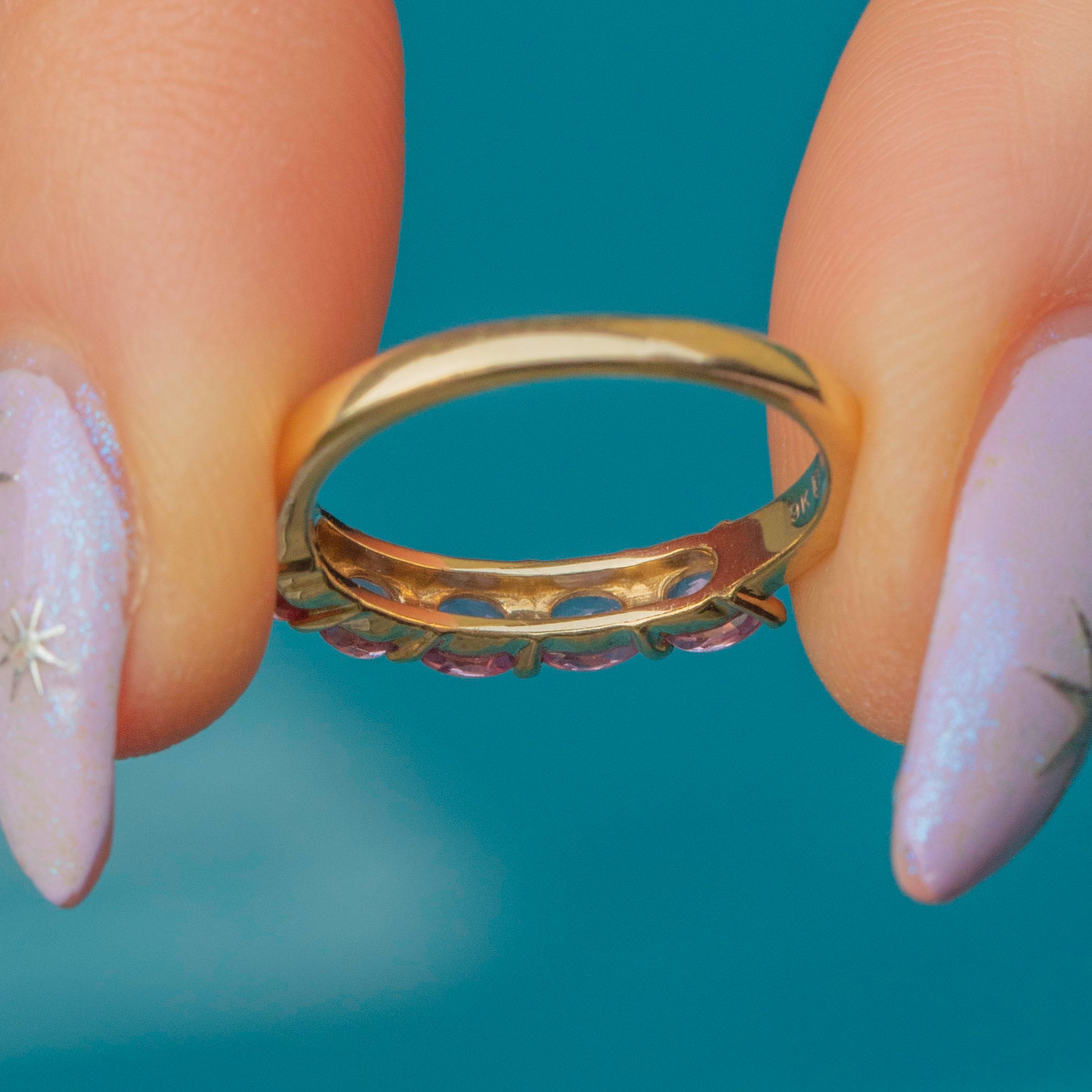 Crafted from buttery 9ct Gold, this eternity ring features five stunning pink Sapphires, each radiating soft rose hues as they catch the light. A symbol of eternal love, this Sapphire ring is the epitome of romance and is the perfect piece to add to your collection this valentines day!