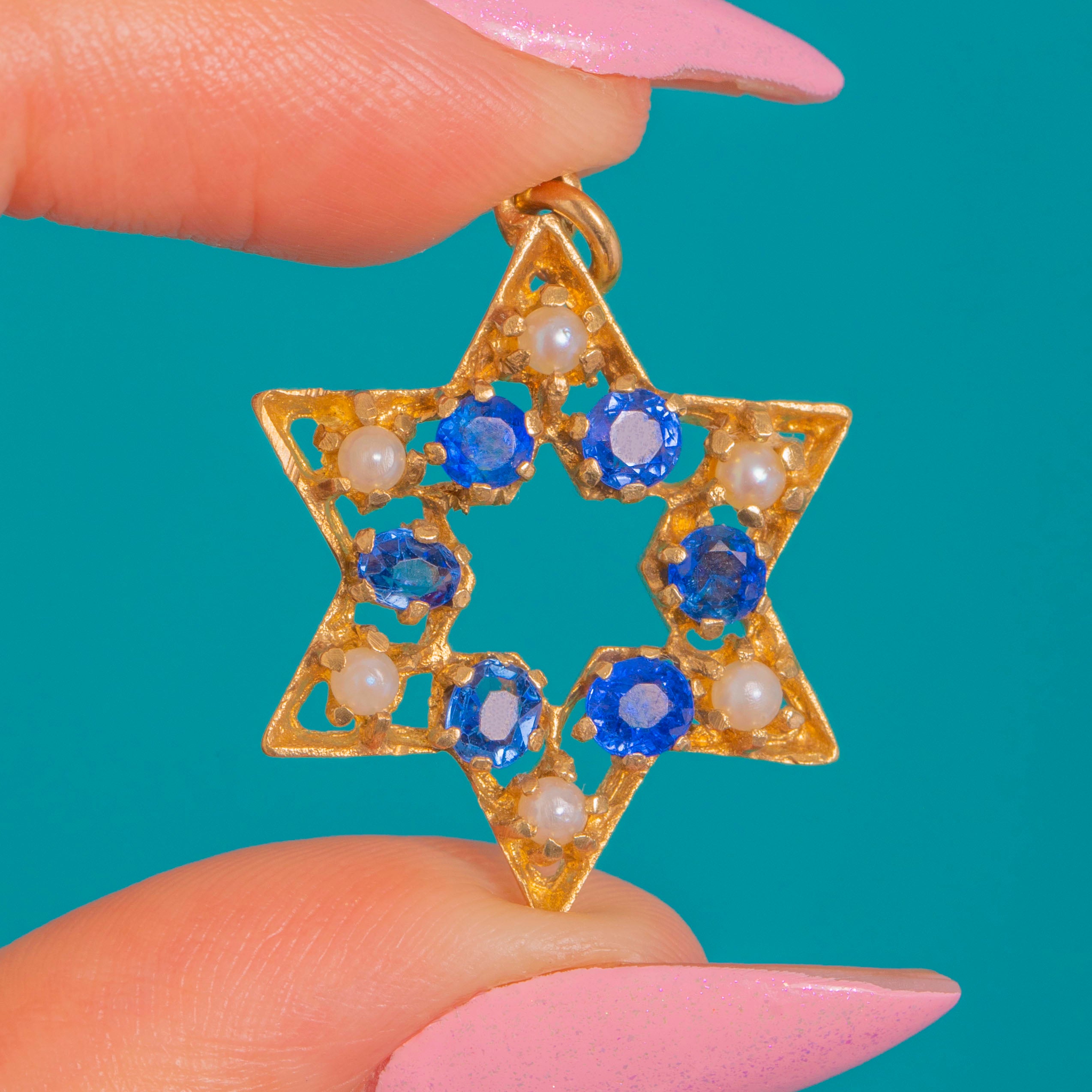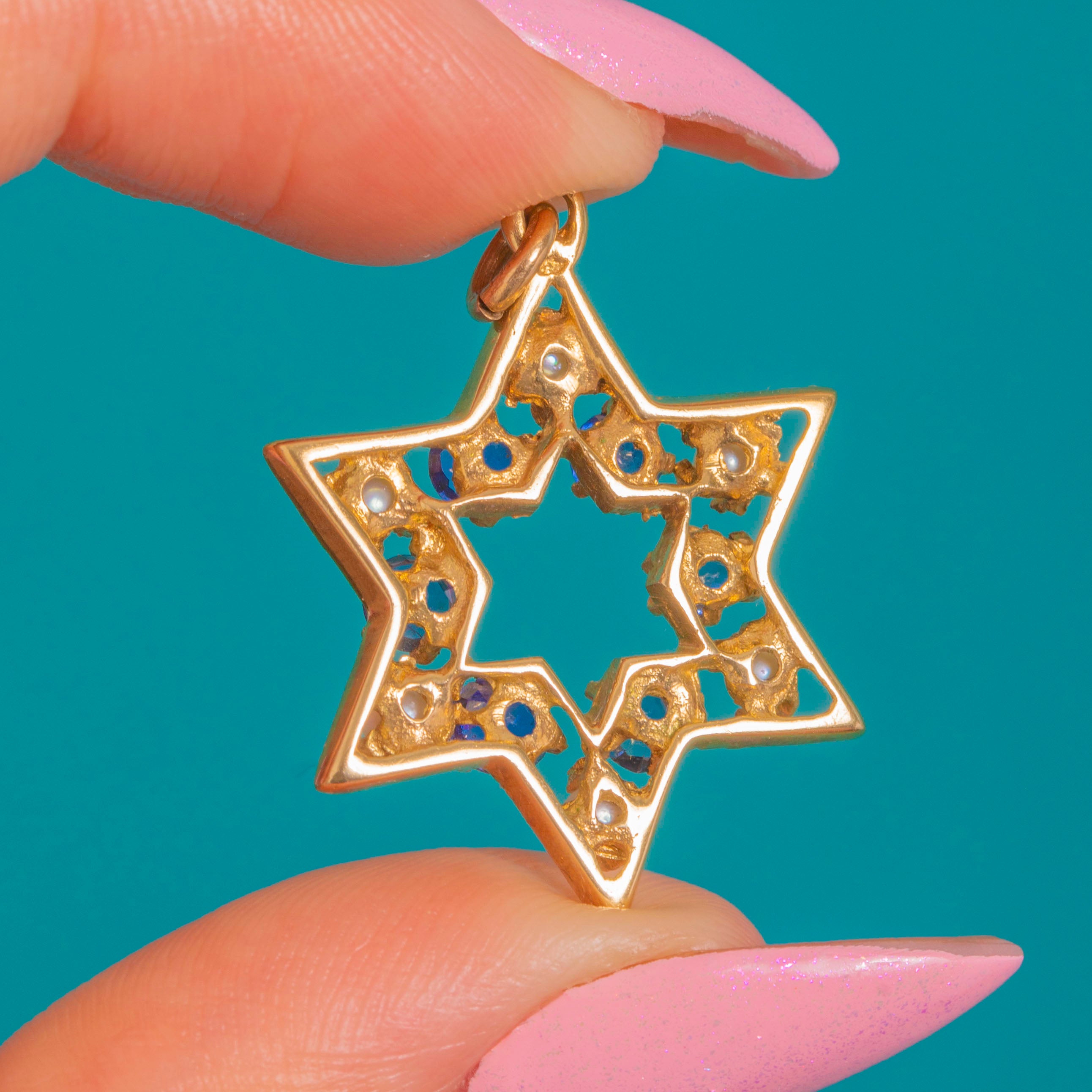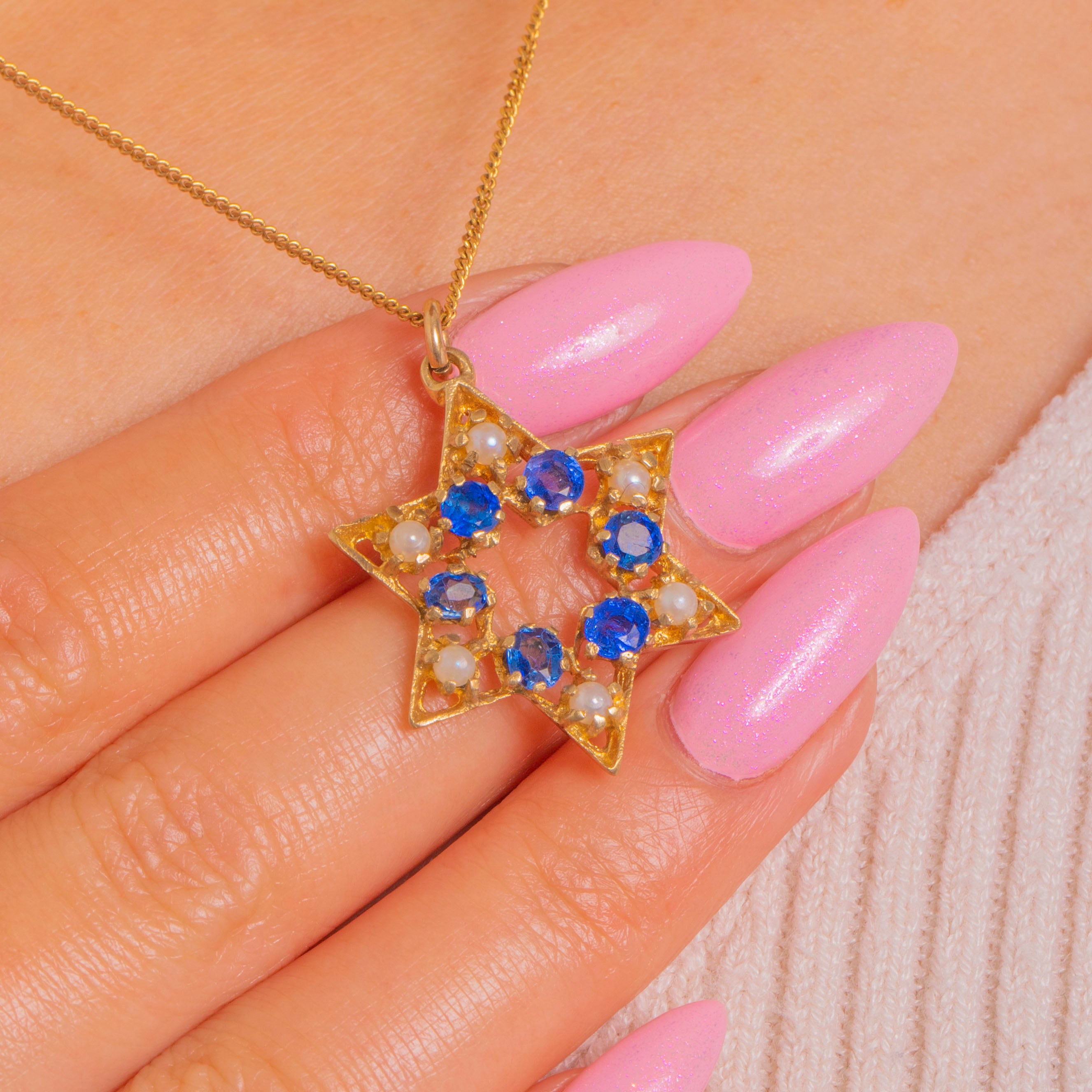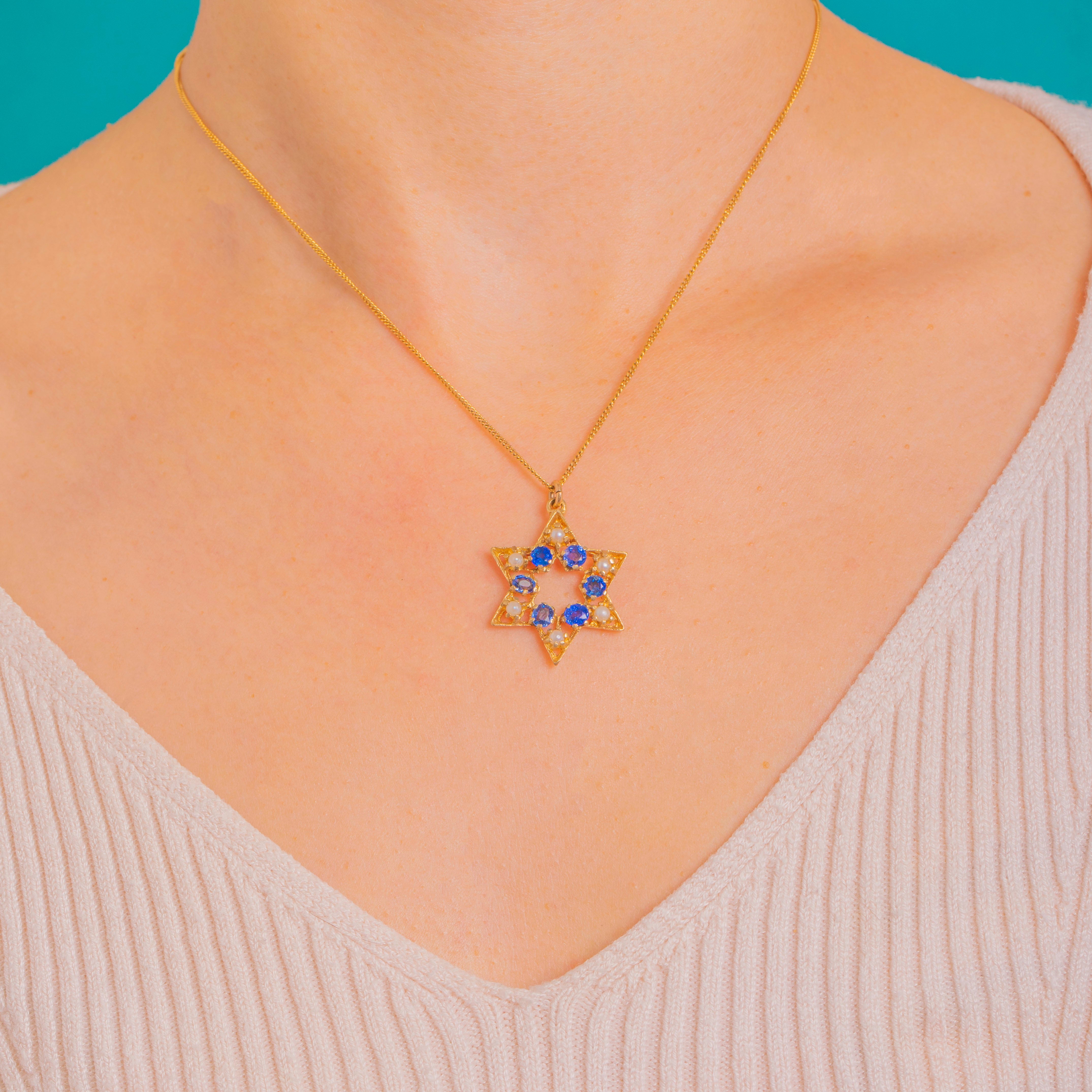 A celestial six-pointed star crafted in glowing 9ct Yellow Gold, this Vintage Mid-Century pendant is adorned with a wreath of alternating Cornflower Blue Sapphires and creamy Pearls. The openwork silhouette feels airy and elegant, with crisp geometry and gentle texture that catch the light beautifully.