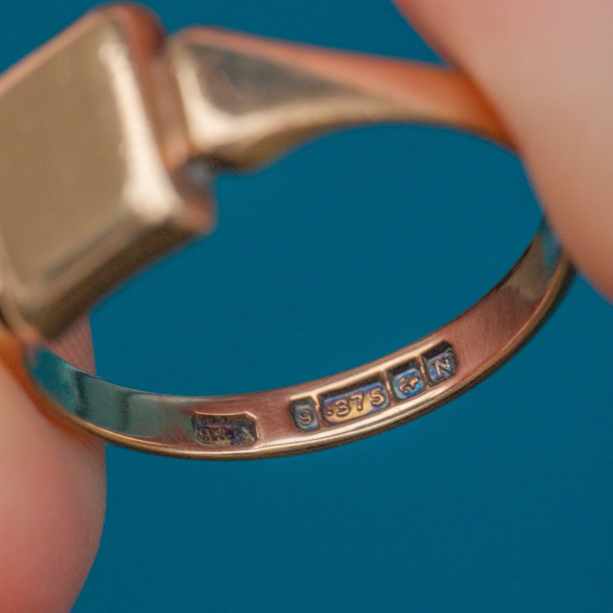 GOOD TO VERY GOOD. This Art Deco 9ct Gold square signet ring is in very good condition overall. The signet face is smooth and there is slight remnant of an engraving on the shoulder on one side. The ring has been resized at one point in time, but this is subtle and the ring wears comfortably on the finger.