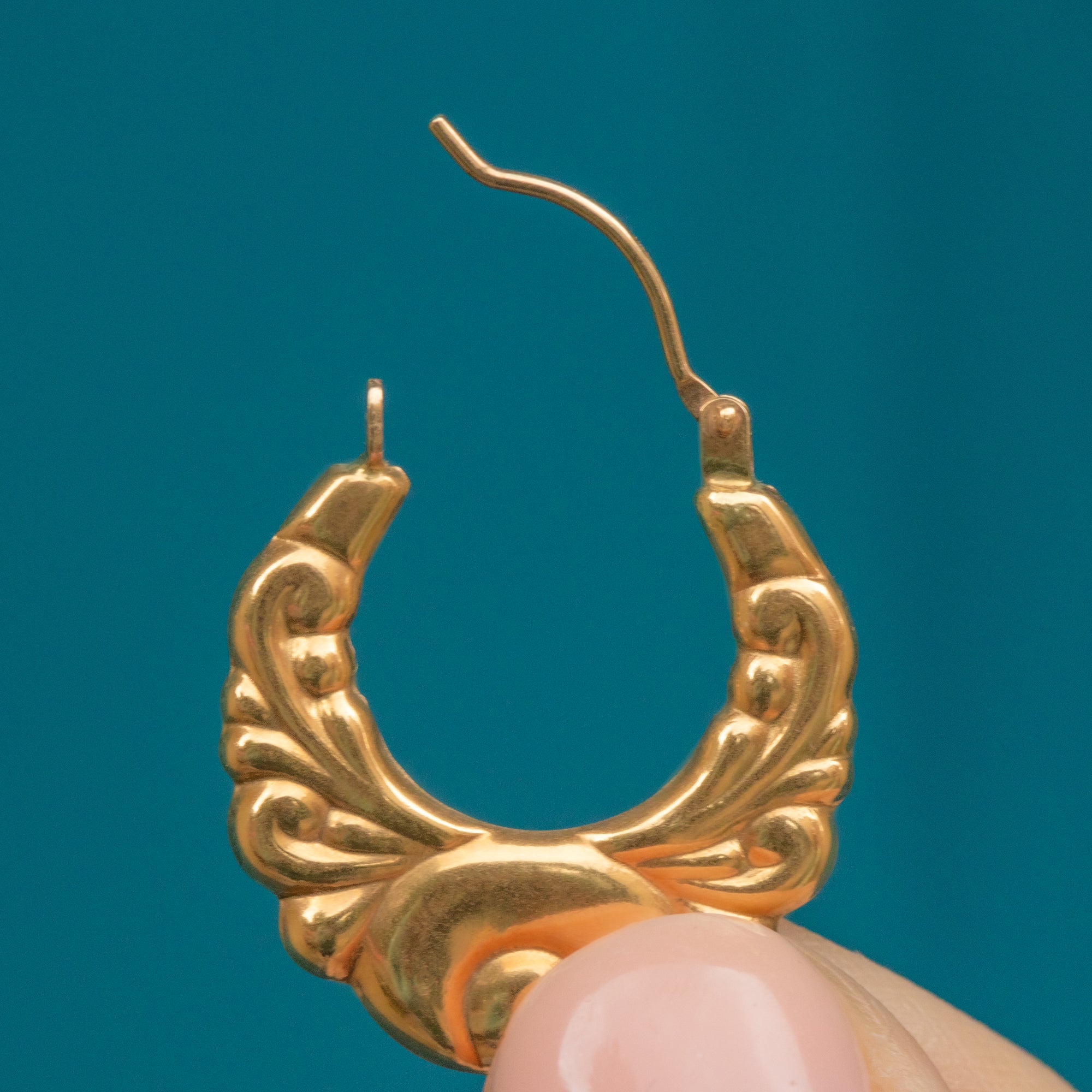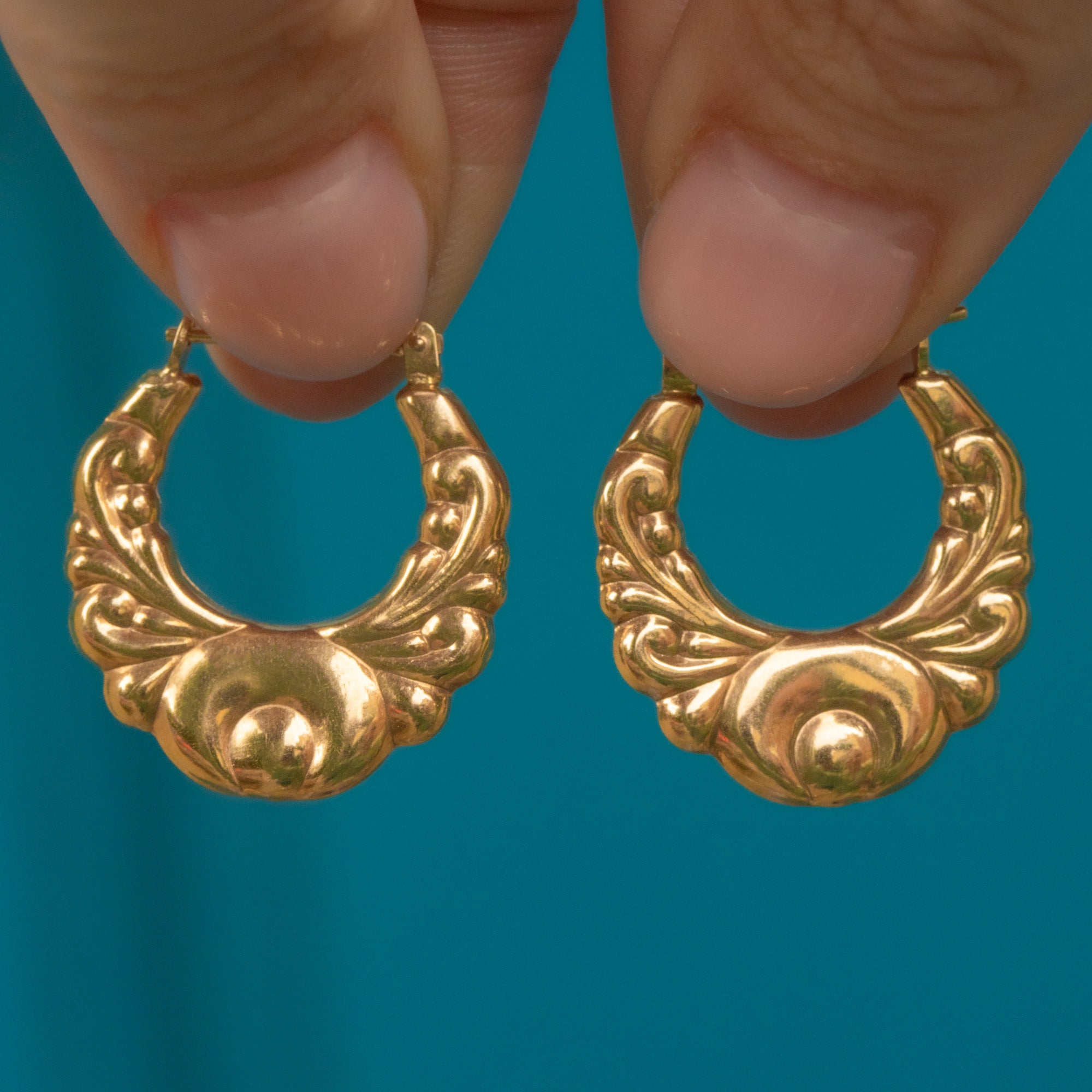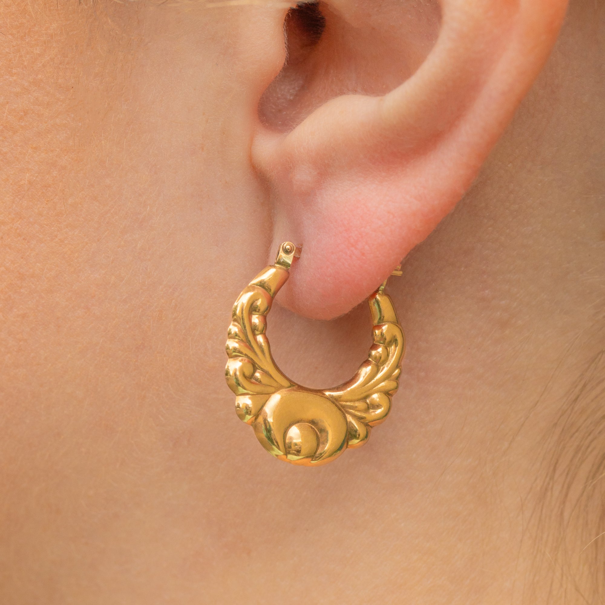 These vintage hoop earrings are crafted from buttery Gold and display intricately formed details to create an eye-catching pair. Whether worn daily as a statement or saved for special occasions, these striking Creole earrings will delight with their beautiful textured surface catching the light, even with your hair down!